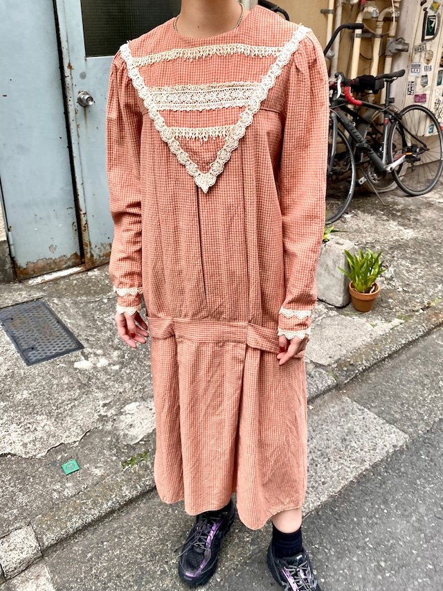 【size】11/12 【fabric】cotton 28% / polyester 22% / rayon 50% 【condition】 レースに軽度のホツレが見受けられますが、あまり気にならない程度かと思われます。 【age】80s 【memo】 大きな三角形の襟がとっておきに可愛い、80年代のワンピースです。 ピンク×ベージュのギンガムチェックに、レースの装飾やウエストのデザインがユニークでキュートな一枚。 ロング丈なので、一枚で着てコーディネートが完成するのが嬉しいですね。 印象を変えるなら、着用写真のように上からスウェットやカーディガンなどを重ね襟を出した着こなしもおすすめ。 襟を活かしたレイヤードスタイルも楽しめる一枚です。 【exact size】 着丈 117cm 肩幅 37cm バスト 約102cm ウエスト 約108cm ヒップ 約104cm 袖丈 61cm 【model's tall】160cm 【attention】 こちらのアイテムは、ご注文時に配送方法が『ヤマト運輸』か『レターパックプラス』かお選び頂けます。 『レターパックプラス』をお選びいただいた場合送料は全国一律600円とお安くなりますが、配送日が選べずポスト投函となります。 また商品によっては、梱包がタイトになってしまったりする可能性もございますのである程度のご理解をお願い致します。 さらに運送に関するトラブルの補償対象外でございますので、ご了承くださいませ。