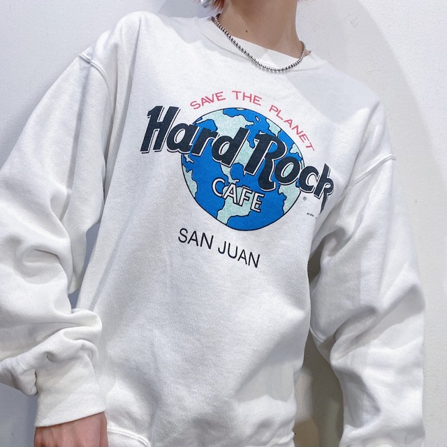 【size】MEDIUM 【fabric】cotton 50% / polyester 50% 【condition】 軽度のヨゴレが見受けられます。 【age】90s 【memo】 アメリカにあるサンフアンという都市のハードロックカフェのスーベニアスウェットです。 ホワイトボディでコーディネートに取り入れやすい一枚。 スウェットメインの着こなしはもちろん、ジャンパーワンピースなどのインナーにもおすすめ。 インナーにサーマルやロンT、ハイネック、ブラウスなどをレイヤードしたスタイルも可愛いです。 柄アイテムとも相性良く着られるので、持っておくと何かと使える一枚ですよ。 【exact size】 着丈 63cm 肩幅 51cm バスト 112cm ウエスト 110cm 袖丈 58cm 【model's tall】160cm 【attention】 こちらのアイテムは、ご注文時に配送方法が『ヤマト運輸』か『レターパックプラス』かお選び頂けます。 『レターパックプラス』をお選びいただいた場合送料は全国一律600円とお安くなりますが、配送日が選べずポスト投函となります。 また商品によっては、梱包がタイトになってしまったりする可能性もございますのである程度のご理解をお願い致します。 さらに運送に関するトラブルの補償対象外でございますので、ご了承くださいませ。