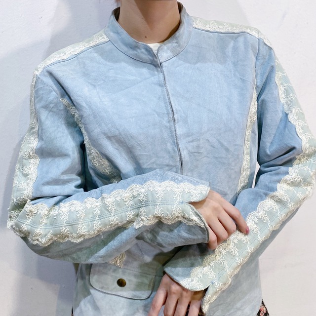 【size】S 【fabric】leather 100% 【condition】 全体的にうっすらとしたヨゴレが見受けられます。 レースのケパケパしている箇所も見受けられます。 一番下のホックの付いているところに軽度のダメージが見受けられますが、現状着用に問題はございません。 【age】90s 【memo】 9/26インスタライブ 166cmはるか着用 サックスブルー×レースのデザインが最高に可愛い、レザージャケットです。 レザーなのにこの色味とレースなのがとても珍しい一枚。 ボタンやジップではなくフックで、前を閉めた時に金具が見えないところもこだわりを感じますね。 スタンドカラーにポケット付きな所も魅力的です。 真っ白なスカートに合わせたり、デニムと合わせても決まりますよ。 【exact size】 着丈 55cm 肩幅 42cm バスト 102cm ウエスト 94cm 袖丈 59cm 【model's tall】160cm