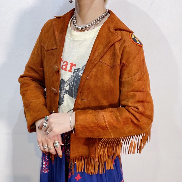 【size】-- 【fabric】leather 【condition】 一番下のボタンのみ他のボタンと異なるものが付いております。 全体的にヨゴレやキズが見受けられます。 軽度のダメージやフリンジの取れている箇所も見受けられます。 裏地にもヨゴレやキズが見受けられます。 いずれもヴィンテージ特有のアジや雰囲気として捉えていただけたらと思います。 【age】50s 【memo】 9/26インスタライブ 155cmあや着用 50年代のウエスタンレザージャケットです。 柔らかく質のいいブラウンレザーに、たっぷりついたフリンジがたまらない一枚。 コンパクトなサイズ感が可愛くてバランス良く着れますよ。 無地なので柄物とも相性良いですし、着用写真のように柄スカートやランチパンツを合わせた50sスタイルもおススメ。 このサイズ感は珍しく、小柄な方にもヴィンテージレザーをお探しの方にも、大変おススメの逸品です。 【exact size】 着丈 約55cm(フリンジ込み) 肩幅 39cm バスト 88cm ウエスト 76cm 袖丈 48cm 【model's tall】cm