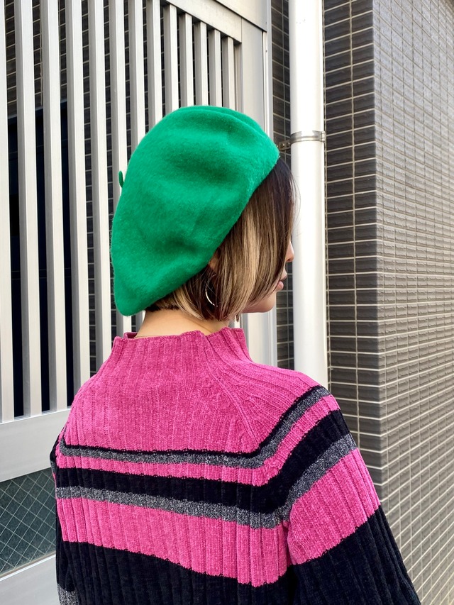 【size】-- 【fabric】wool100% 【condition】 所々に若干薄くなっている場所がありますが、どれも小さくあまり目だないかと思います。 【age】90s 【memo】 大きめサイズがパンクで可愛いベレー帽です。 上質なウール素材なので暖かく、フェルトのような生地感で被ると秋冬感が出て良いですよ。 ぱっきりとしたグリーンカラーがコーディネートのアクセントになります。 丸い角の形のままかぶったり、くしゅっとして形を変えて被ったりなどして楽しめます。 無地なので柄物のコーディネートにも取り入れやすく、差し色にもぴったりですよ。 【exact size】 縦横 約30.5cm(平置きで) ハチ周り 約60cm 【model's tall】166cm 【attention】 こちらのアイテムは、ご注文時に配送方法が『ヤマト運輸・通常配達』か『ヤマト運輸ネコポス』かでお選び頂けます。 『ネコポス』をお選びいただいた場合送料は全国一律180円とお安くなりますが、配送日が選べずポスト投函となります。 また商品によっては、梱包がタイトになってしまったりする可能性もございますのである程度のご理解をお願い致します。 さらにお荷物の紛失・破損に対する引受限度額は3,000円(税込)となります。