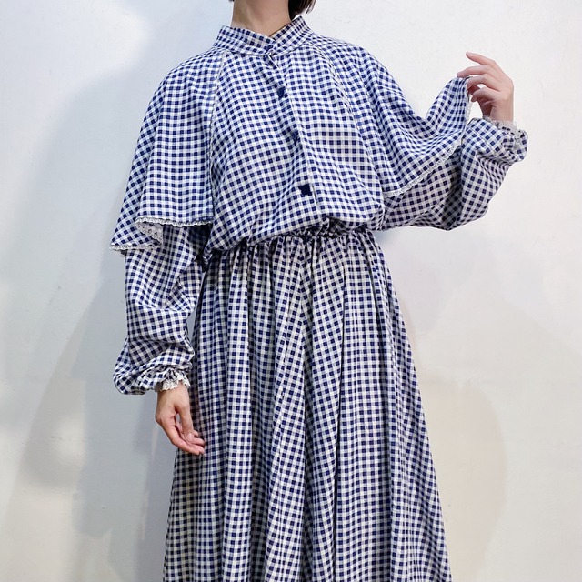【size】-- 【fabric】cotton / polyester 【condition】 ダメージではございませんが、ボタンは飾りボタンで裏にマジックテープが付いております。 スカートの裾には、うっすらとしたシミやヨゴレが見受けられます。 【age】s 【memo】 ネイビー×ホワイトのギンガムチェックが可愛い、セットアップです。 トップスもスカートもたっぷりの生地を用いて作られており、そのボリューム感がとってもキュート。 トップスはケープのようなデザインに、ぽわんとした袖、ショート丈な丈感が可愛く、デザイン性が見受けられます。 スカートも綺麗なAラインシルエットに、ウエストはゴムでデイリーに楽ちんに着ていただけますよ。 セットでの着用はもちろん、別々でもそれぞれが使い勝手良さそうなアイテムです。 【exact size】 --TOP-- 着丈 43cm 肩幅 62cm バスト 144cm ウエスト 76~130cm(ゴムの為伸びます) 袖丈 62cm --SKIRT-- 着丈 95cm ウエスト 56~96cm(ゴムの為伸びます) 【model's tall】166cm