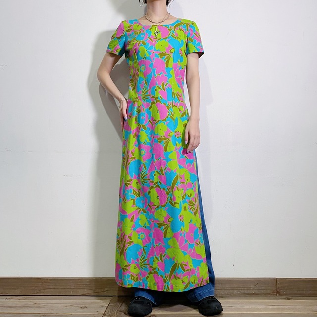 【size】-- 【fabric】cotton 【condition】 うっすらとしたヨゴレや軽度のキズが見受けられますが、あまり気にならない程度かと思われます。 ハンドメイド感も見受けられますが、着用に問題はございません。 【age】60s 【memo】 グリーンやピンク、ブルーの色合わせが可愛い、60年代の花柄ワンピースです。 こちらはサイドに深めのスリットが入っており、デザイン性のある一枚。 シェイプされたウエストにロング丈で、スタイル良く着ていただけますよ。 下に重ねるパンツやスカート次第で印象を変えて楽しめるのが良いですね。 コットン地でデイリーに着こなしやすい一枚です。 【exact size】 着丈 129cm 肩幅 35cm バスト 92cm ウエスト 72cm 袖丈 19cm 【model's tall】160cm 【attention】 こちらのアイテムは、ご注文時に配送方法が『ヤマト運輸』か『レターパックプラス』かお選び頂けます。 『レターパックプラス』をお選びいただいた場合送料は全国一律600円とお安くなりますが、配送日が選べずポスト投函となります。 また商品によっては、梱包がタイトになってしまったりする可能性もございますのである程度のご理解をお願い致します。 さらに運送に関するトラブルの補償対象外でございますので、ご了承くださいませ。