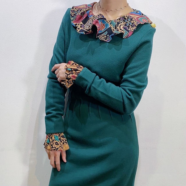 【size】S 【fabric】acrylic 70% / wool 30% 【condition】 特に目立ったシミやダメージはございません。 【age】80s 【memo】 こっくりとしたグリーンに肩に並んだゴールドのボタンが可愛い、ニットワンピースです。 シェイプされたウエストや、程良く体にフィットするデザインが綺麗な一枚。 着用写真のようにインナーにブラウスやハイネックなどをレイヤードしたスタイルもおすすめです。 足元はタイツや靴下で遊んだり、ロングブーツと合わせたり、パンツなどを重ねてもまた違った印象で楽しめますよ。 柄アイテムとも相性良く着られますし、大人っぽい印象のニットワンピースです。 【exact size】 着丈 105cm 肩幅 40cm バスト 88cm ウエスト 72cm 袖丈 62cm ※ニットのため伸縮性あり 【model's tall】166cm