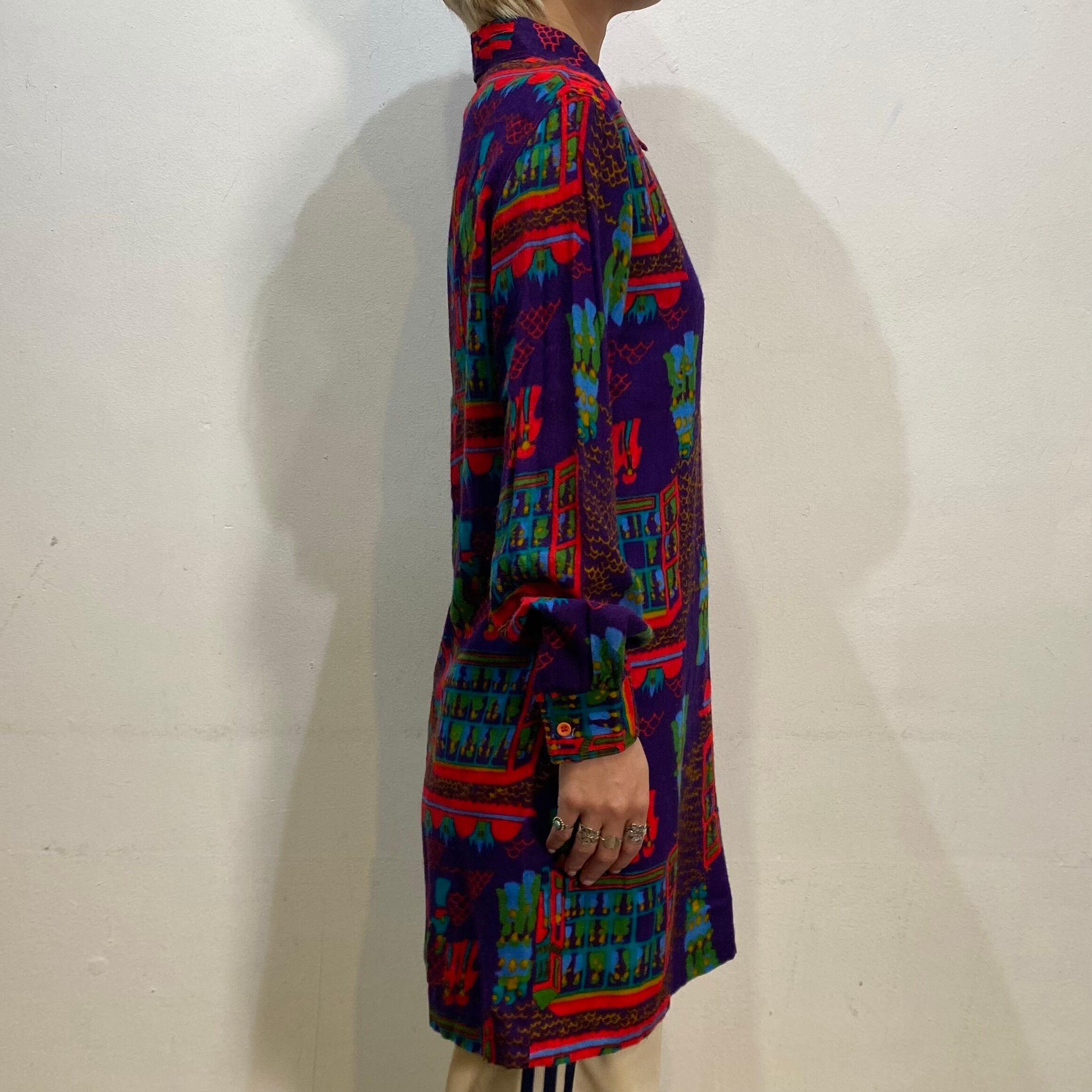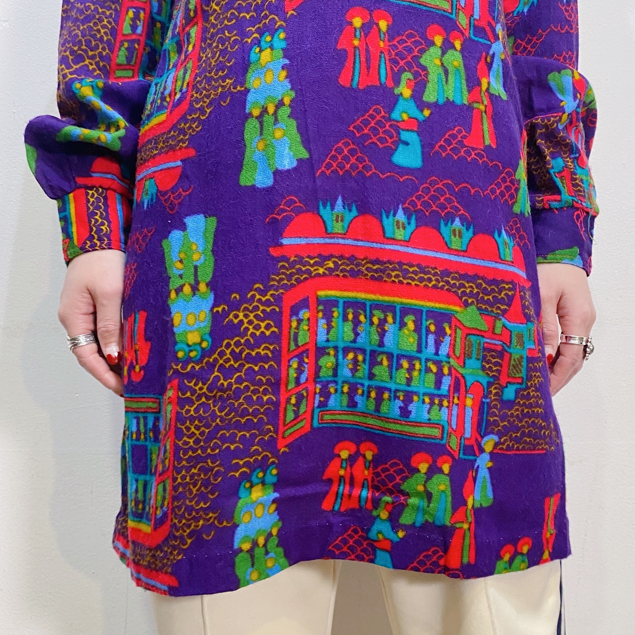 ターバンを巻いたアラブな人々や建物のプリントが古着らしくて可愛い、70年代の長袖シャツです。