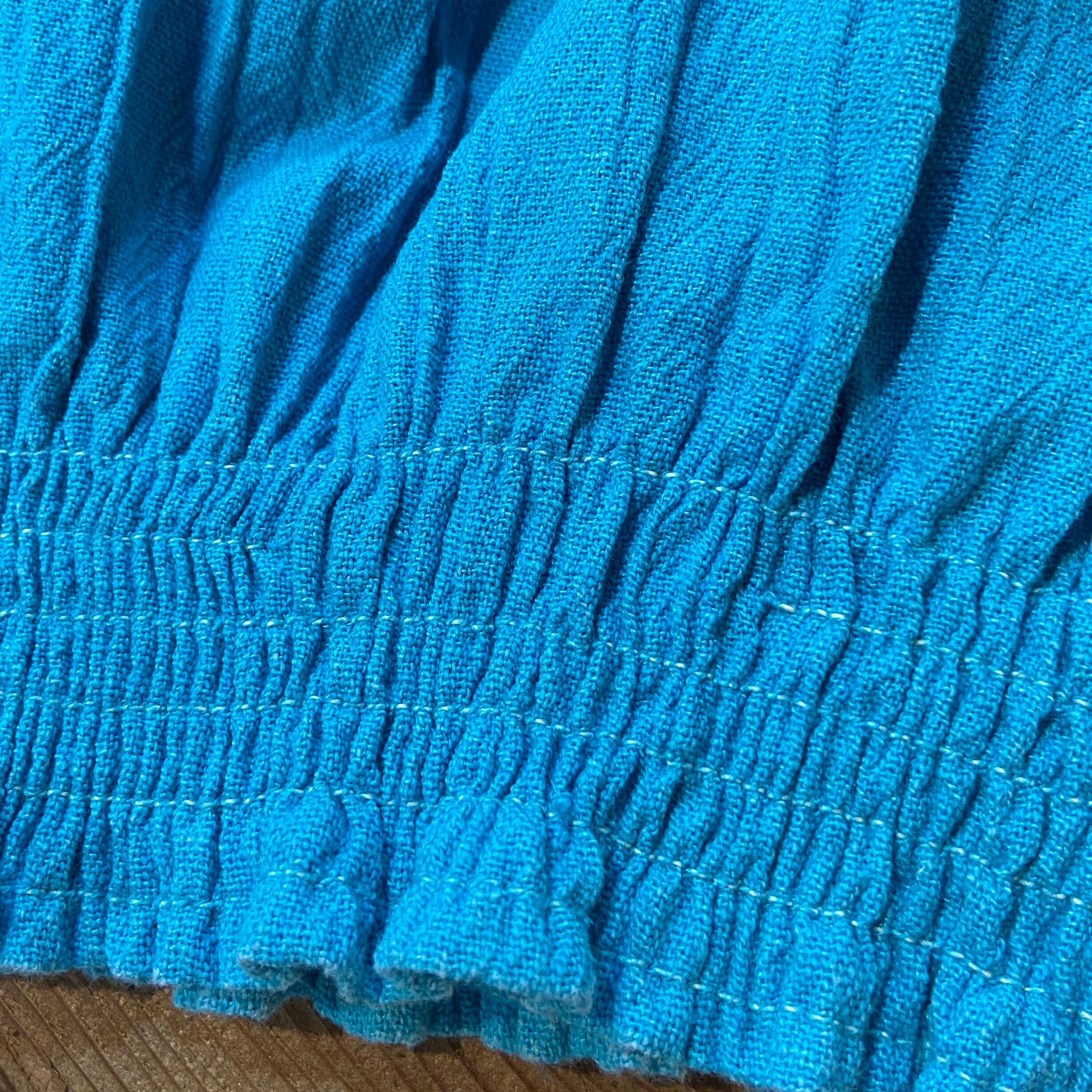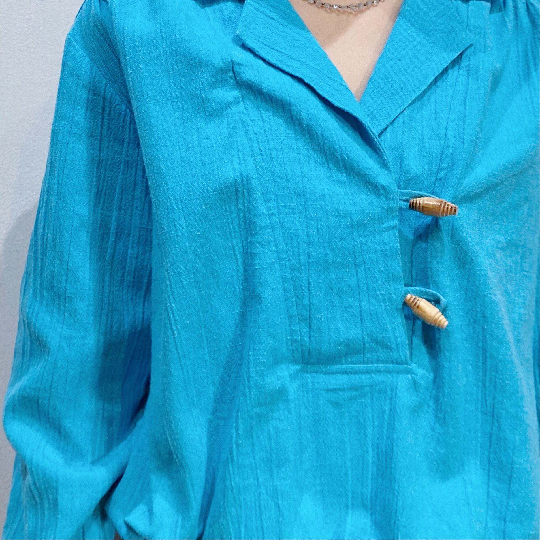 色鮮やかなターコイズブルーカラーが目を惹く、80~90年代頃のトップスです。