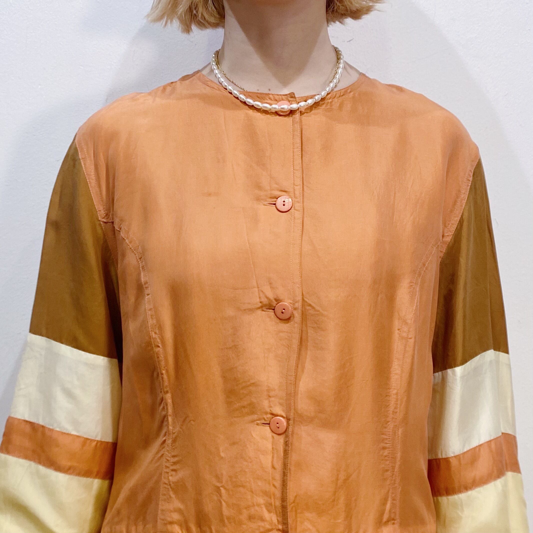 上品なサーモンピンクカラーにお袖がお洒落な、シルクトップスです。