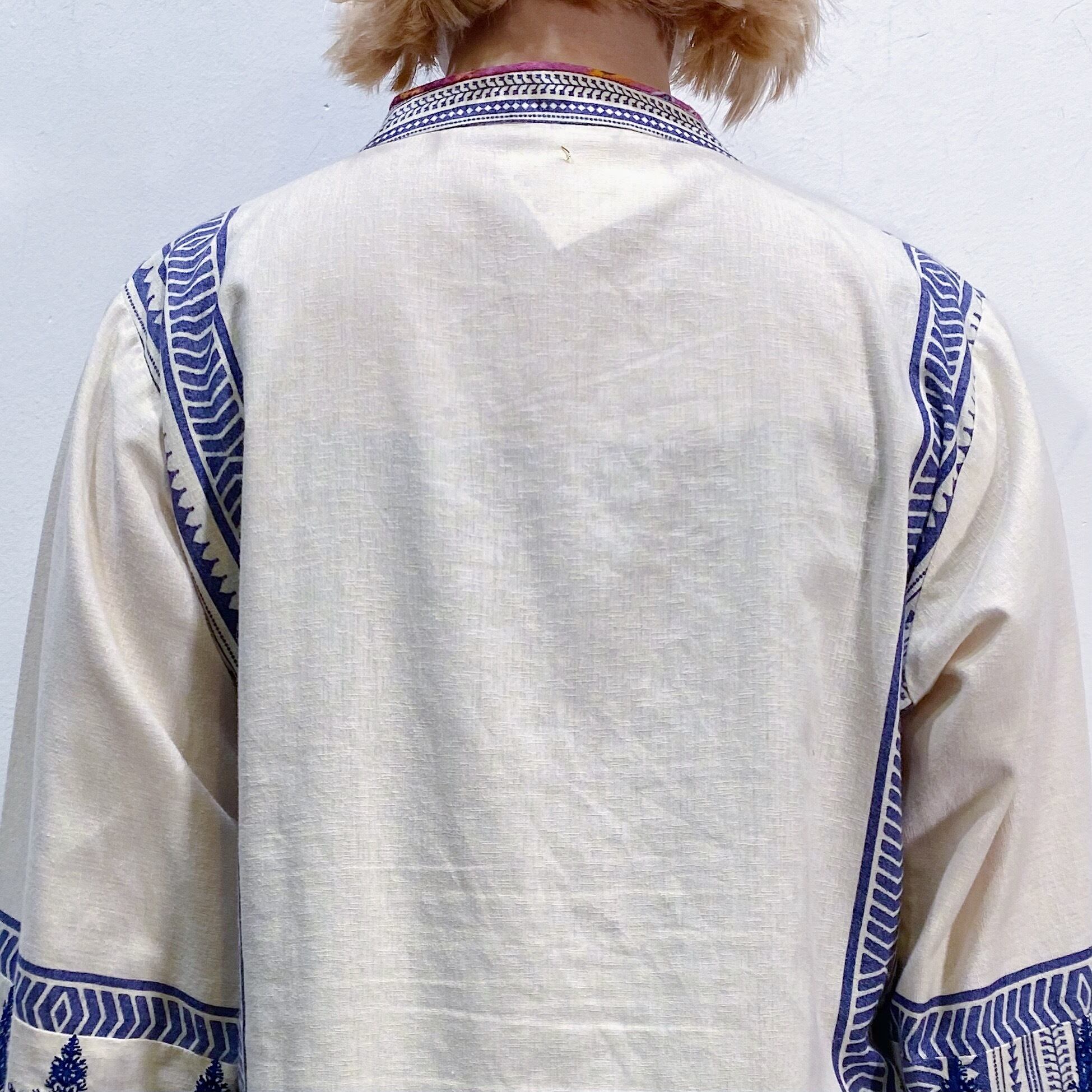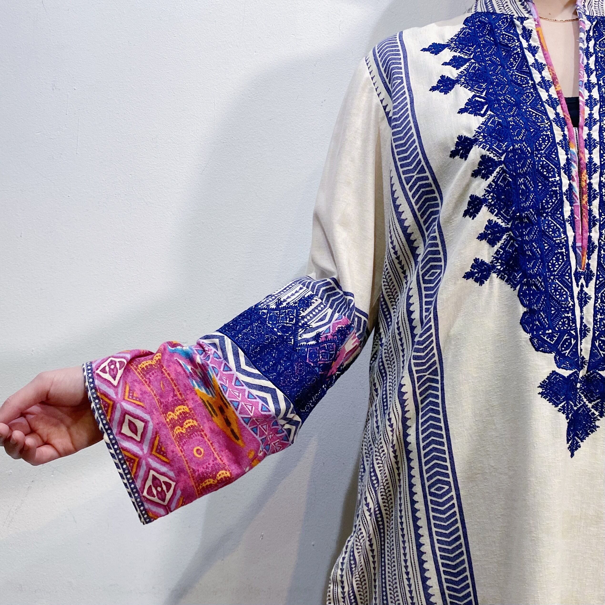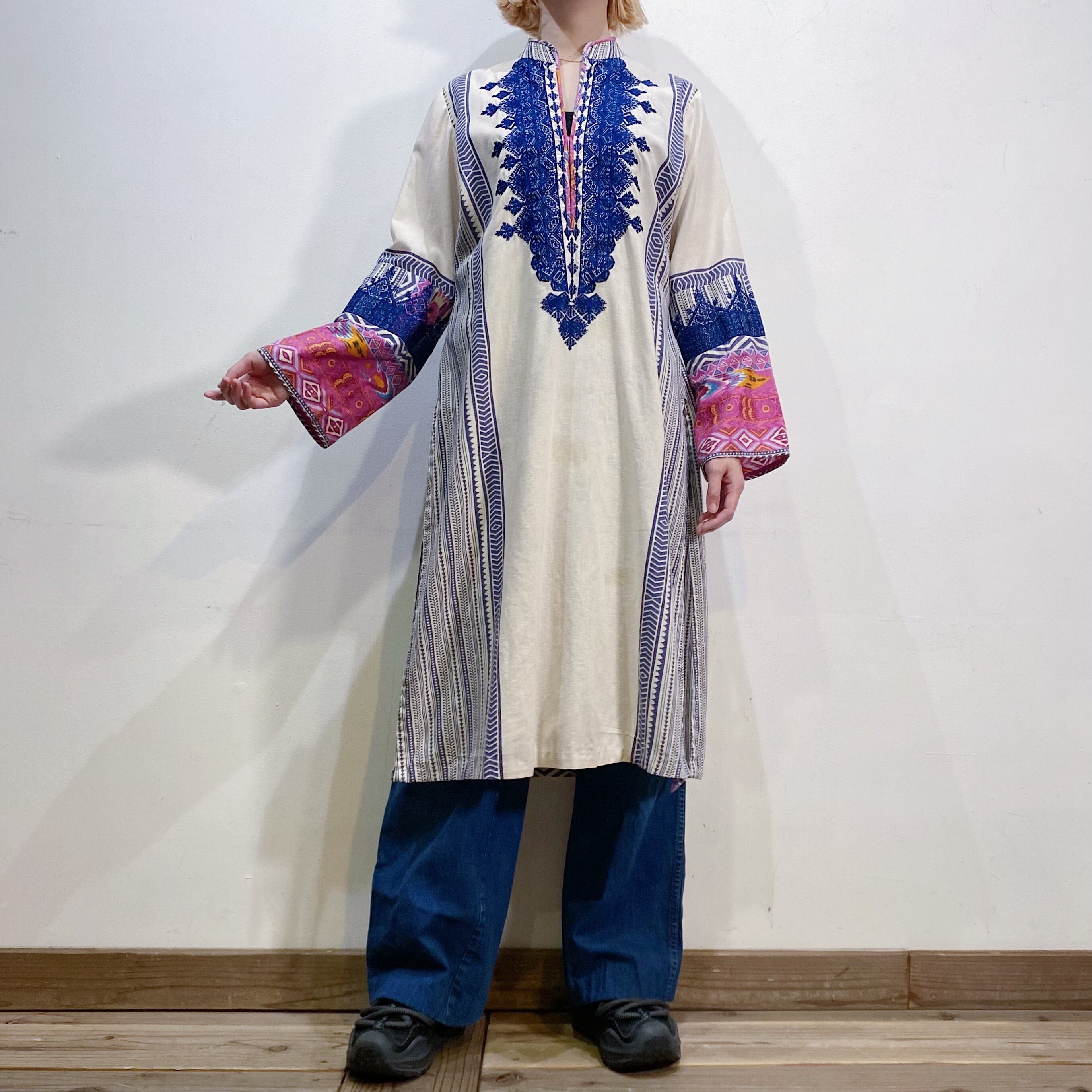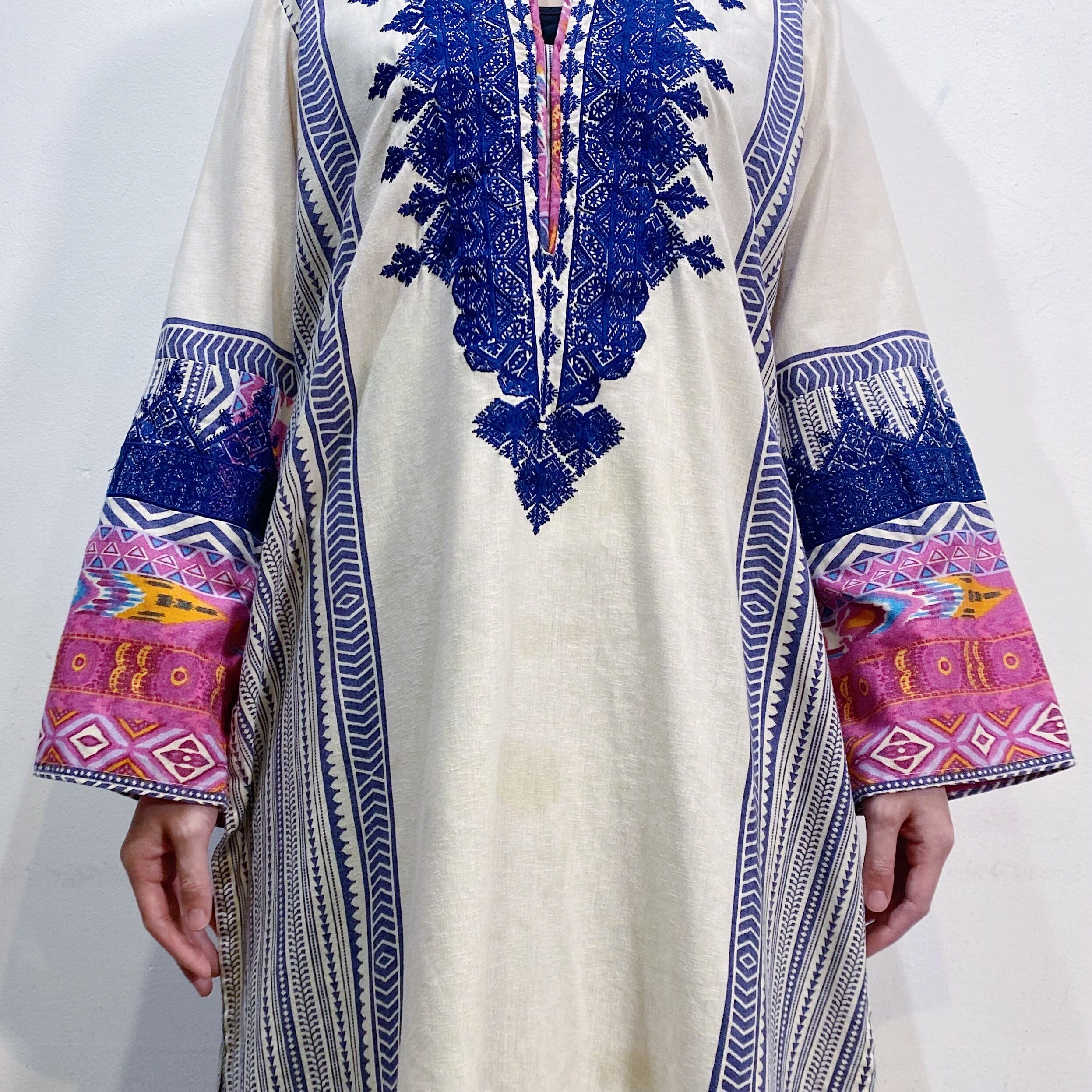 フロントとお袖の刺繍やネイティブプリントのデザインが可愛い、70年代のロングワンピースです。