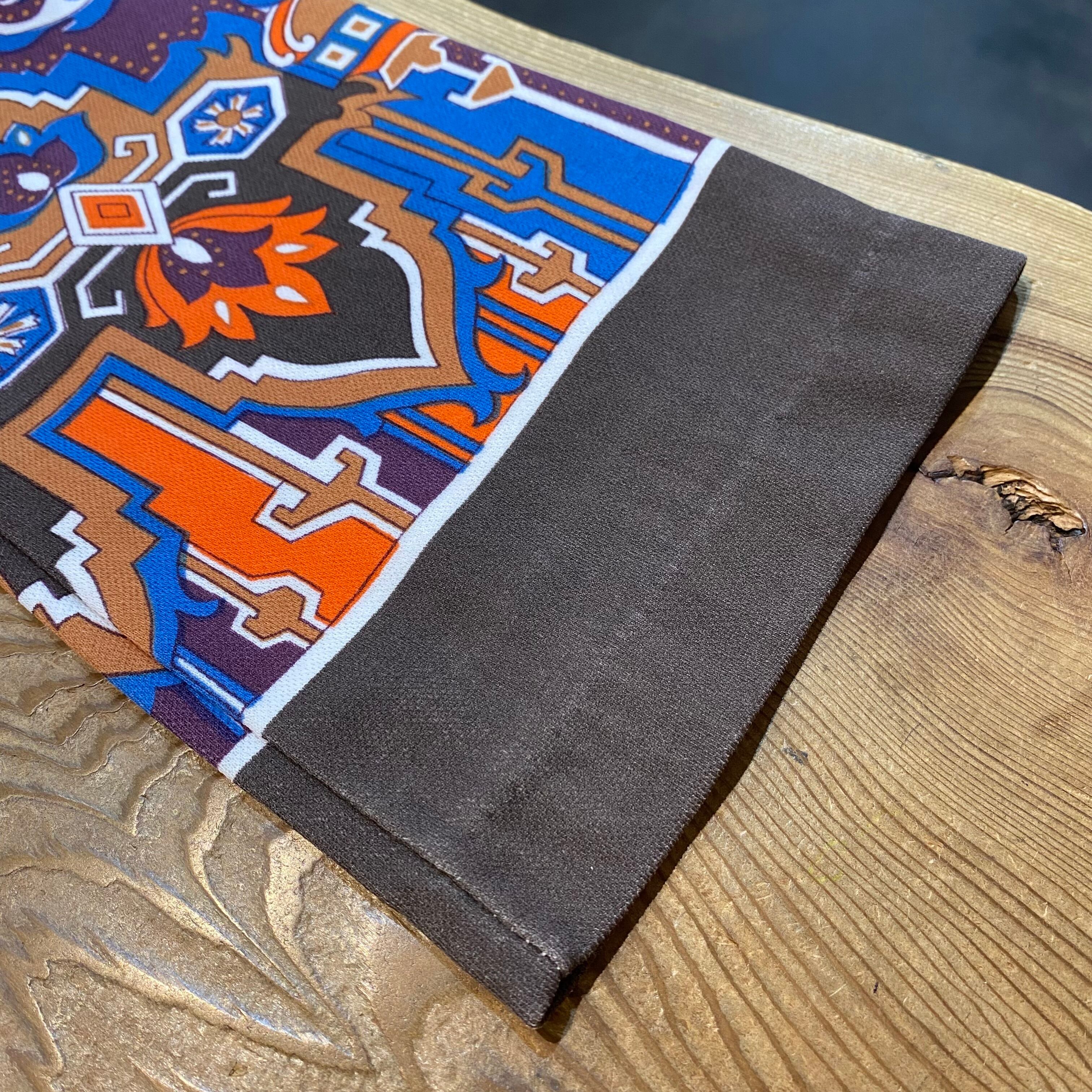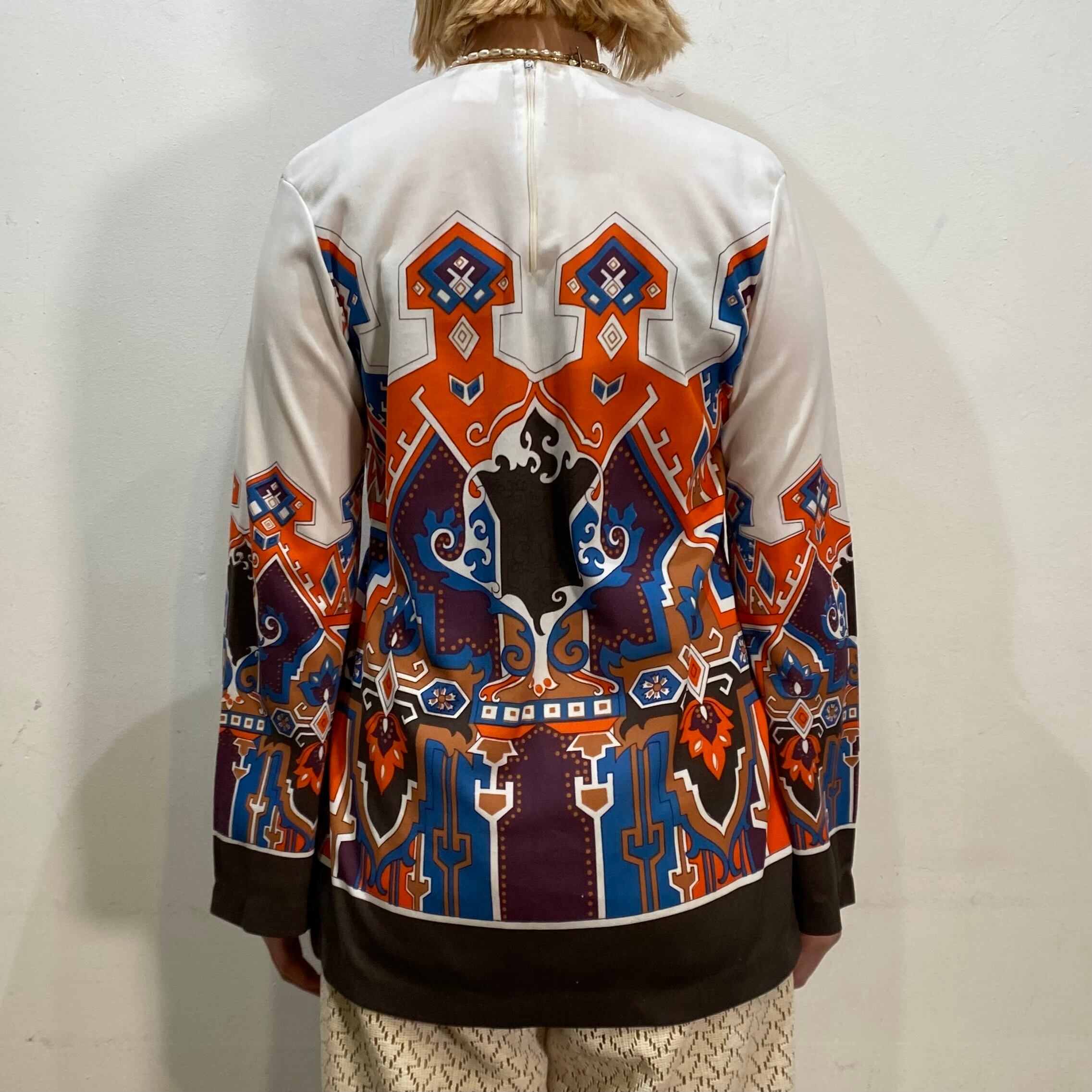 オレンジやブラウンなどのタイルのようなテキスタイルが可愛い、70年代の長袖トップスです。