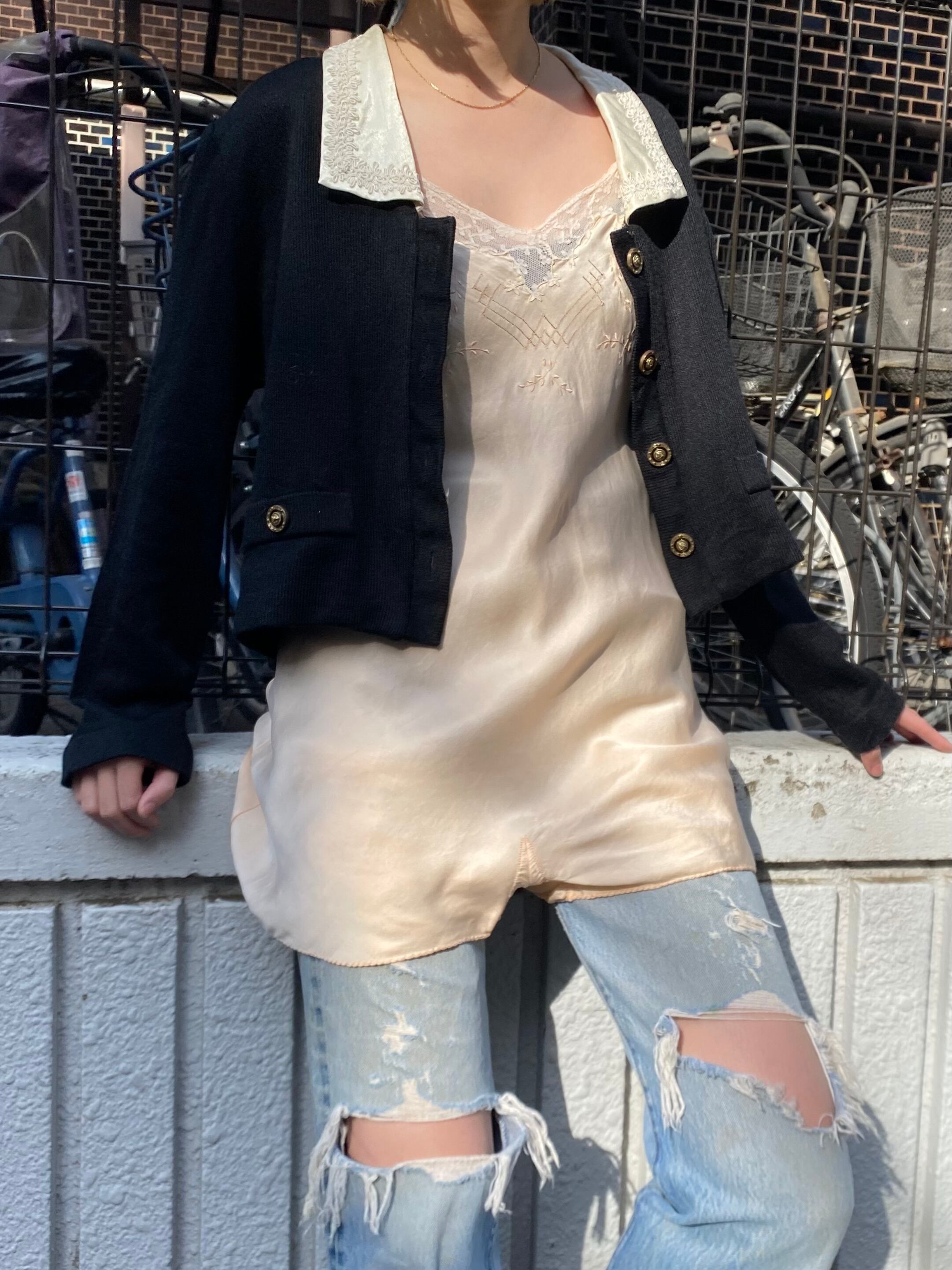 着用写真のようにクラッシュデニムと合わせるとグランジな感じで大人可愛いですし、カラーパンツやハーフパンツに合わせたりしても良さそうです。