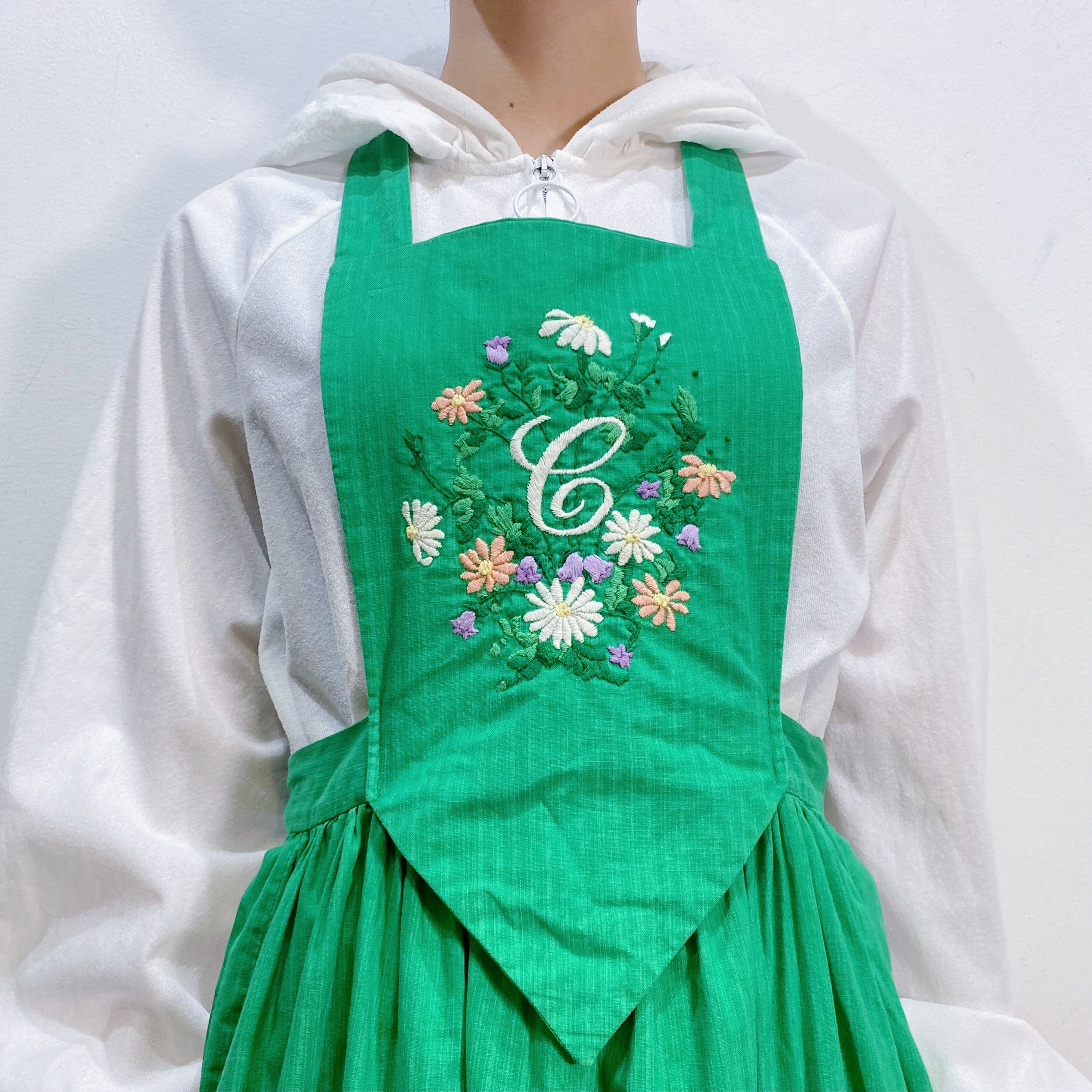 胸元のお花とイニシャルの刺繍が可愛い、70年代のエプロンワンピースです。