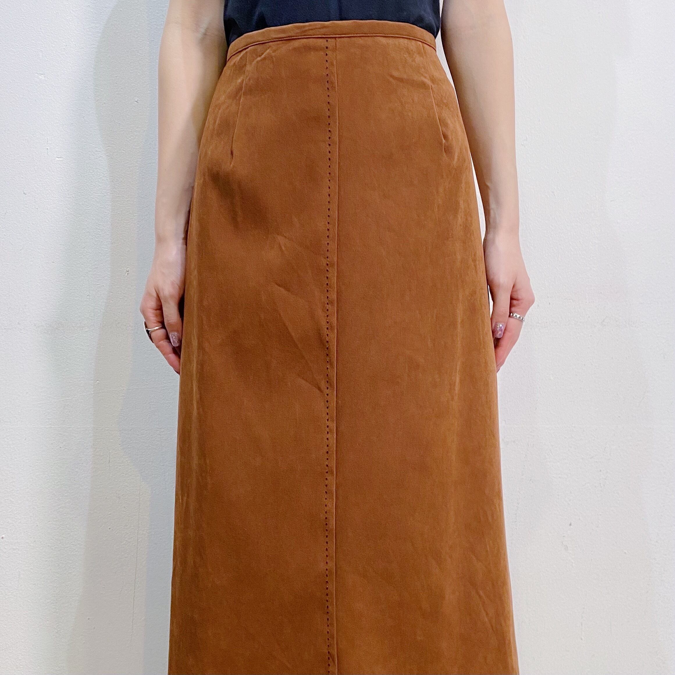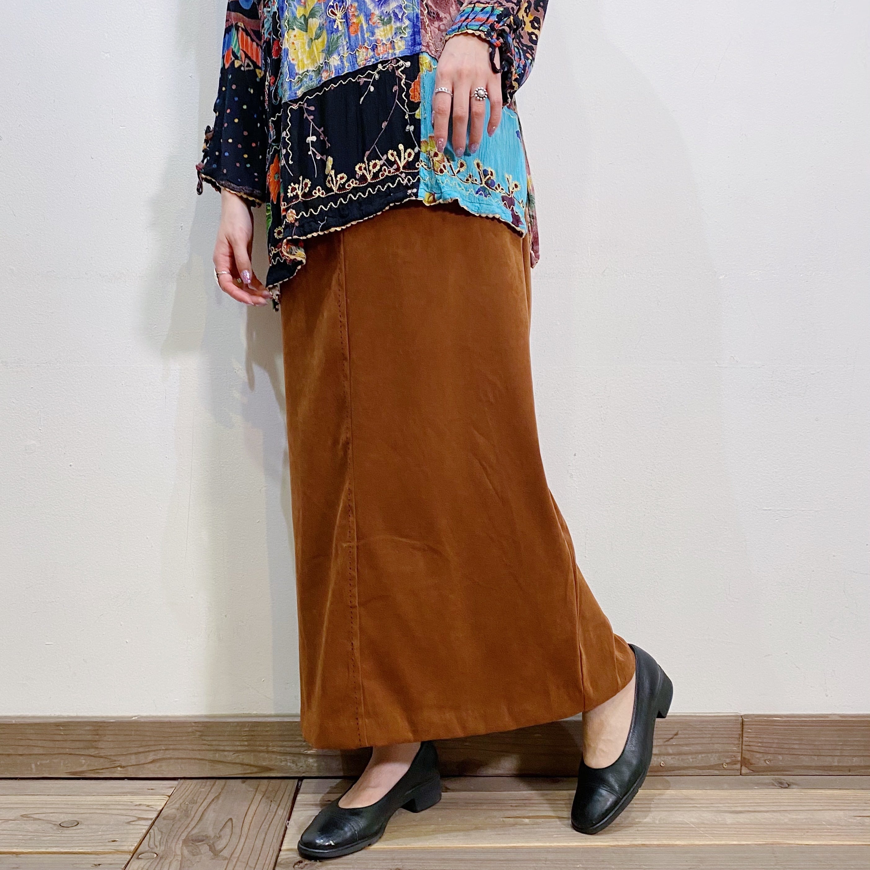 無地のこっくりブラウンカラーで大変使い勝手のいいロングスカートです。