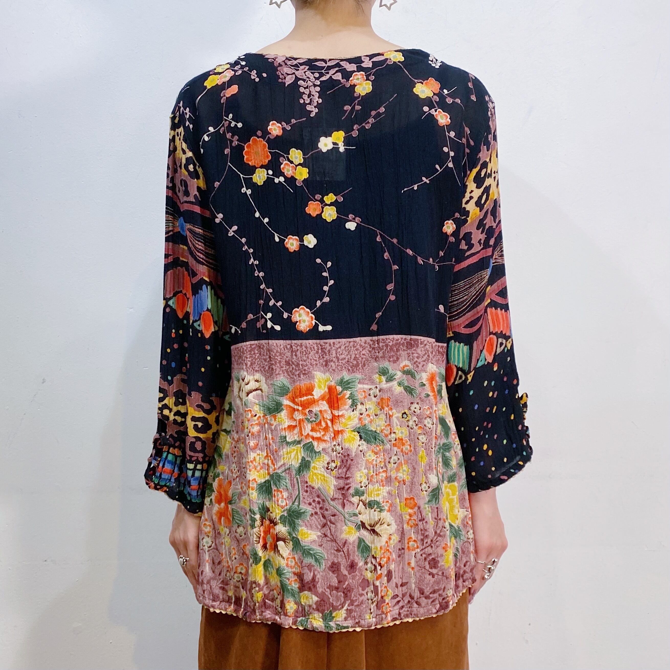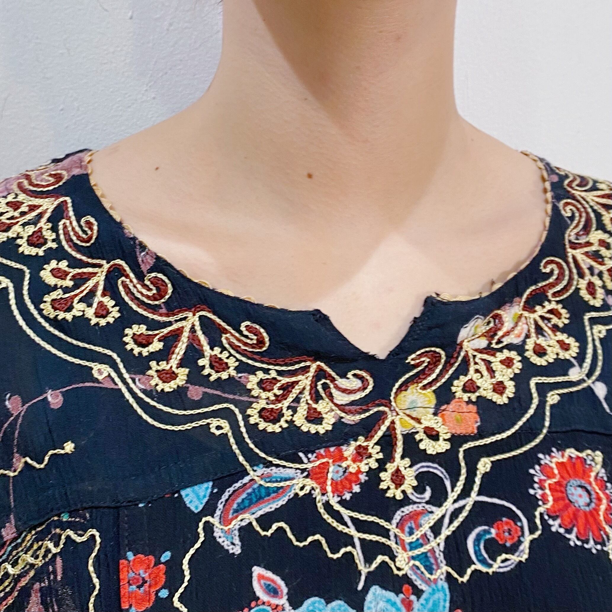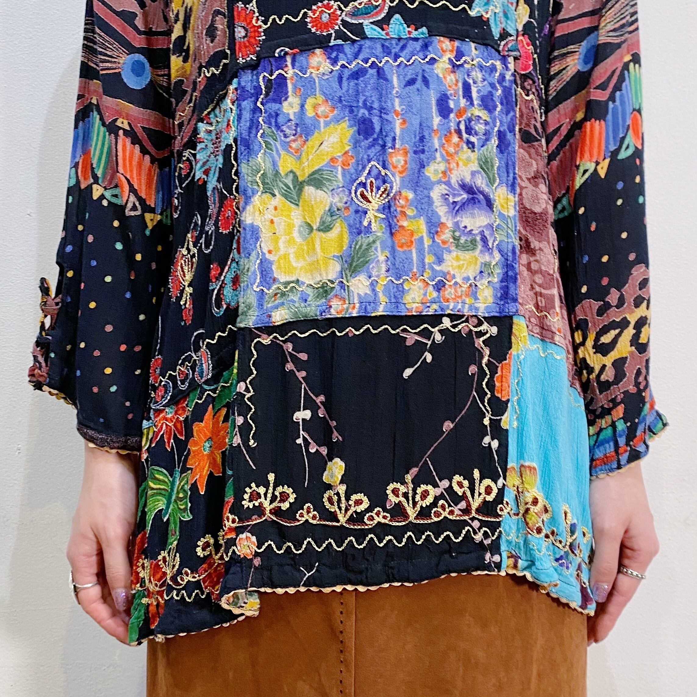 様々な柄のリアルパッチワークの上から刺繍が施されたデザインが可愛い、長袖トップスです。