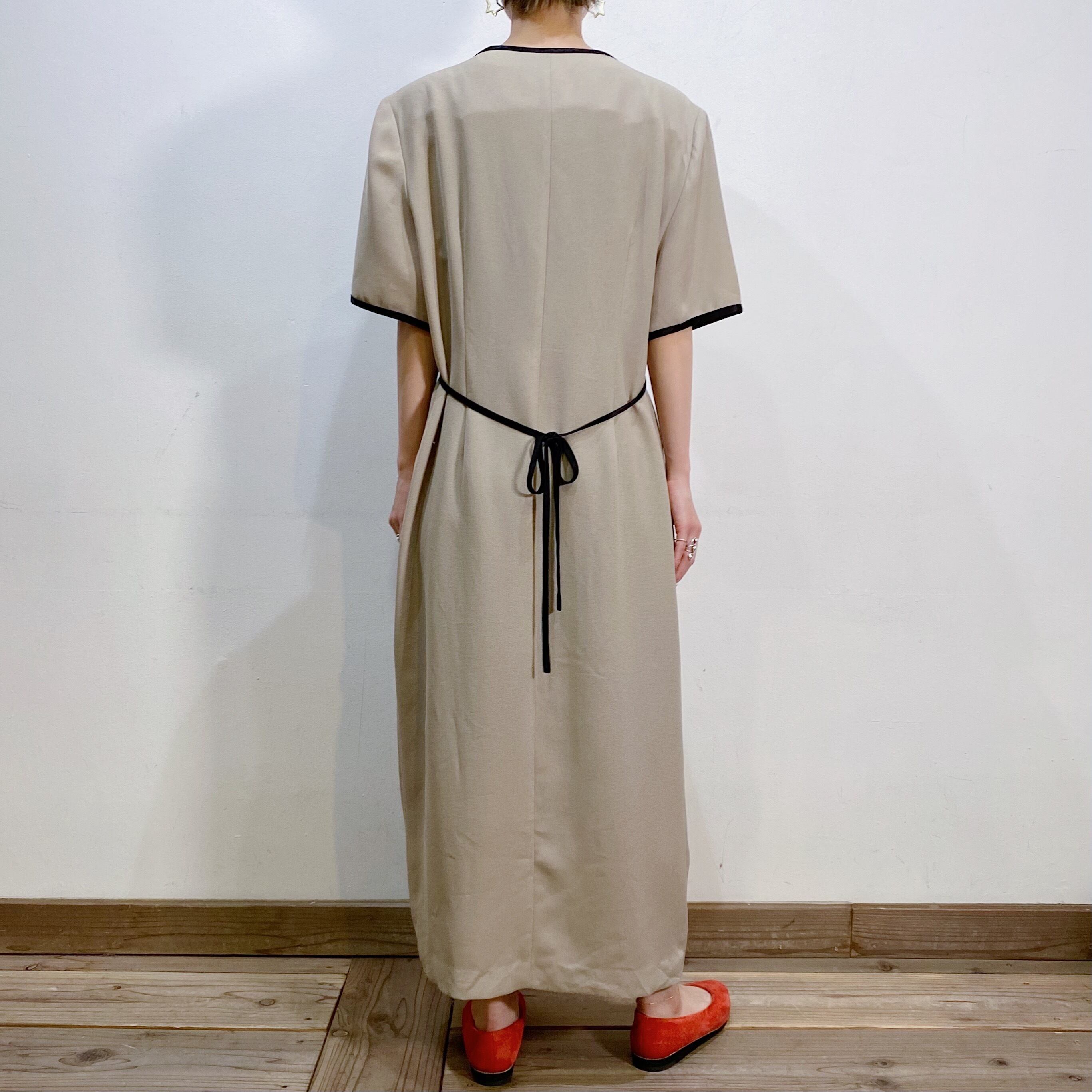 ベージュカラーにブラックのパイピングデザインが大人可愛い、80年代のロングワンピースです。