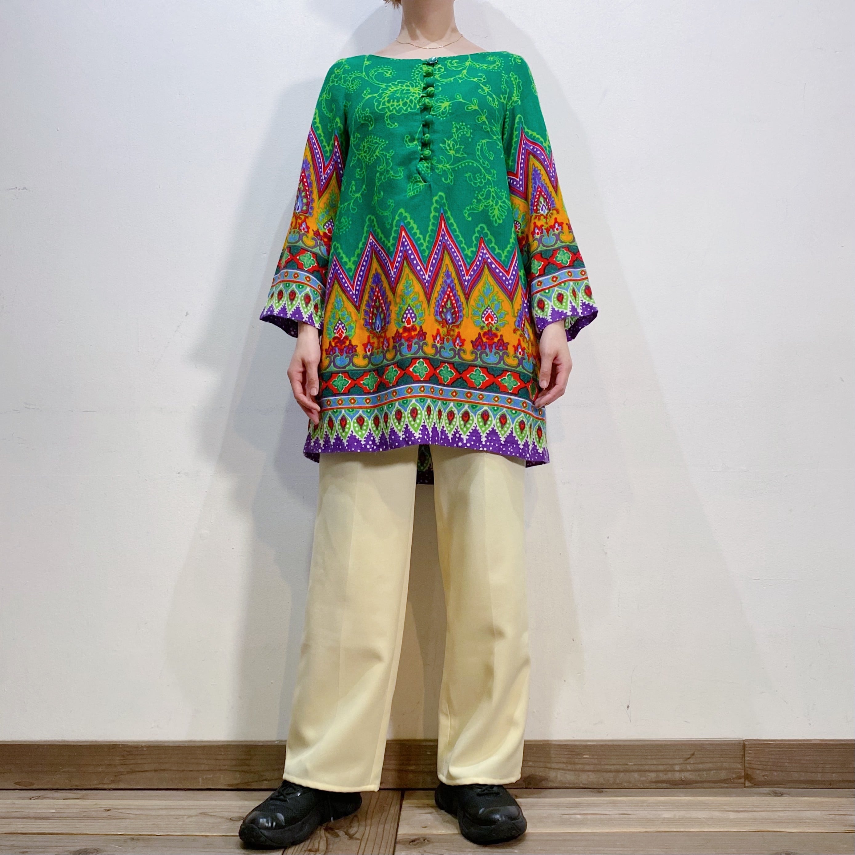 無地なので着用写真のようなヴィンテージの柄物アイテムと相性良く着ていただけますよ。
