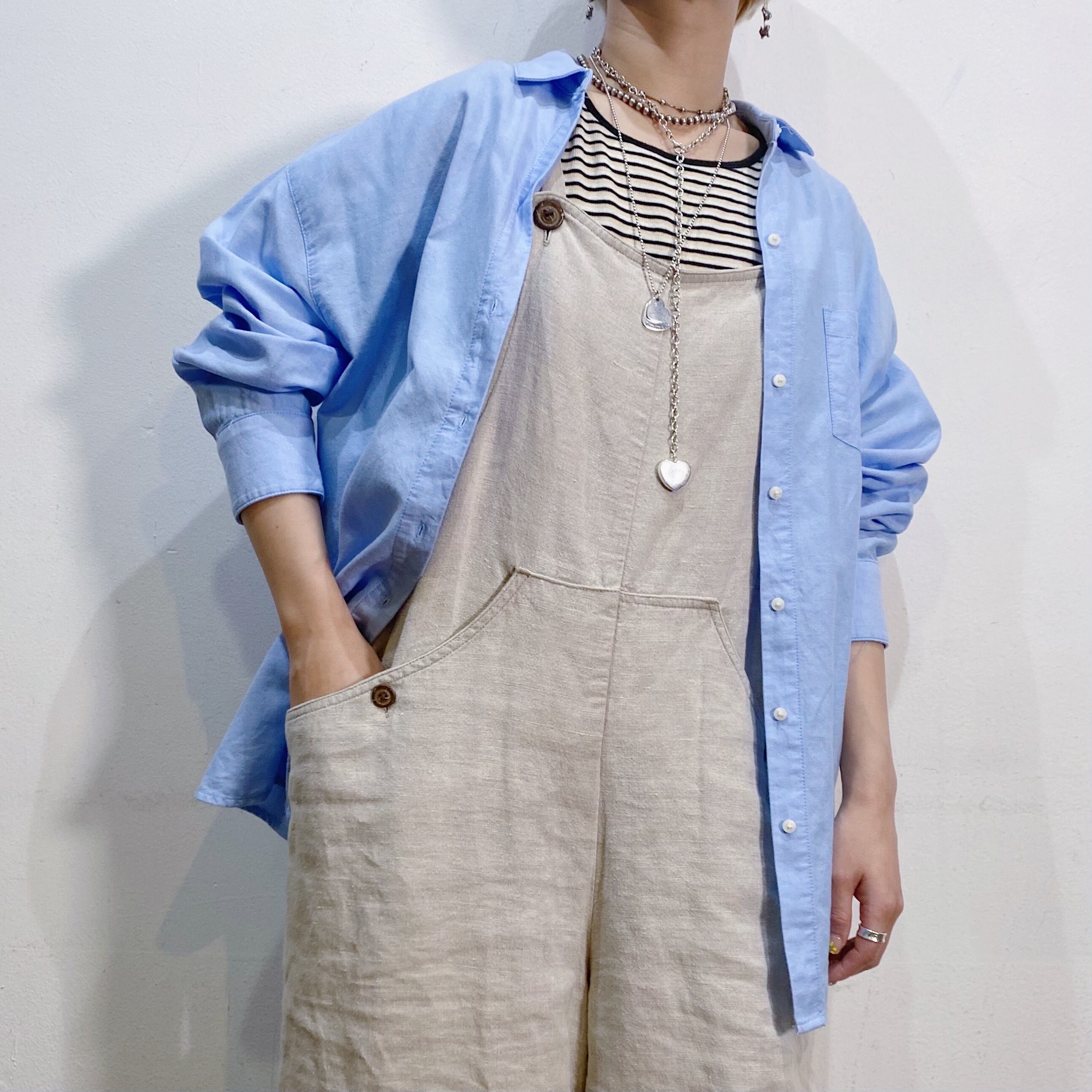 ボタンを閉めてトップスとしてはもちろん、上からベストやスウェットを重ねたり、キャミワンピースやオーバーオールなどのインナーにしても良いです。