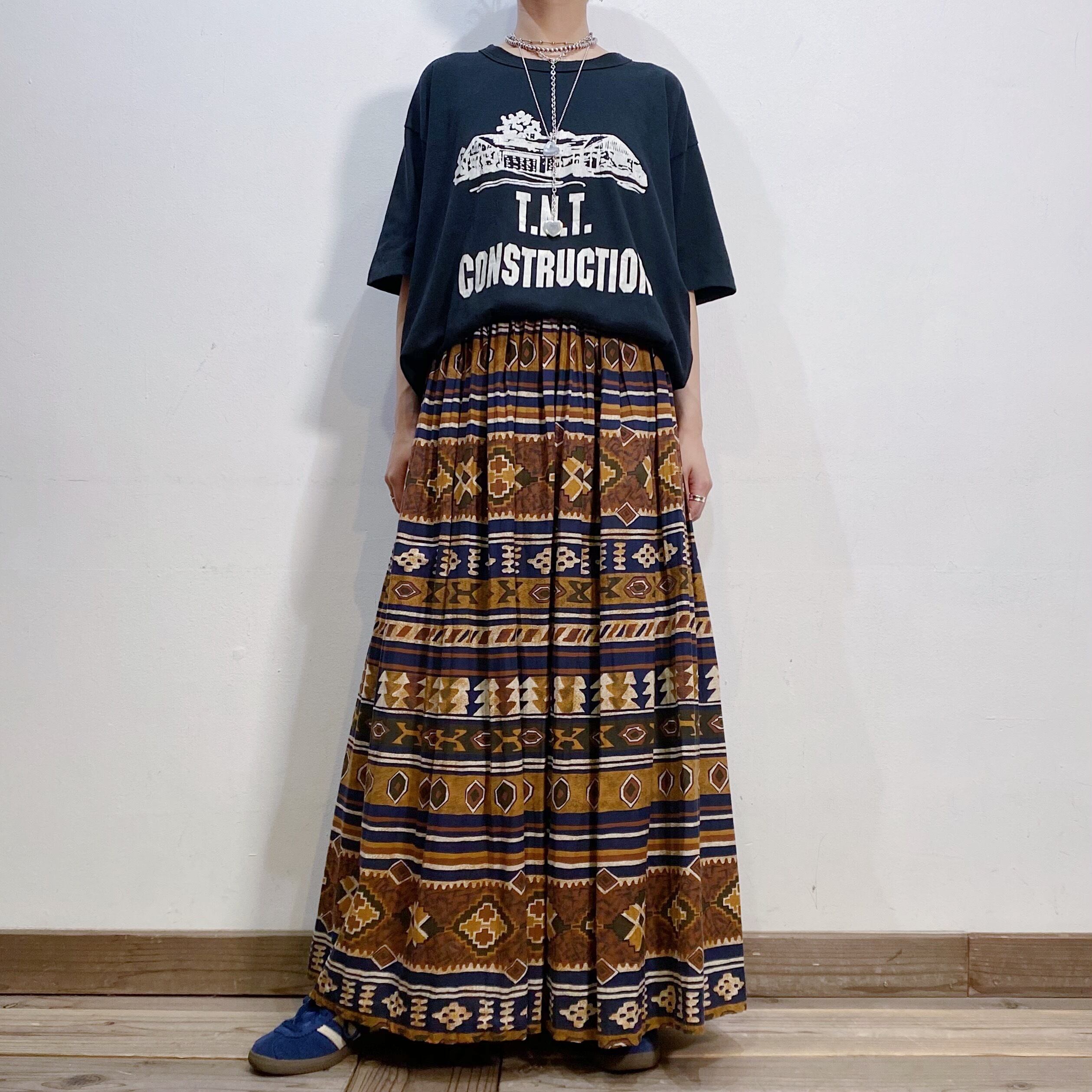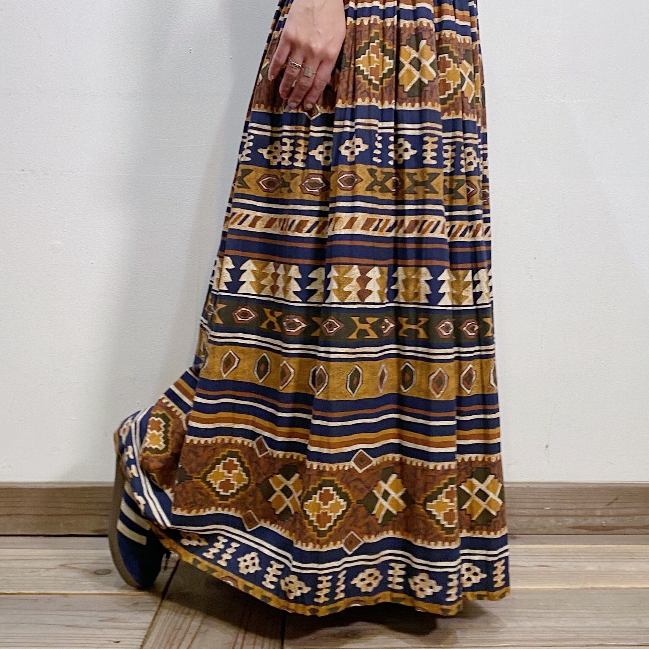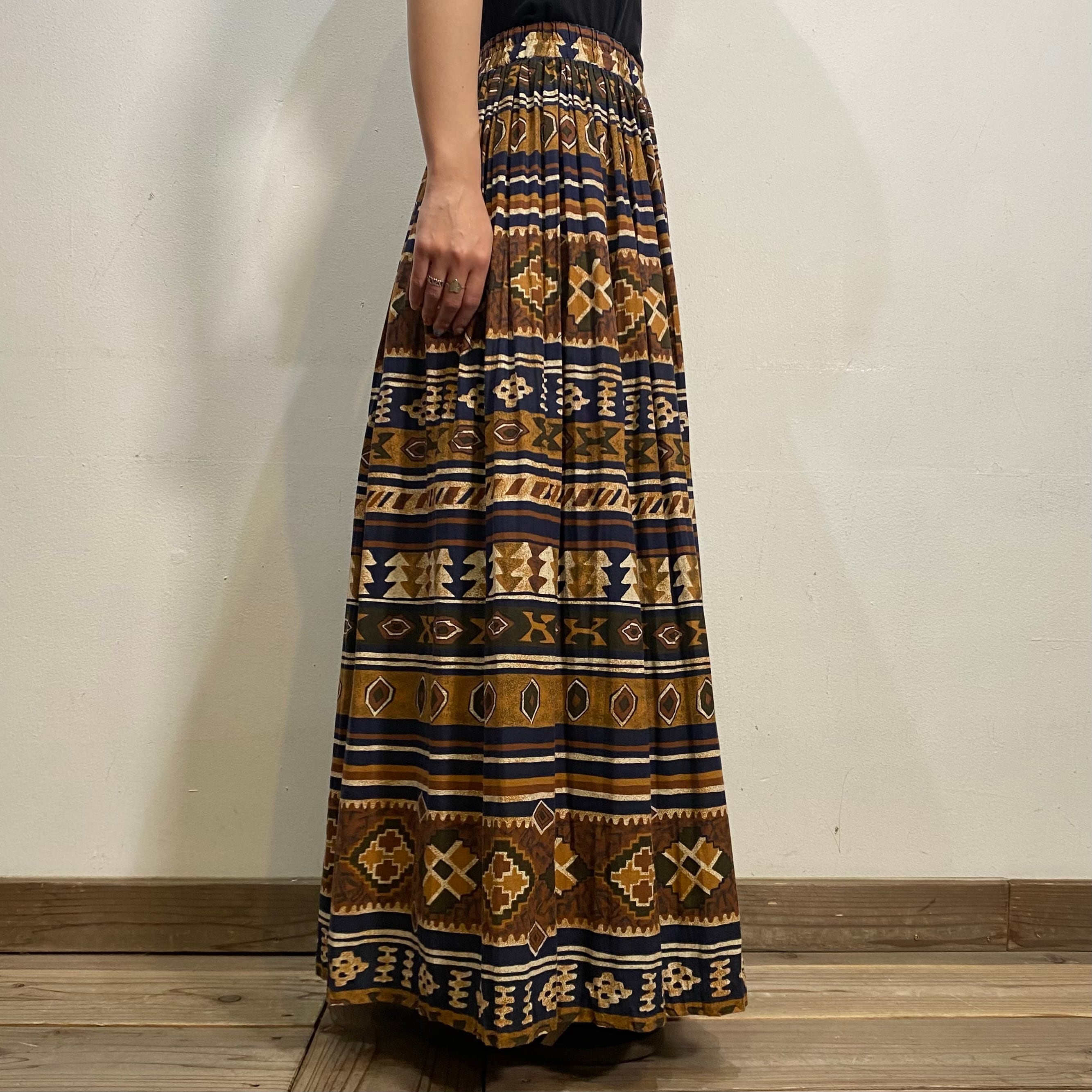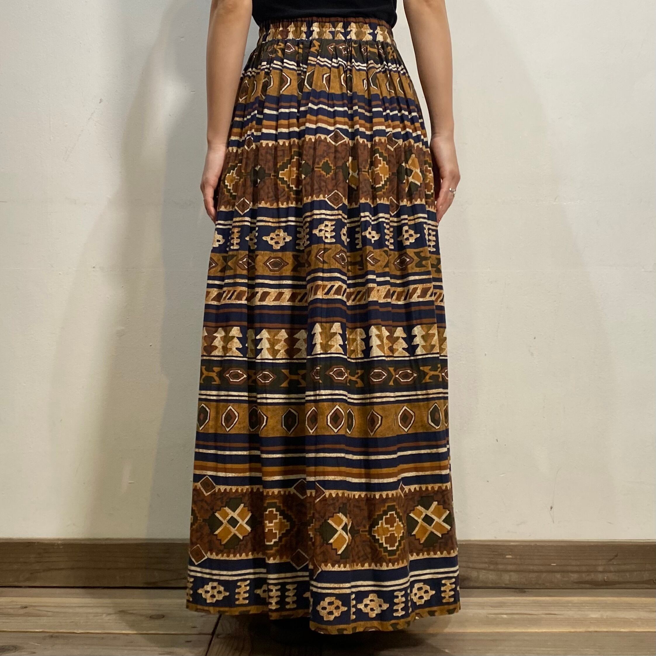 ブラウンで着こなしやすい、ネイティブ柄のロングスカートです。