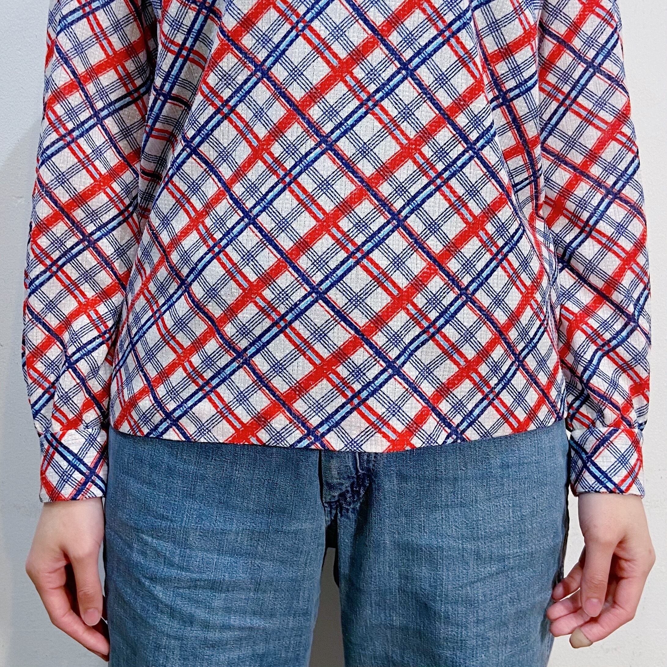赤やネイビーの色合わせが可愛い、70年代のチェック柄のトップスです。