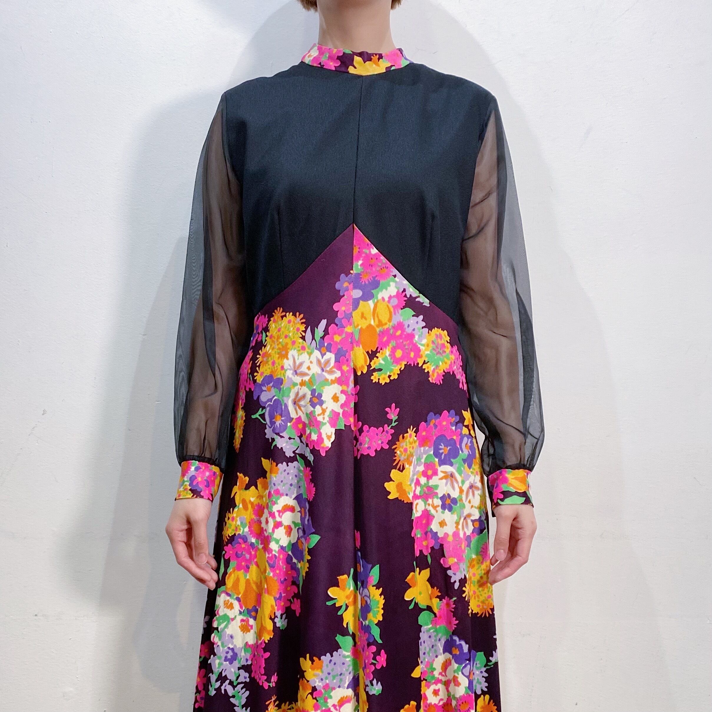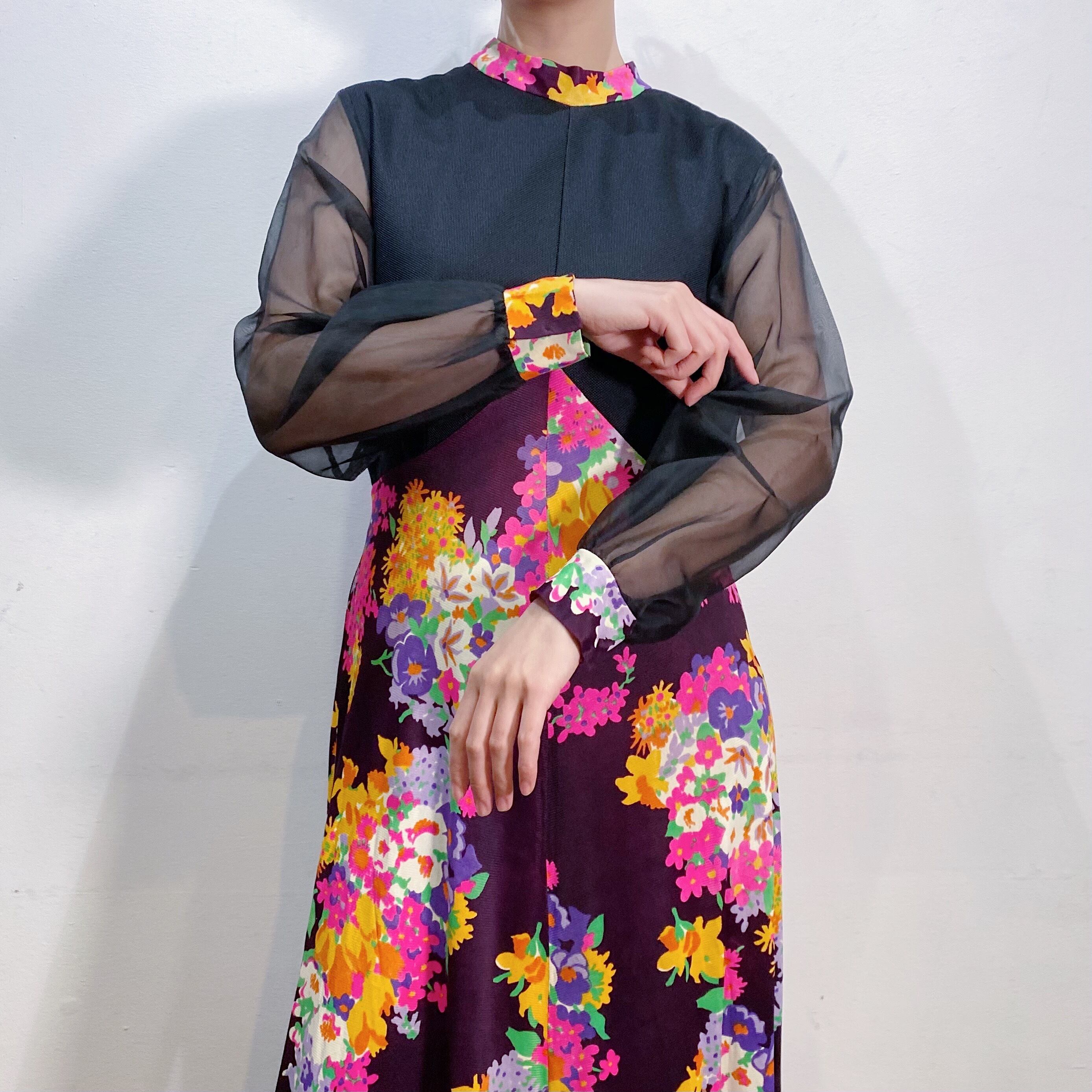 70s flower printed sheer sleeves long dress