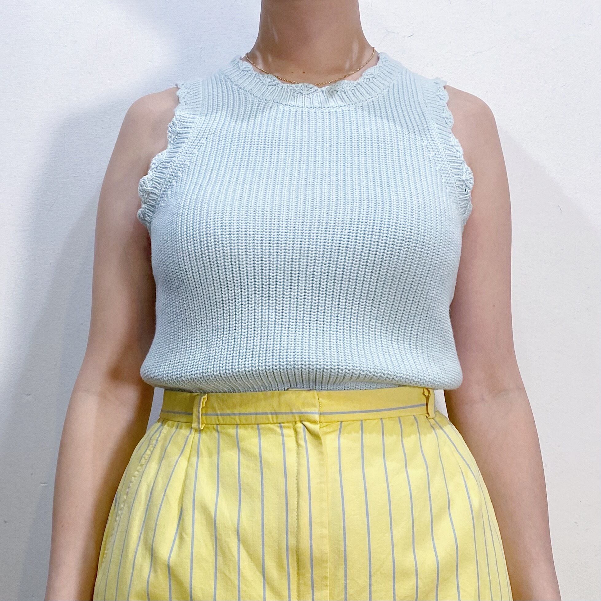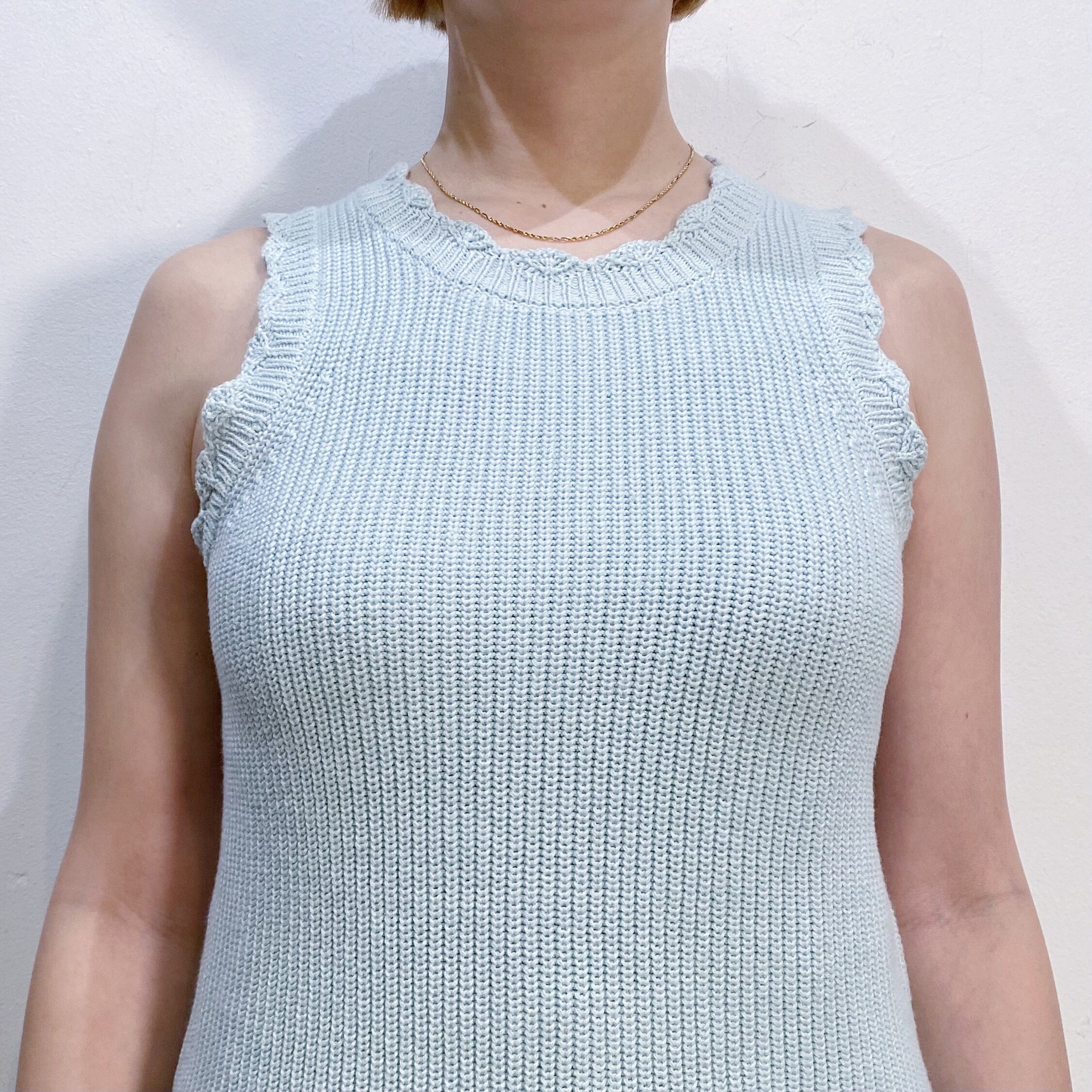 サックスブルーの色味が可愛い、ノースリーブニットトップスです。