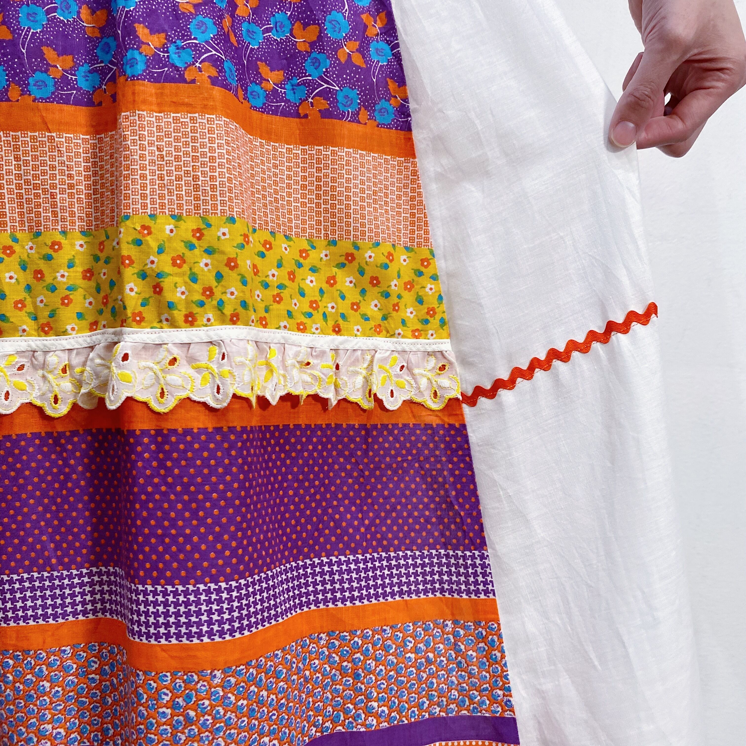 オレンジとパープルの色合わせが可愛い、70年代のパッチワークスカートです。