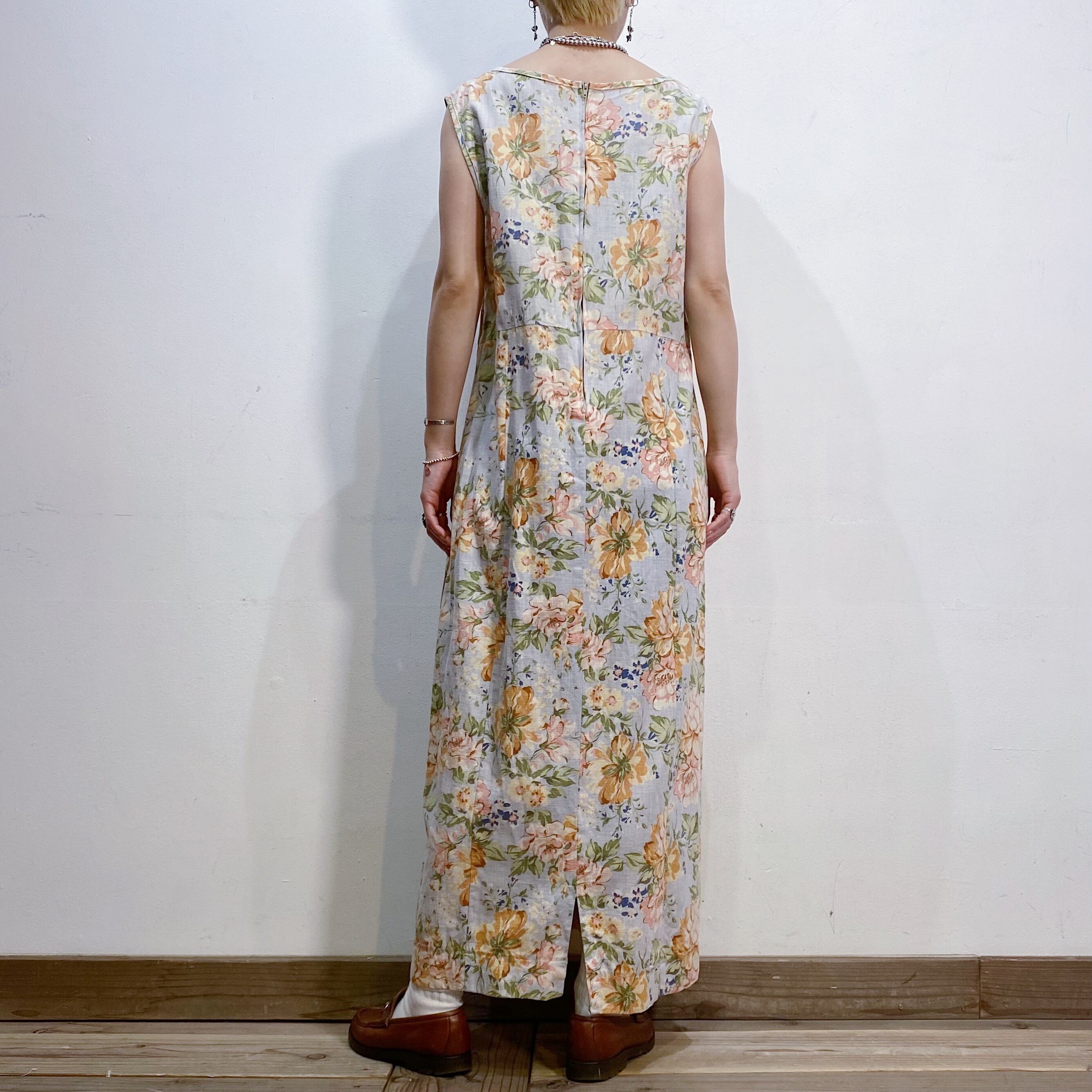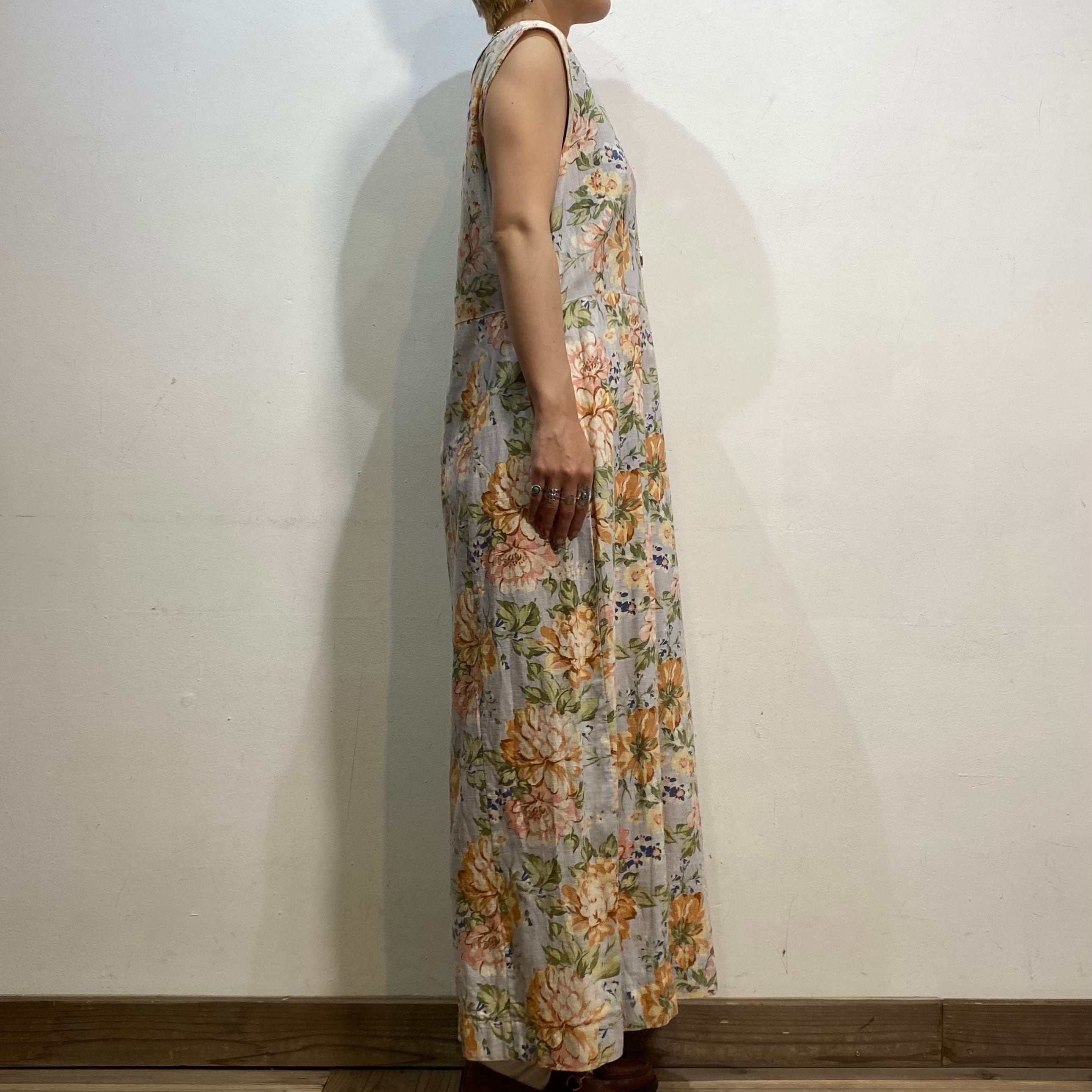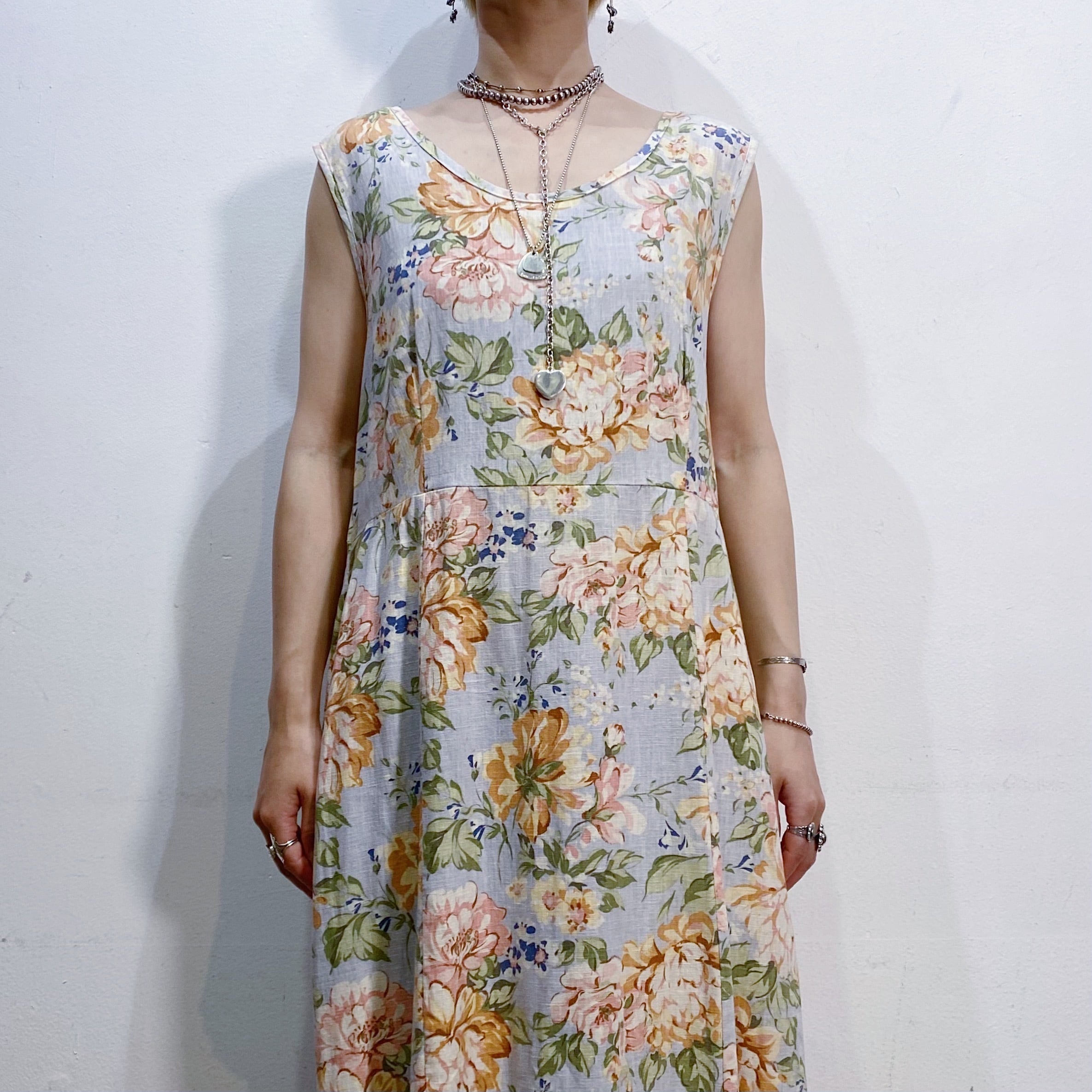 サックスブルーベースの花柄が可愛い、ノースリーブワンピースです。