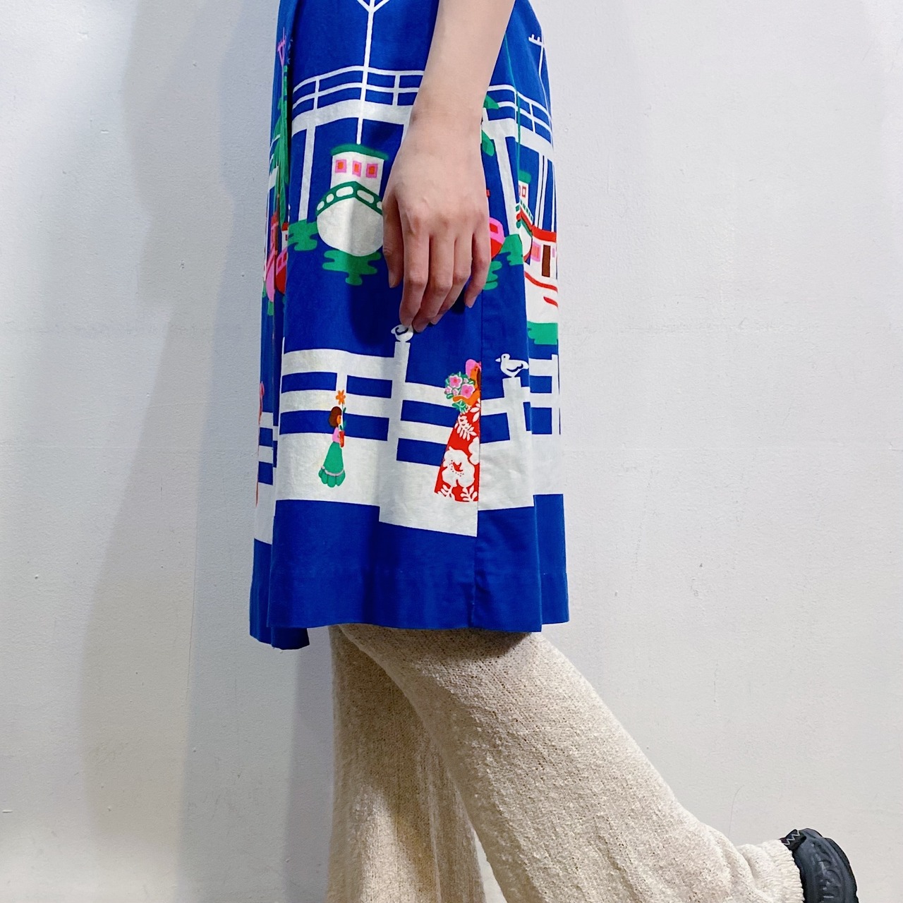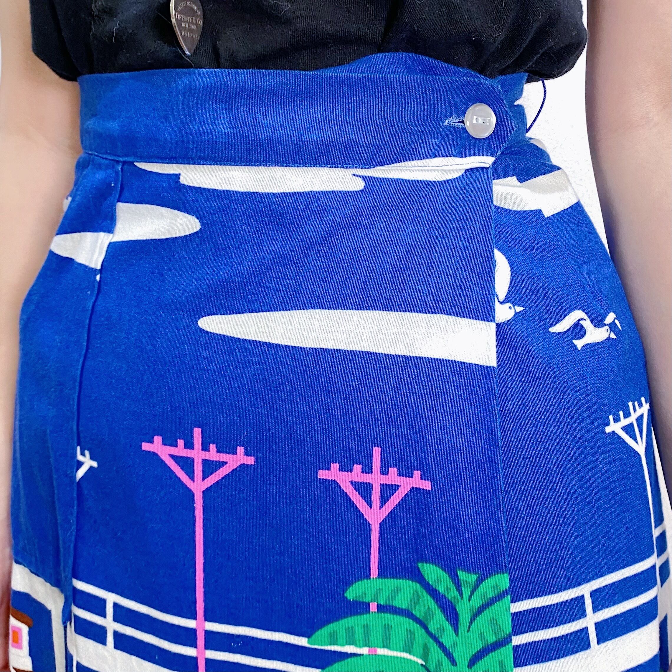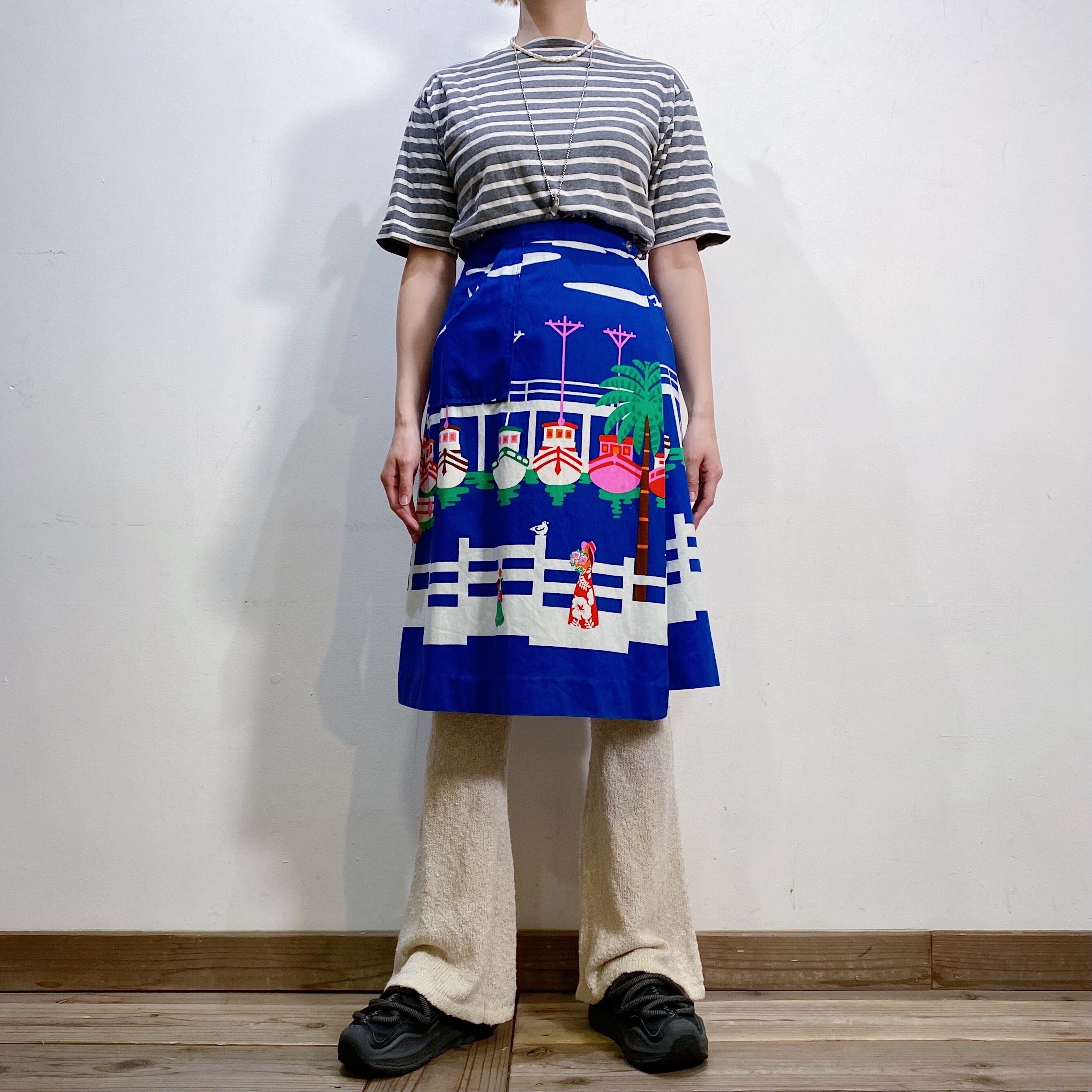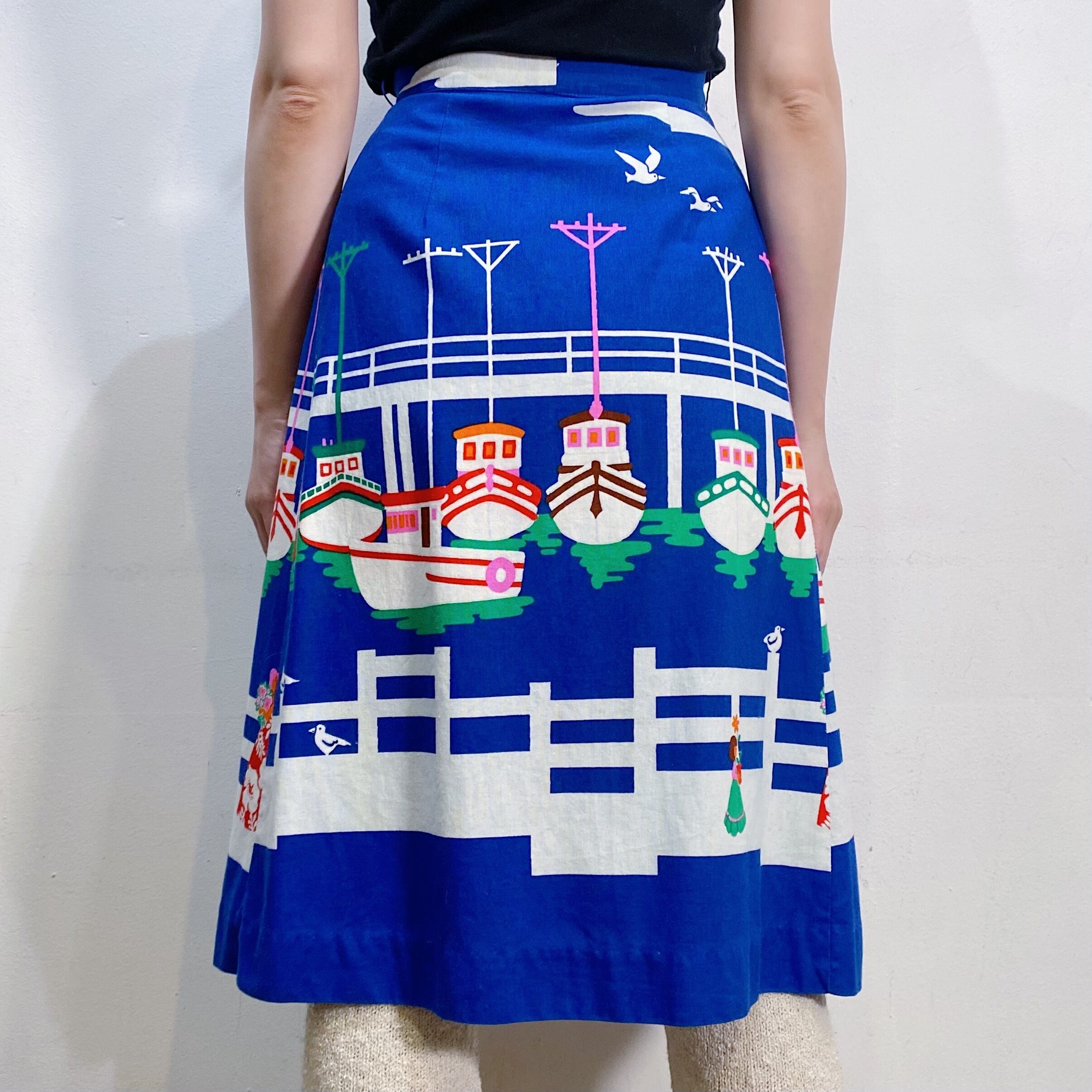船にカモメ・ハワイアンドレスを着た女性の、ホノルルの風景が可愛い70年代のスカートです。