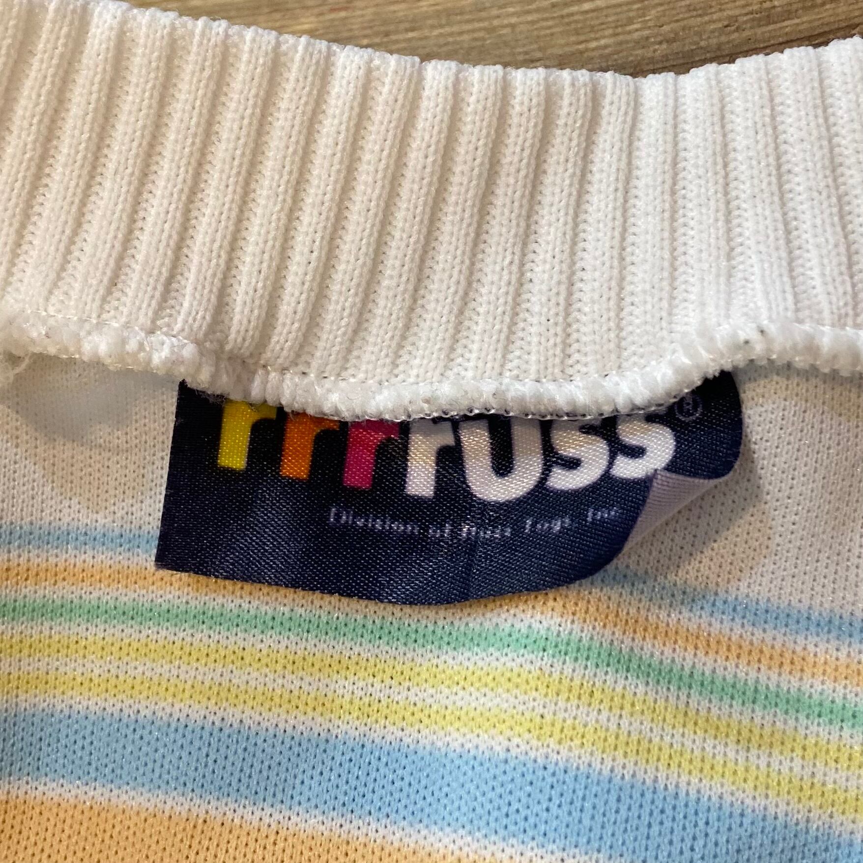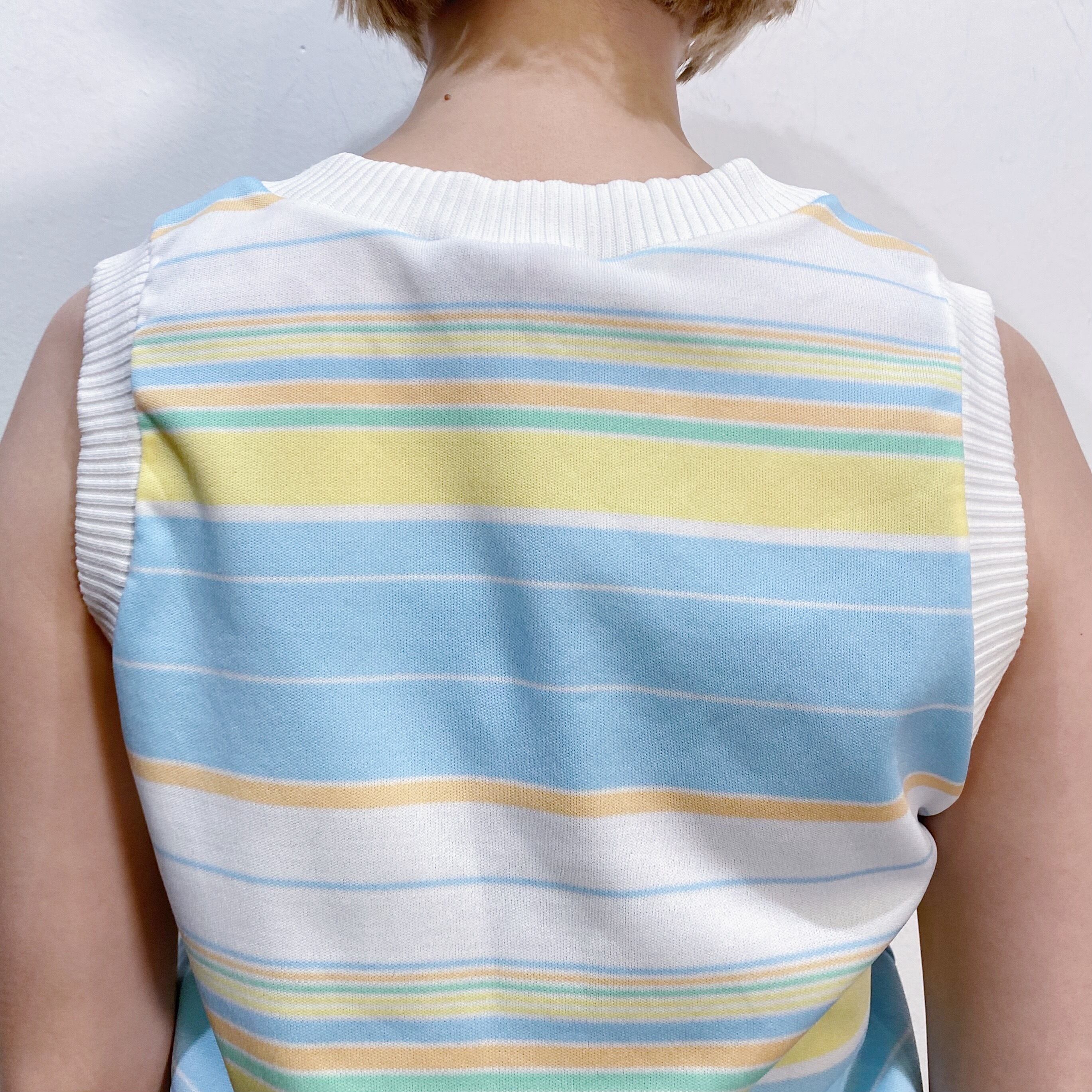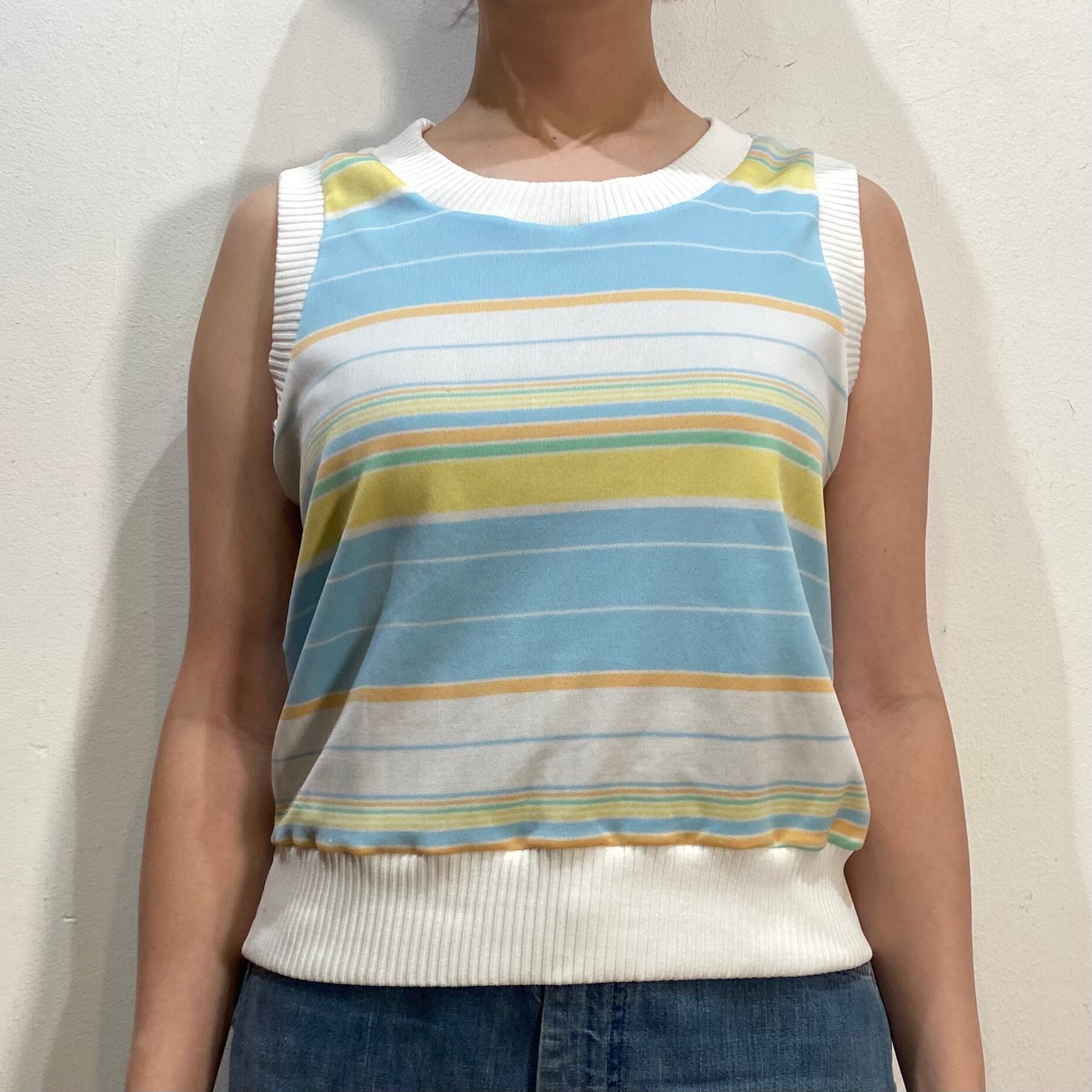 サックスブルーやオレンジのピッチの違うボーダー柄が可愛い、70年代のノースリーブトップスです。
