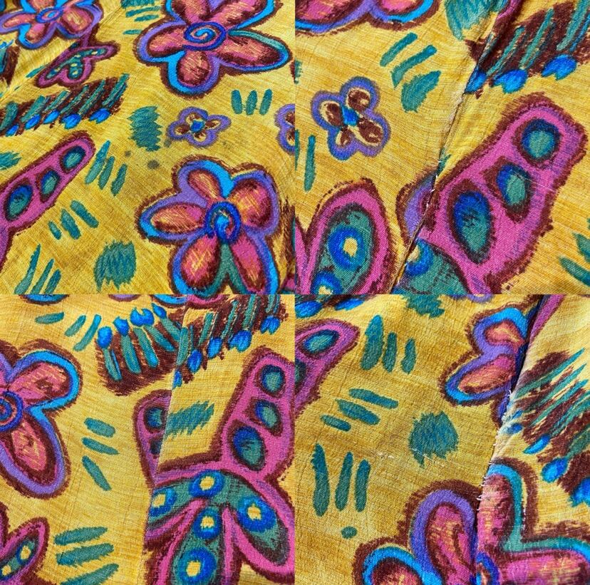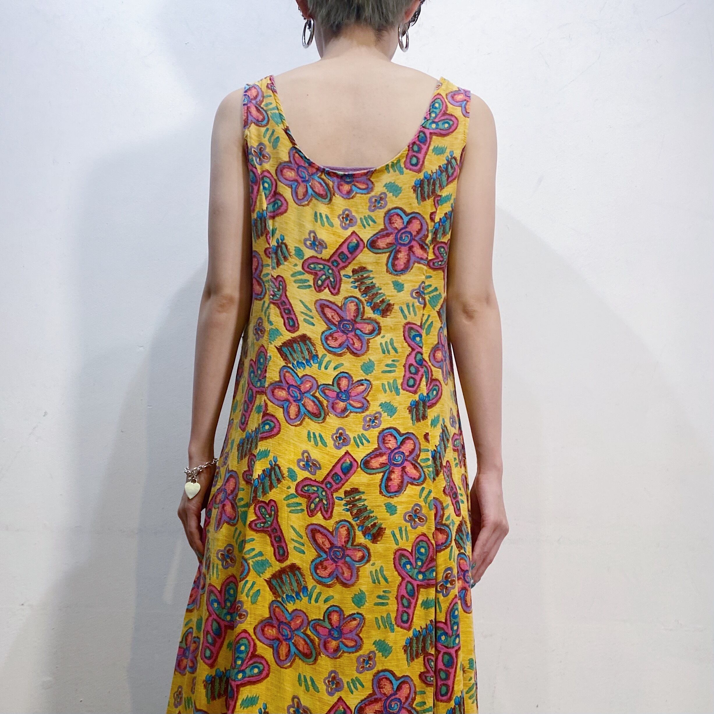 お花やサボテンのような陽気な手書きタッチの柄が可愛い、90年代頃のノースリーブワンピースです。