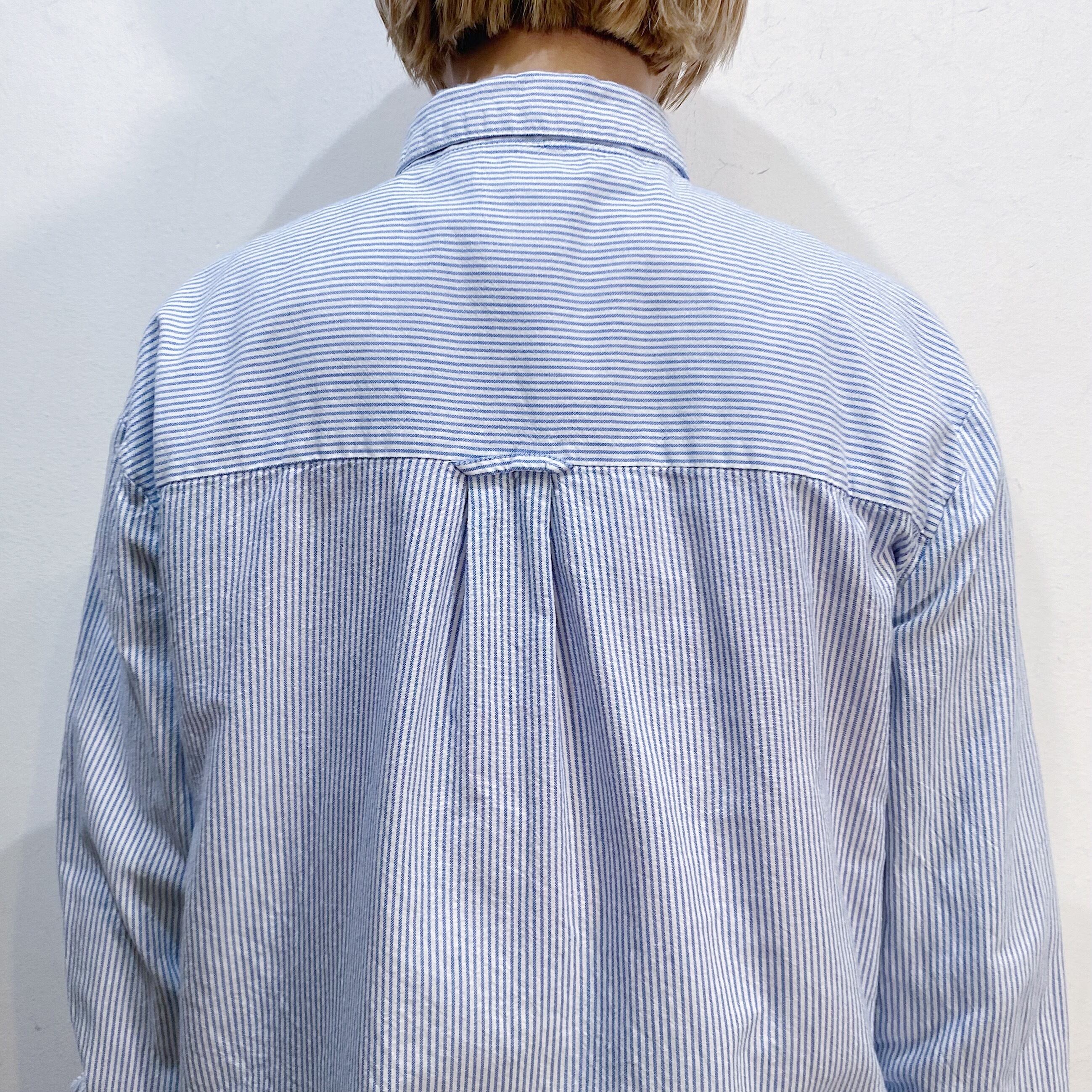 サックスブルー×ホワイトのピンストライプ柄が可愛い長袖シャツです。