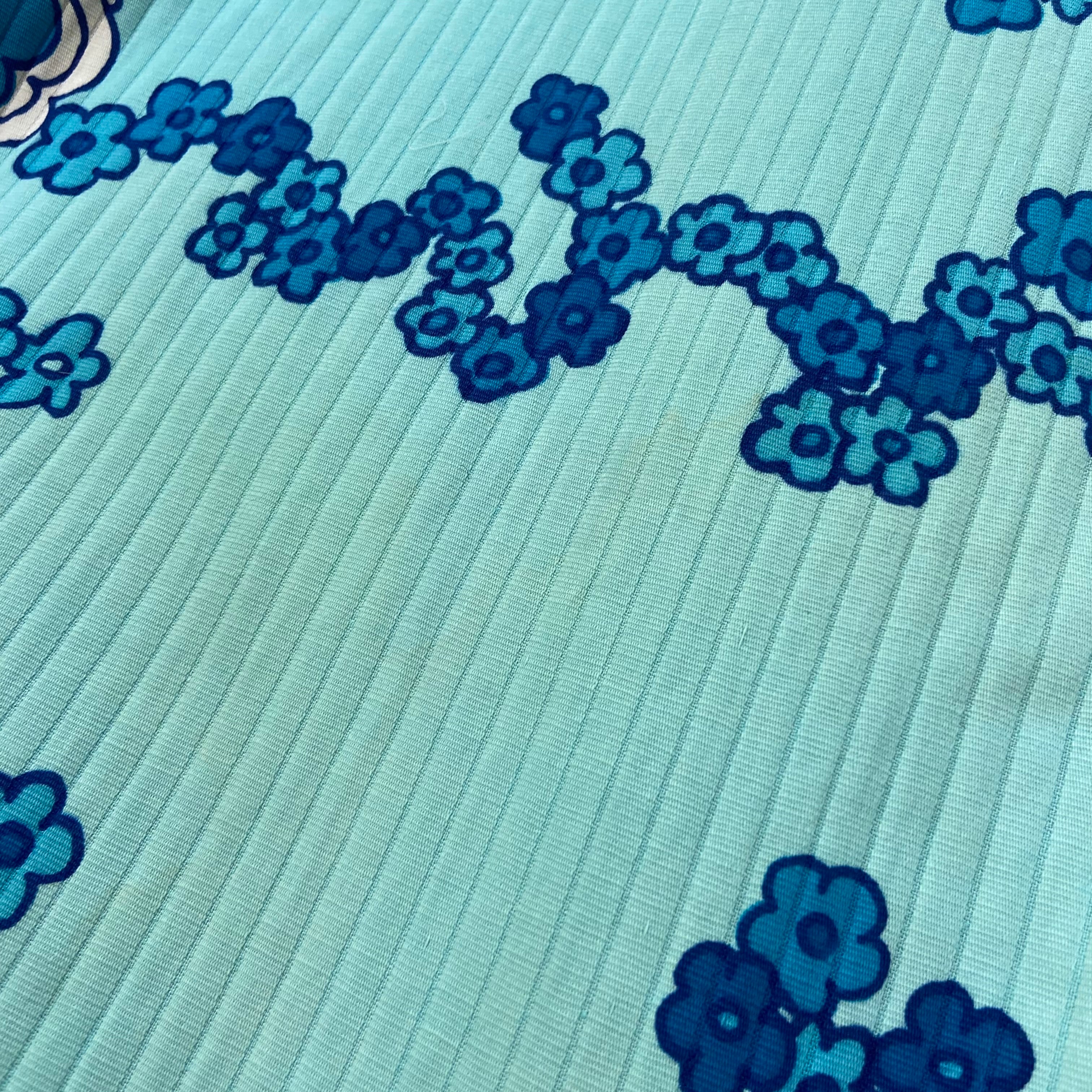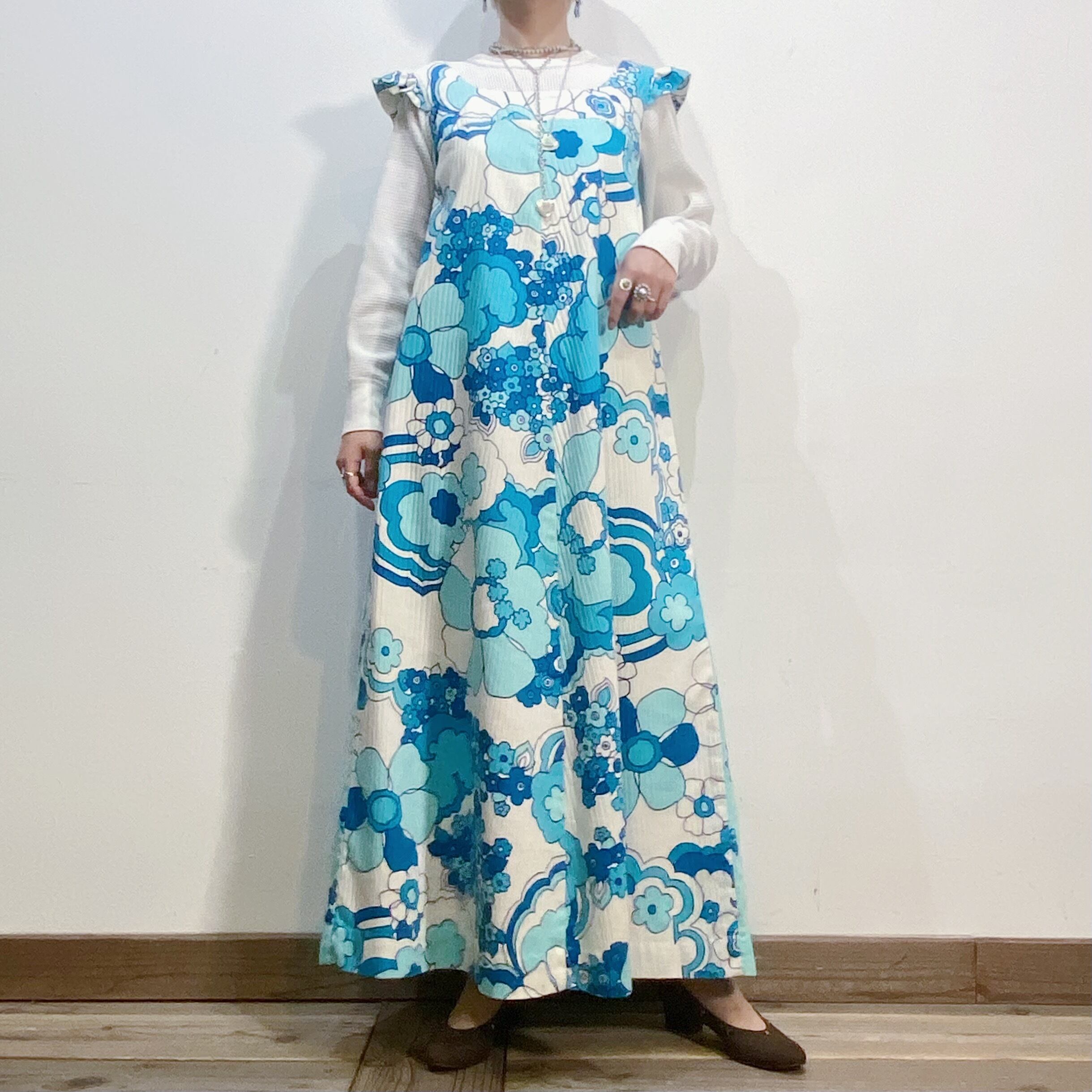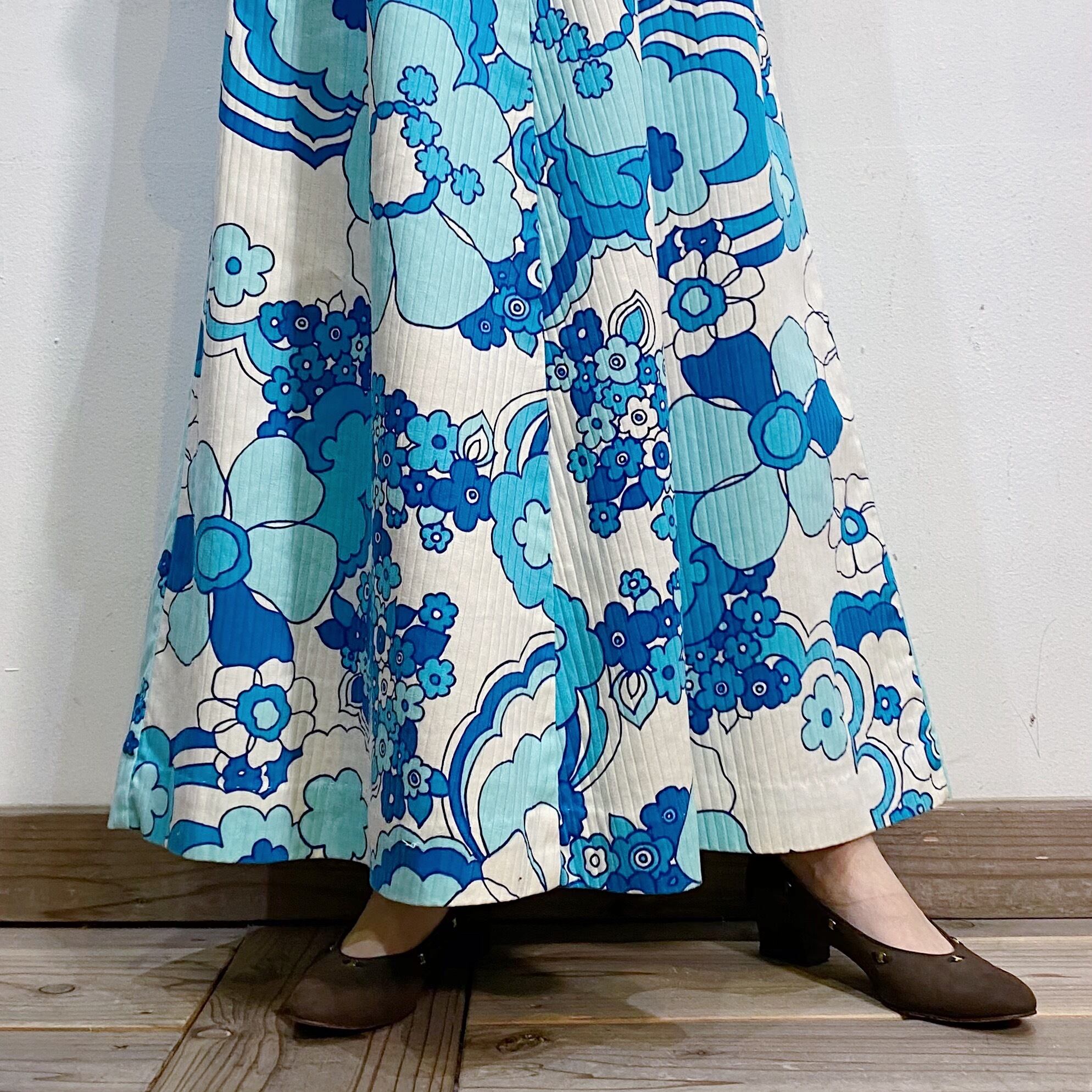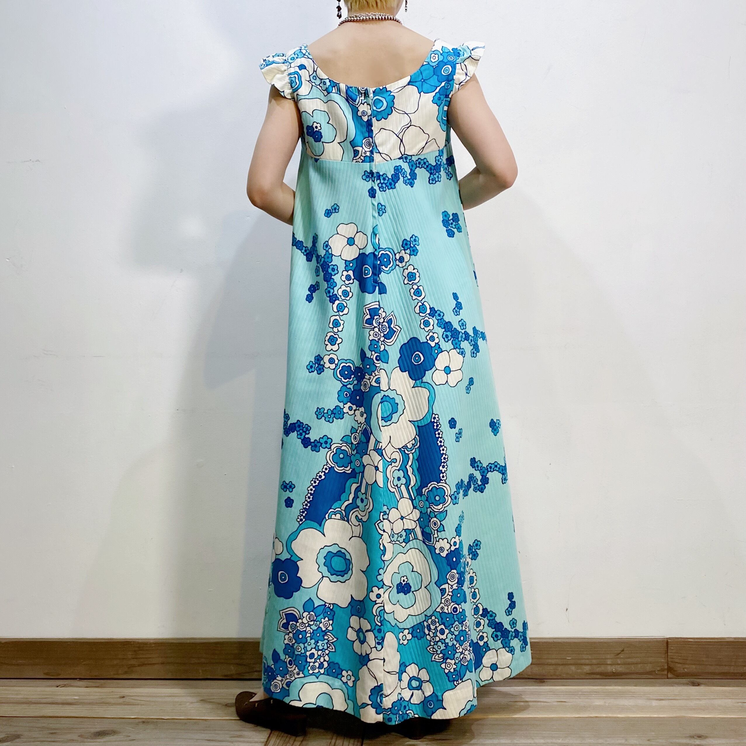 サックスブルーベースの花柄が可愛い、70年代のハワイアンワンピースです。
