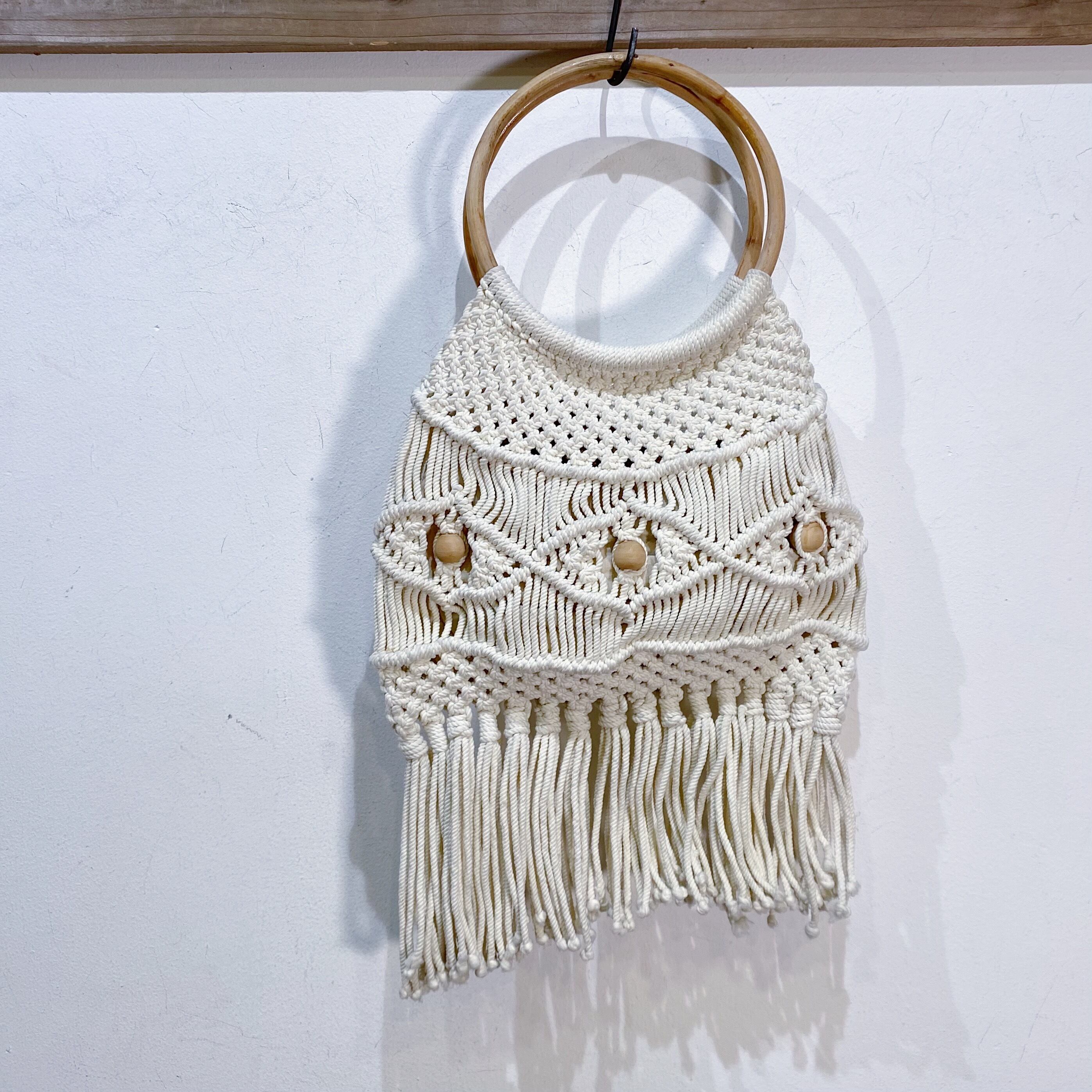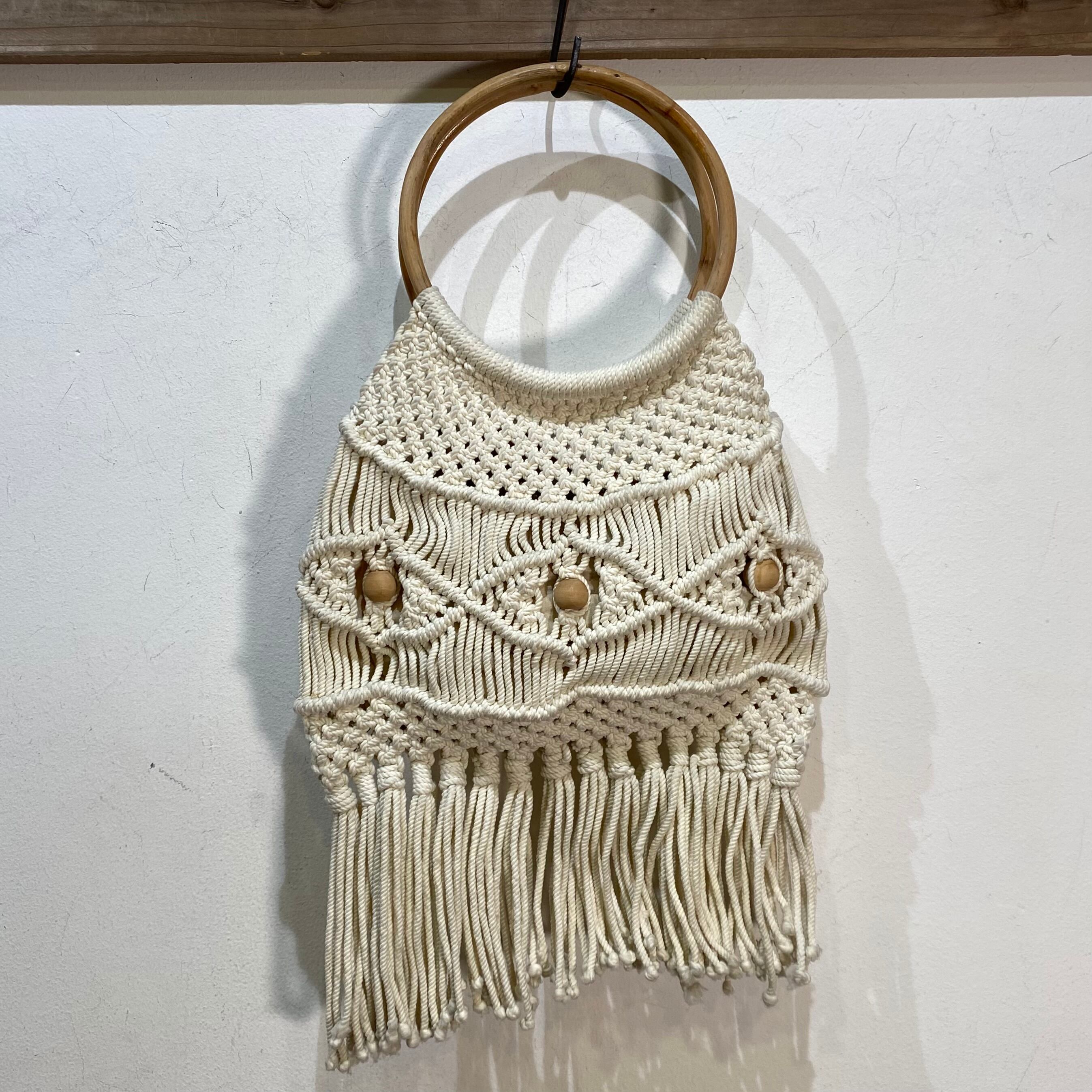 White macrame and wood beads hand bag