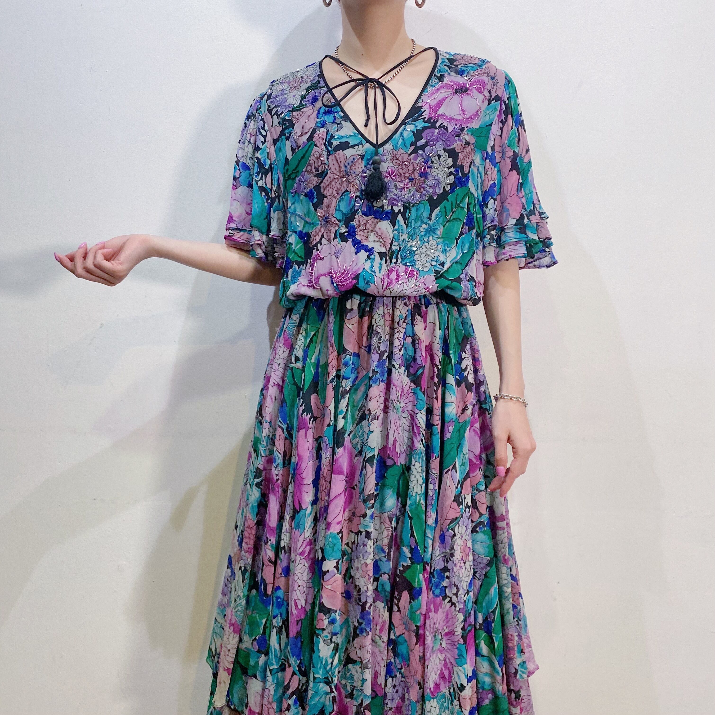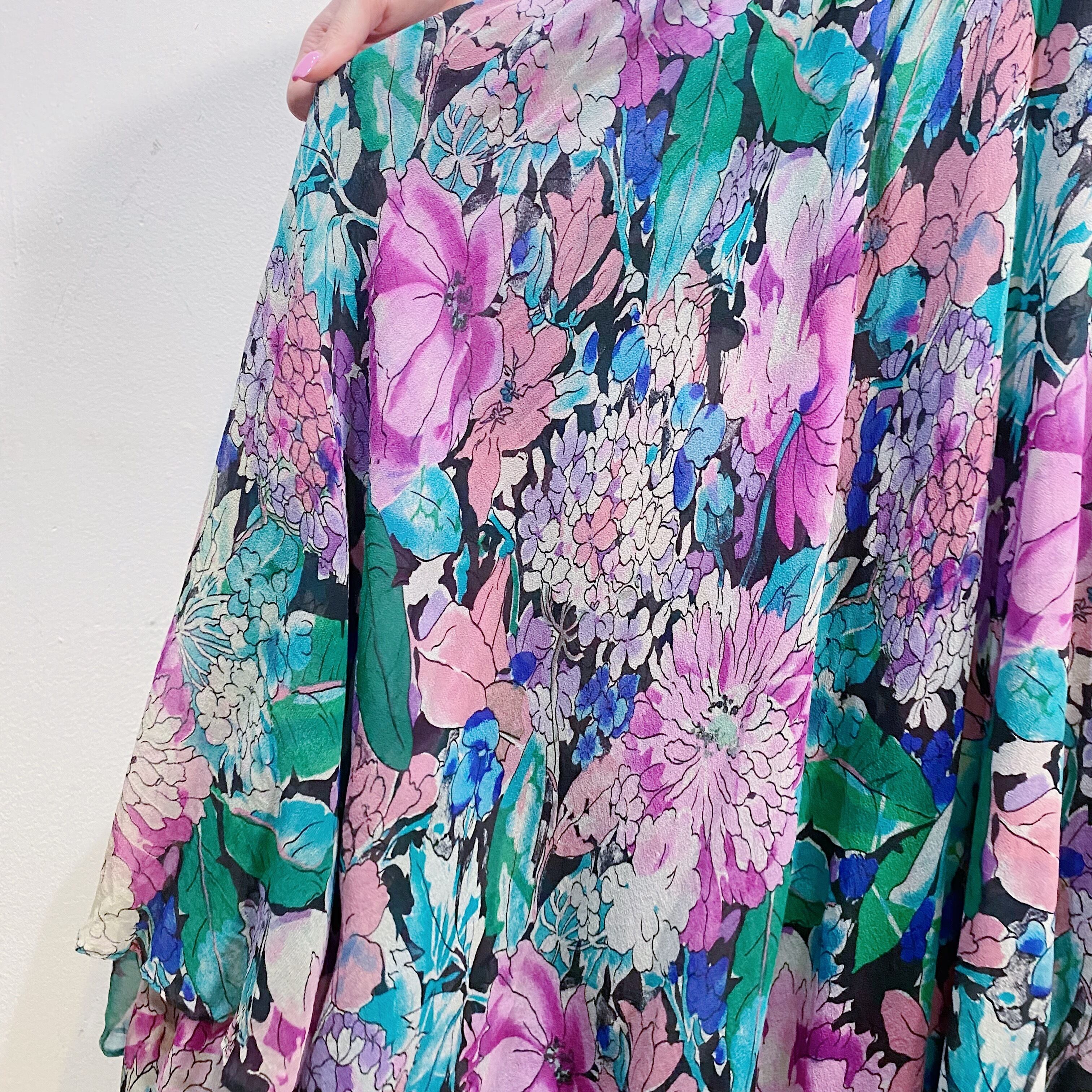 シルク素材の生地を贅沢にたっぷりと使用した、80年代の“Diane Freis”のワンピースです。