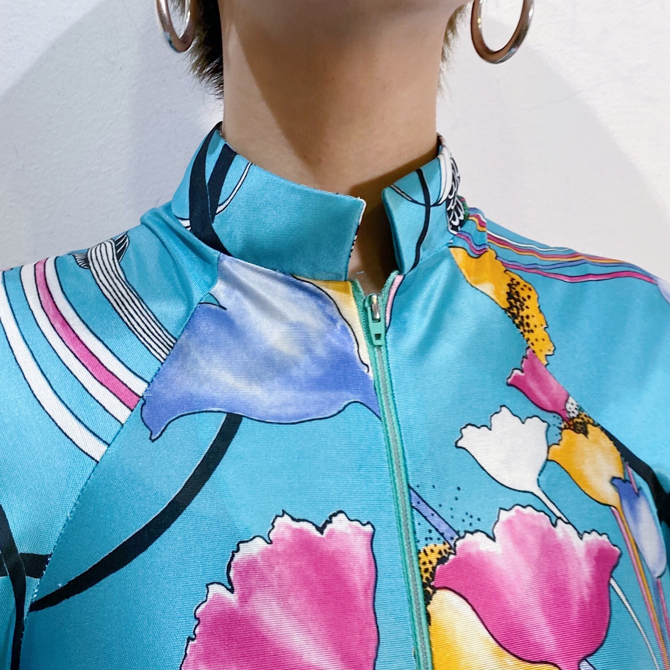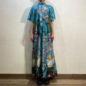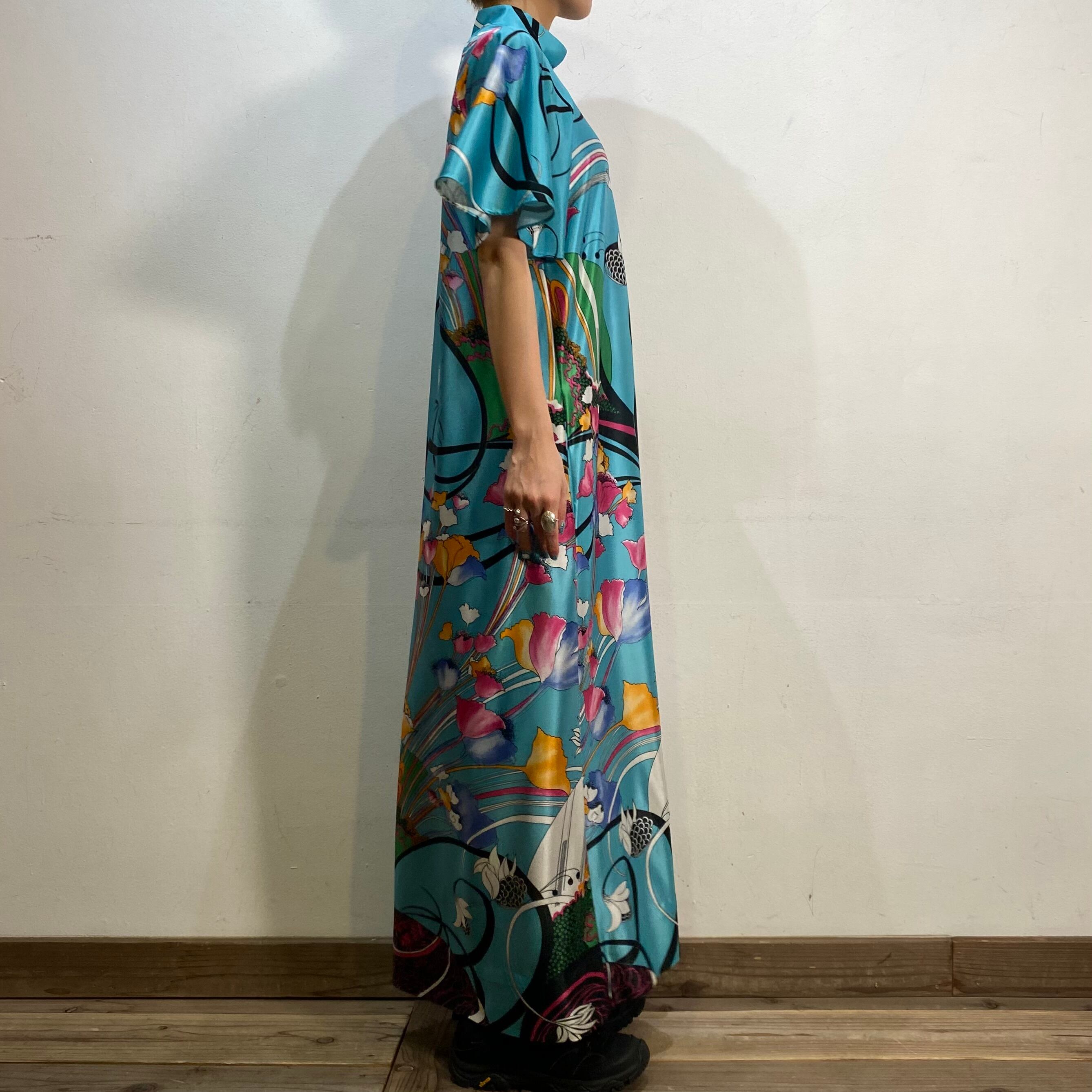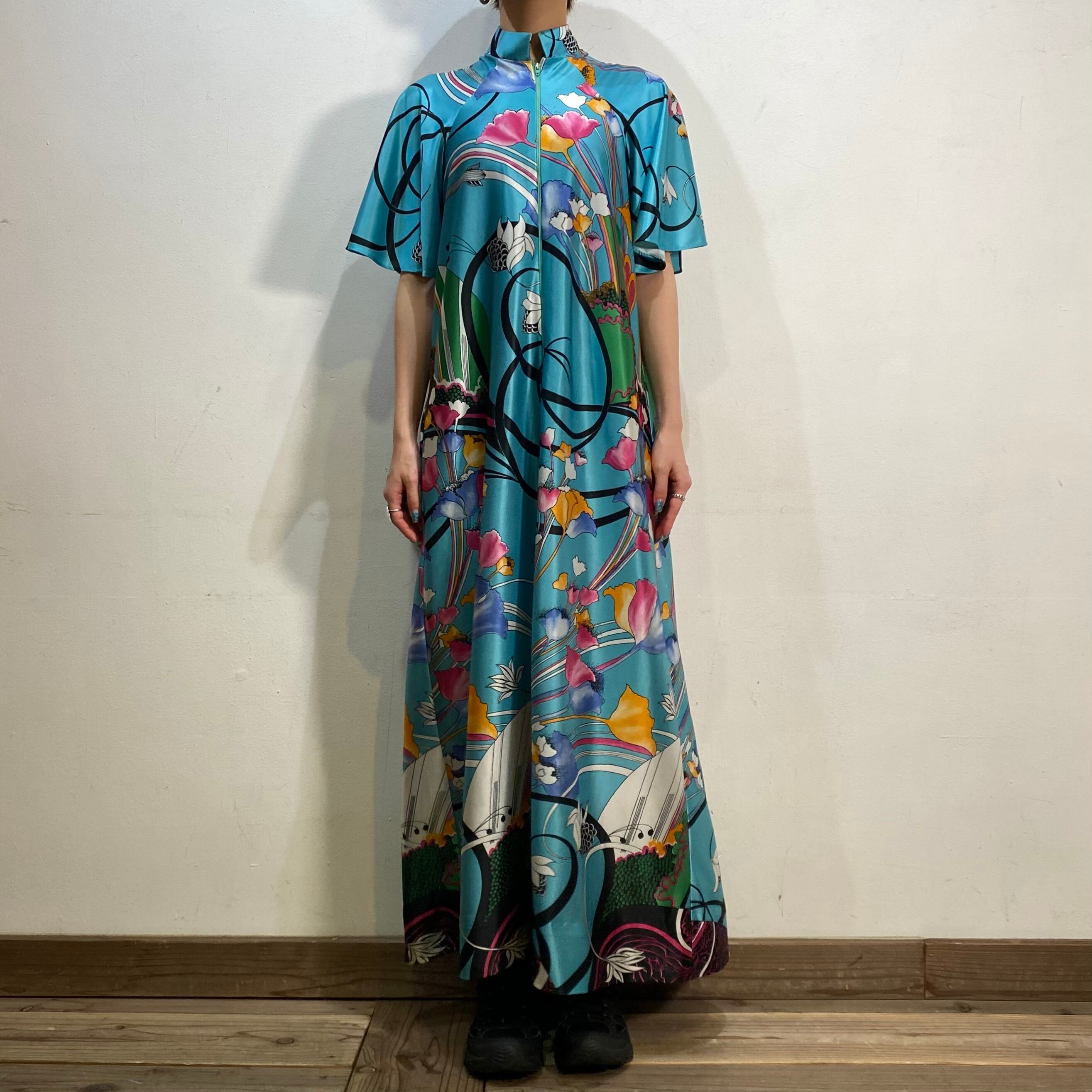 サックスブルーベースに色鮮やかな花柄が可愛い、70年代のワンピースです。