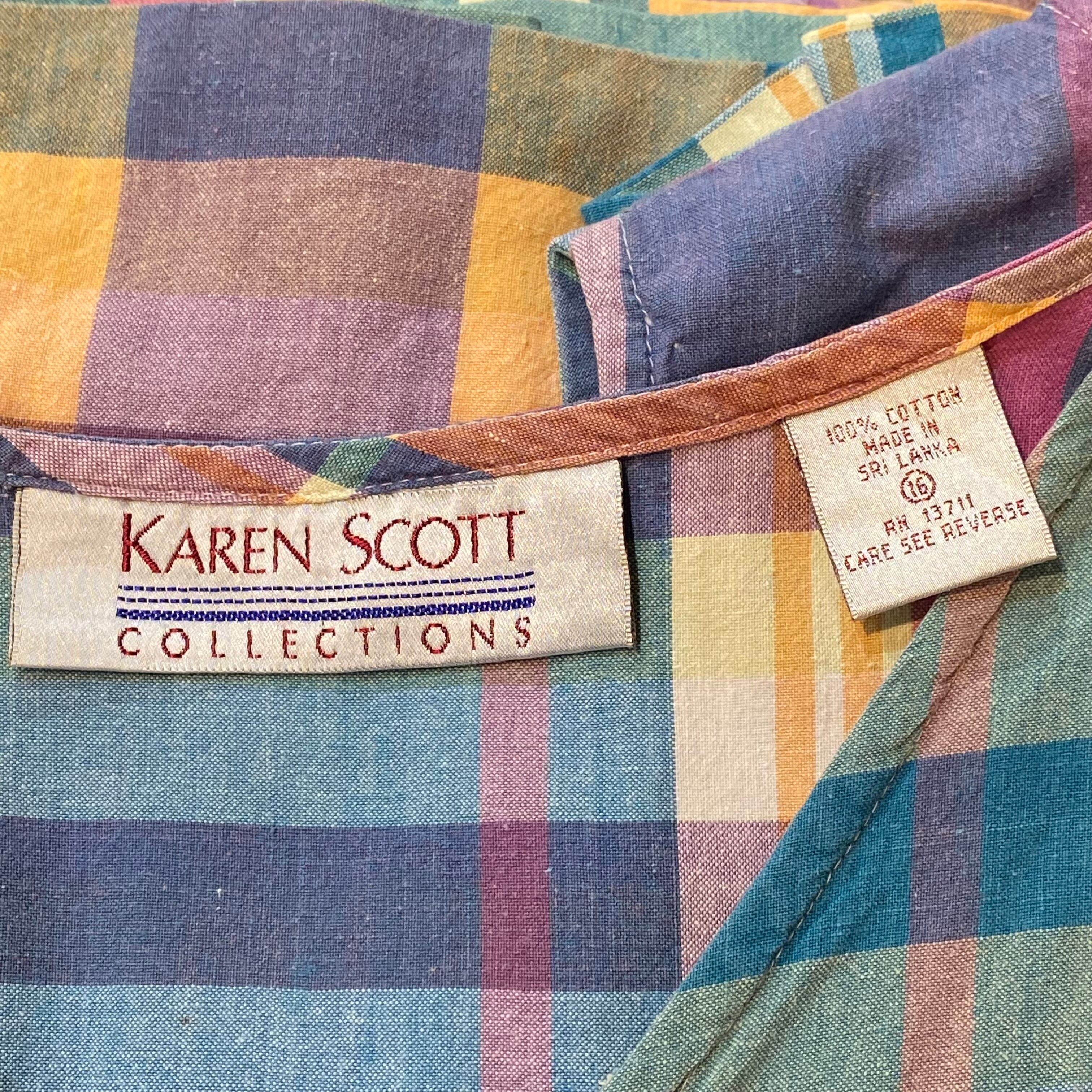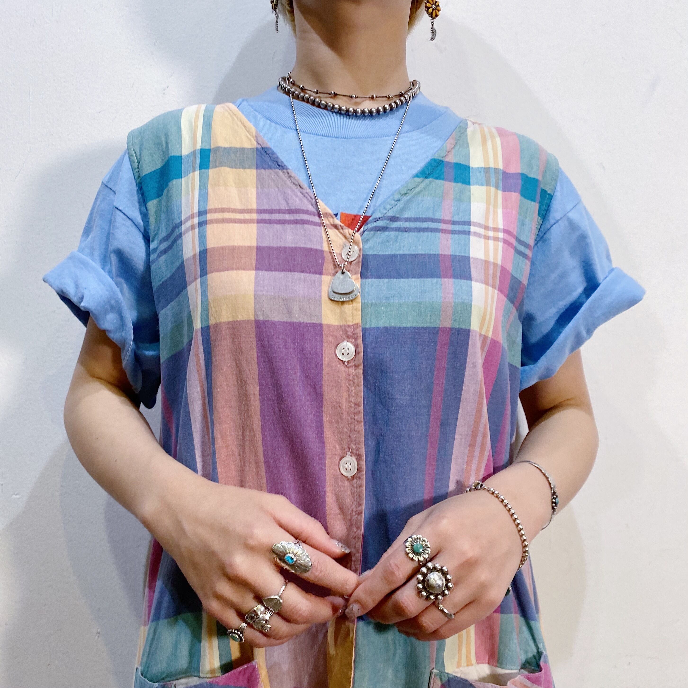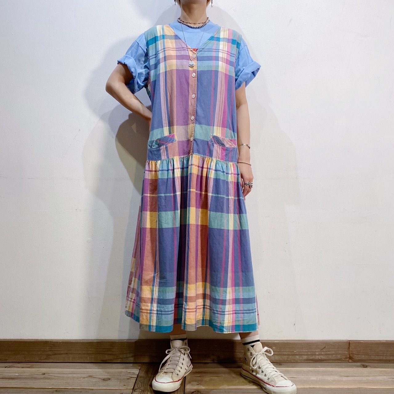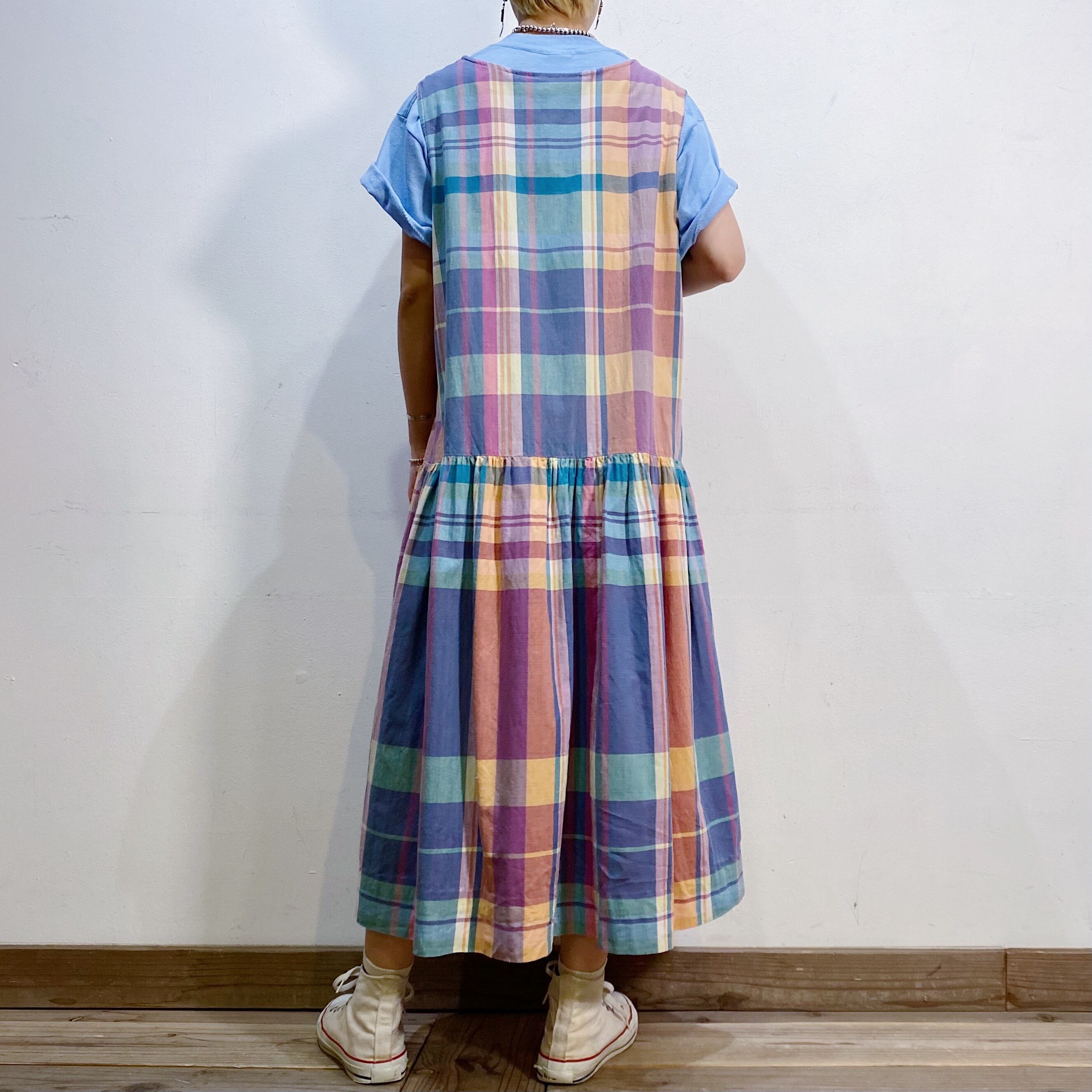 水色やピンクの色合わせが可愛い、チェックのジャンパーワンピースです。