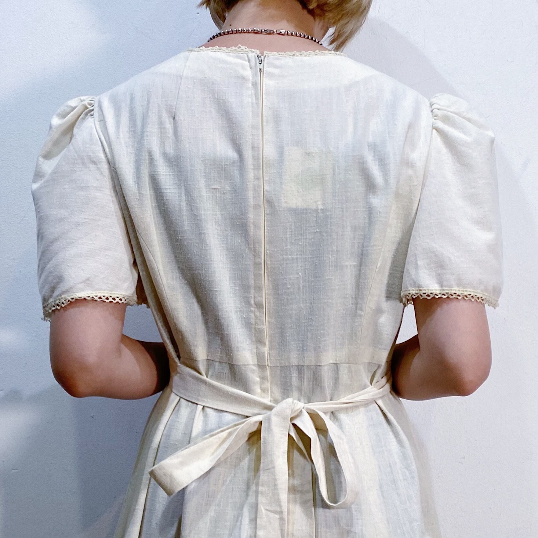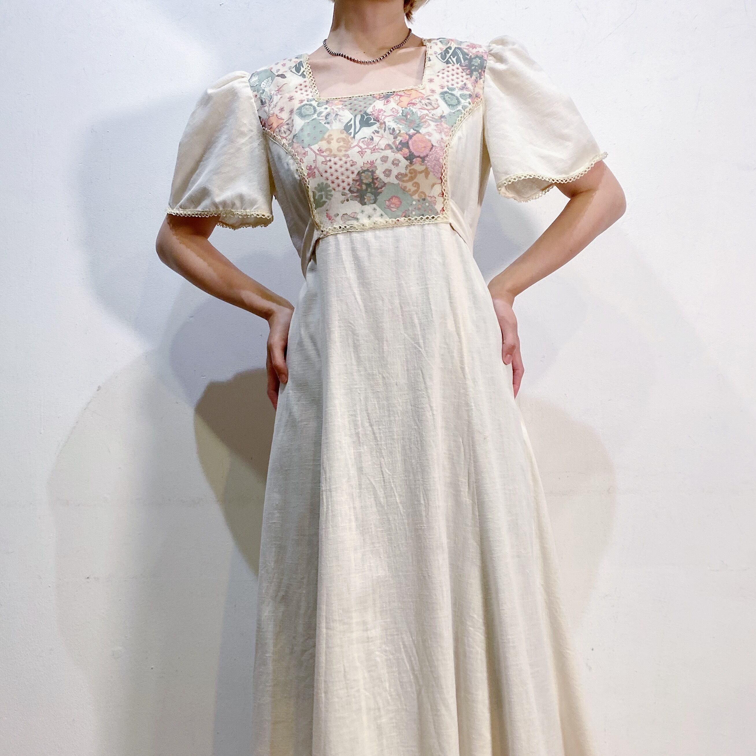フロントと裾のパッチワークプリントが可愛い、70年代のロングワンピースです。