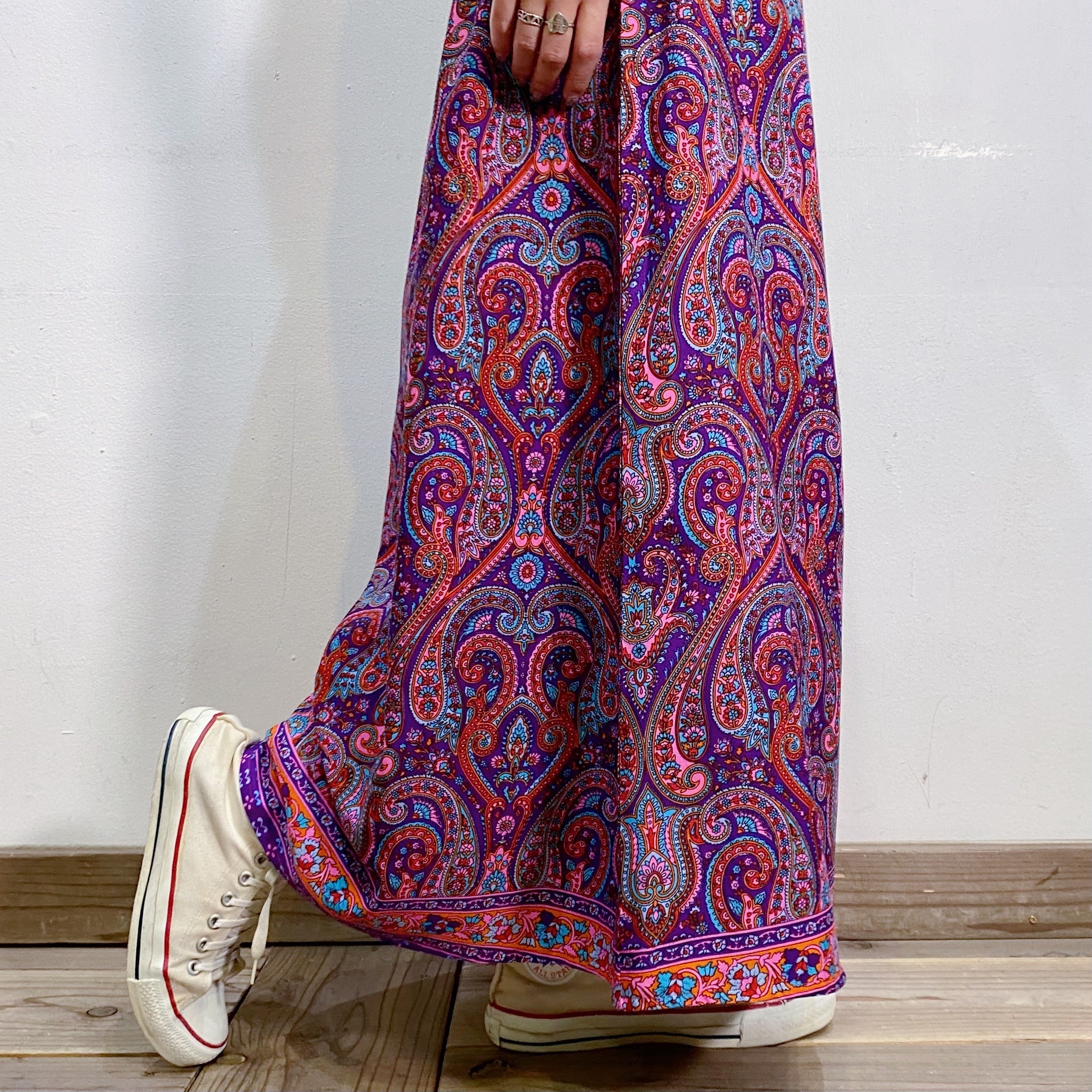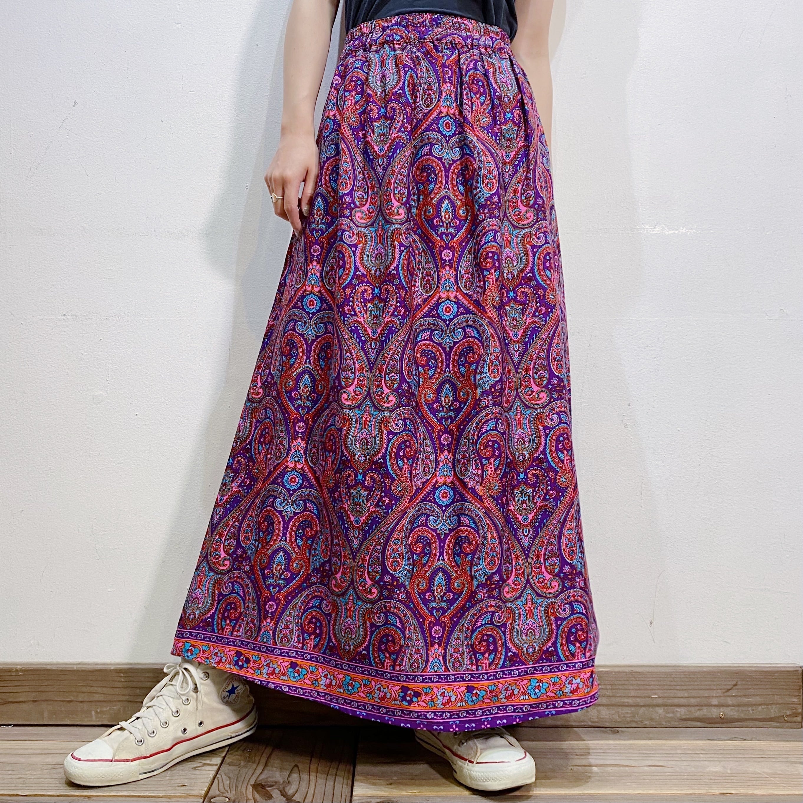 パープルやピンクの色合わせが可愛い、ペイズリー柄のロングスカートです。