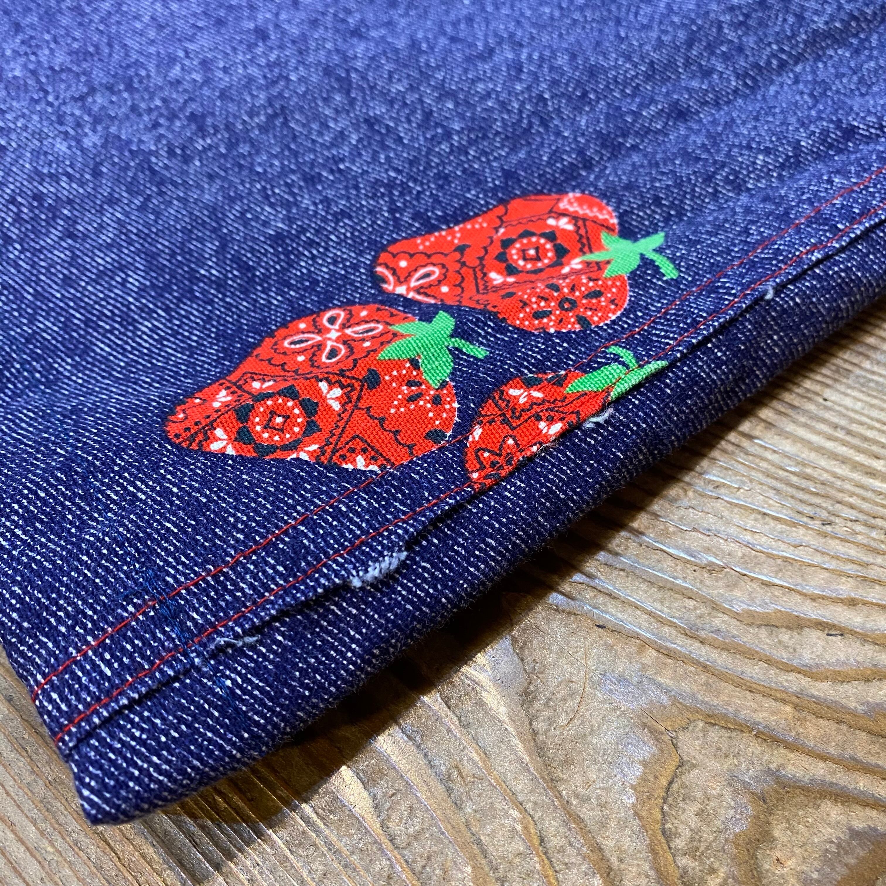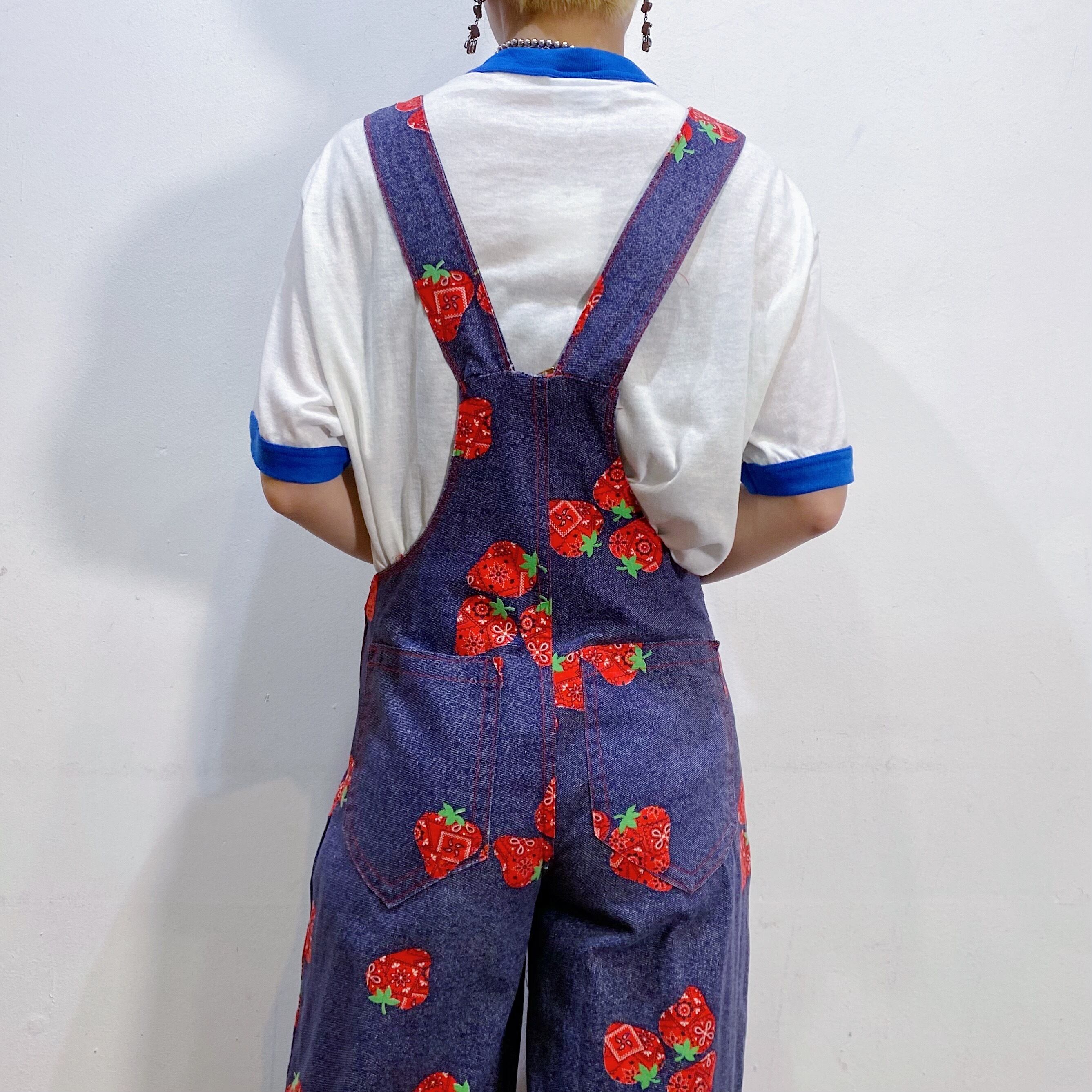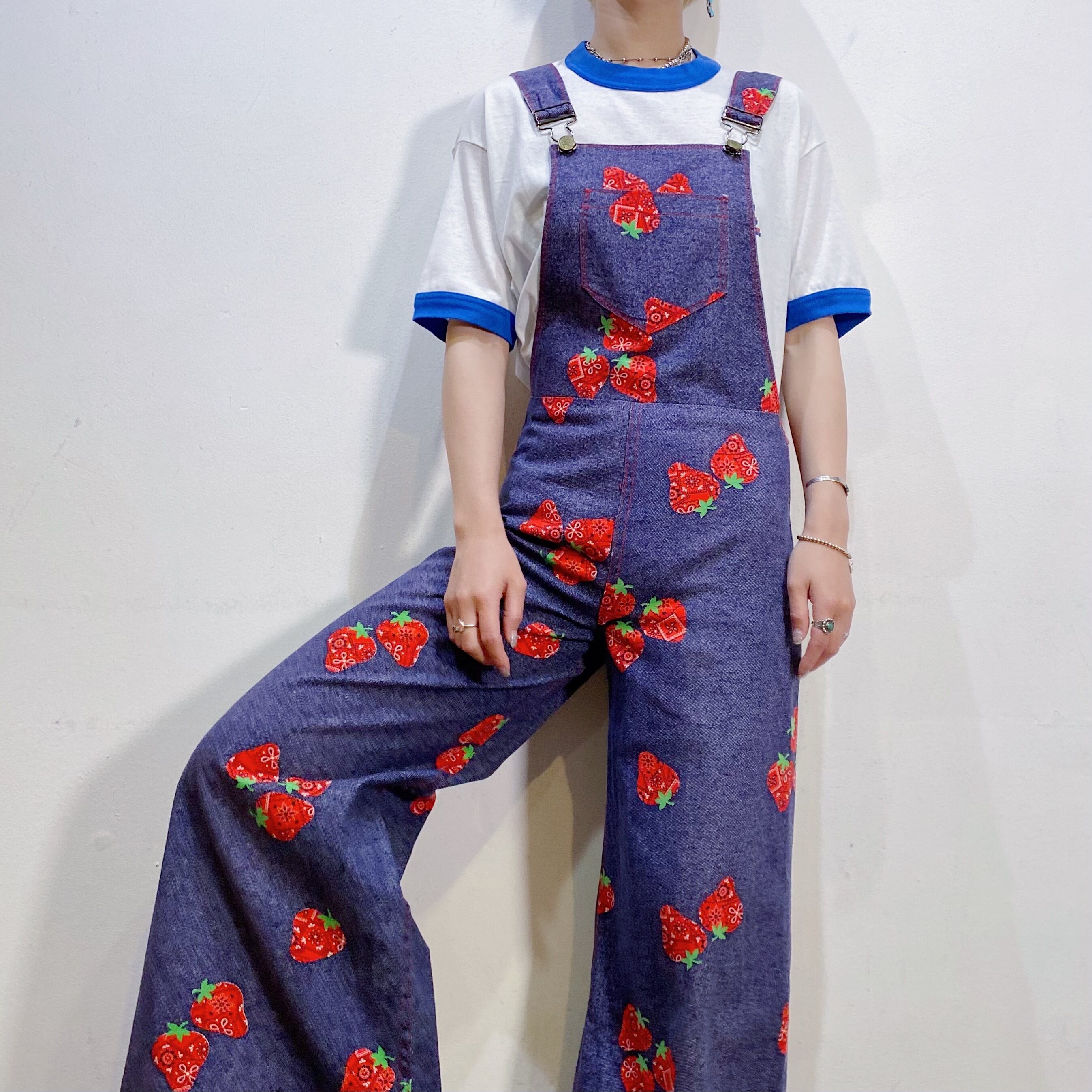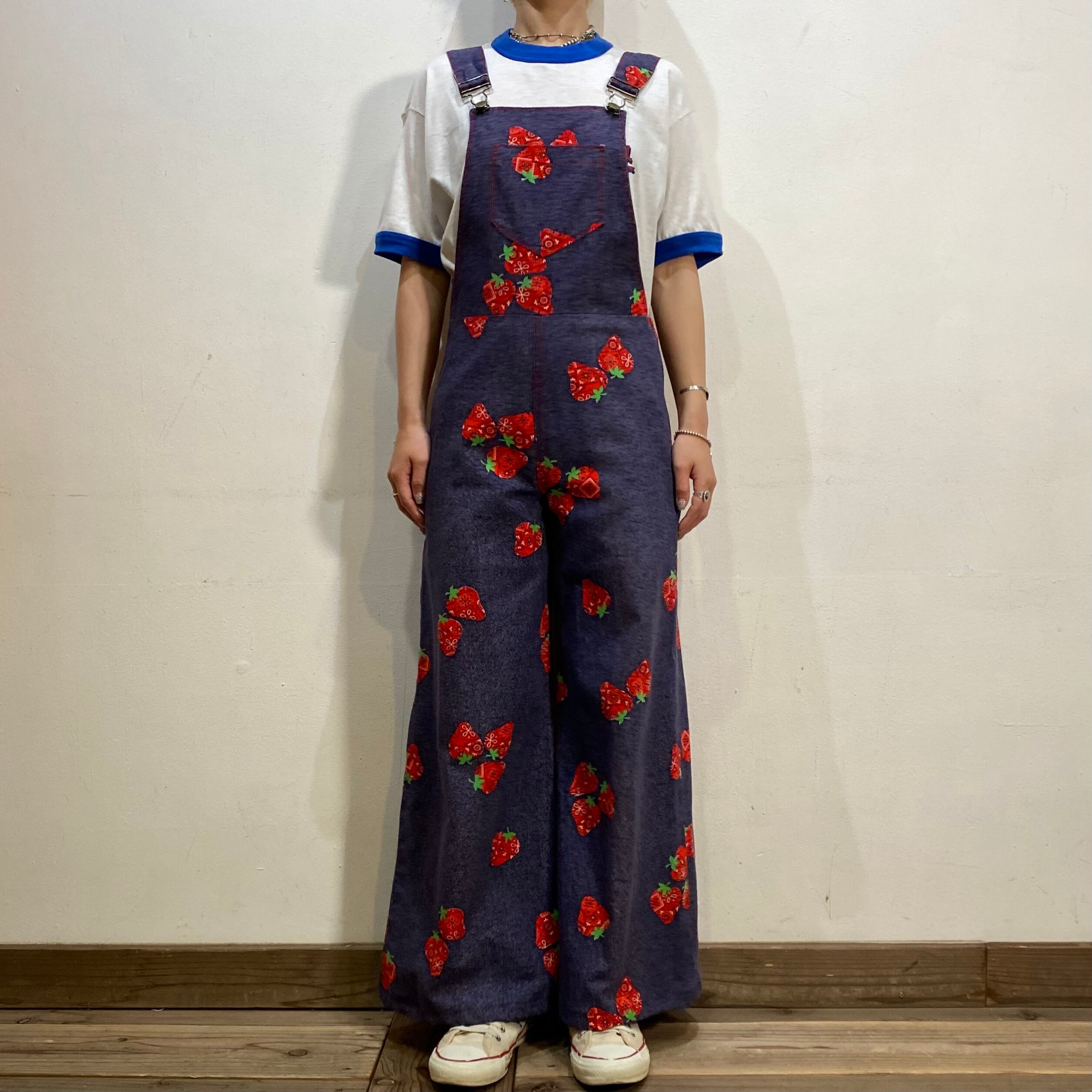 デニム地にイチゴ柄がとっておきに可愛い、70年代のオーバーオールです。