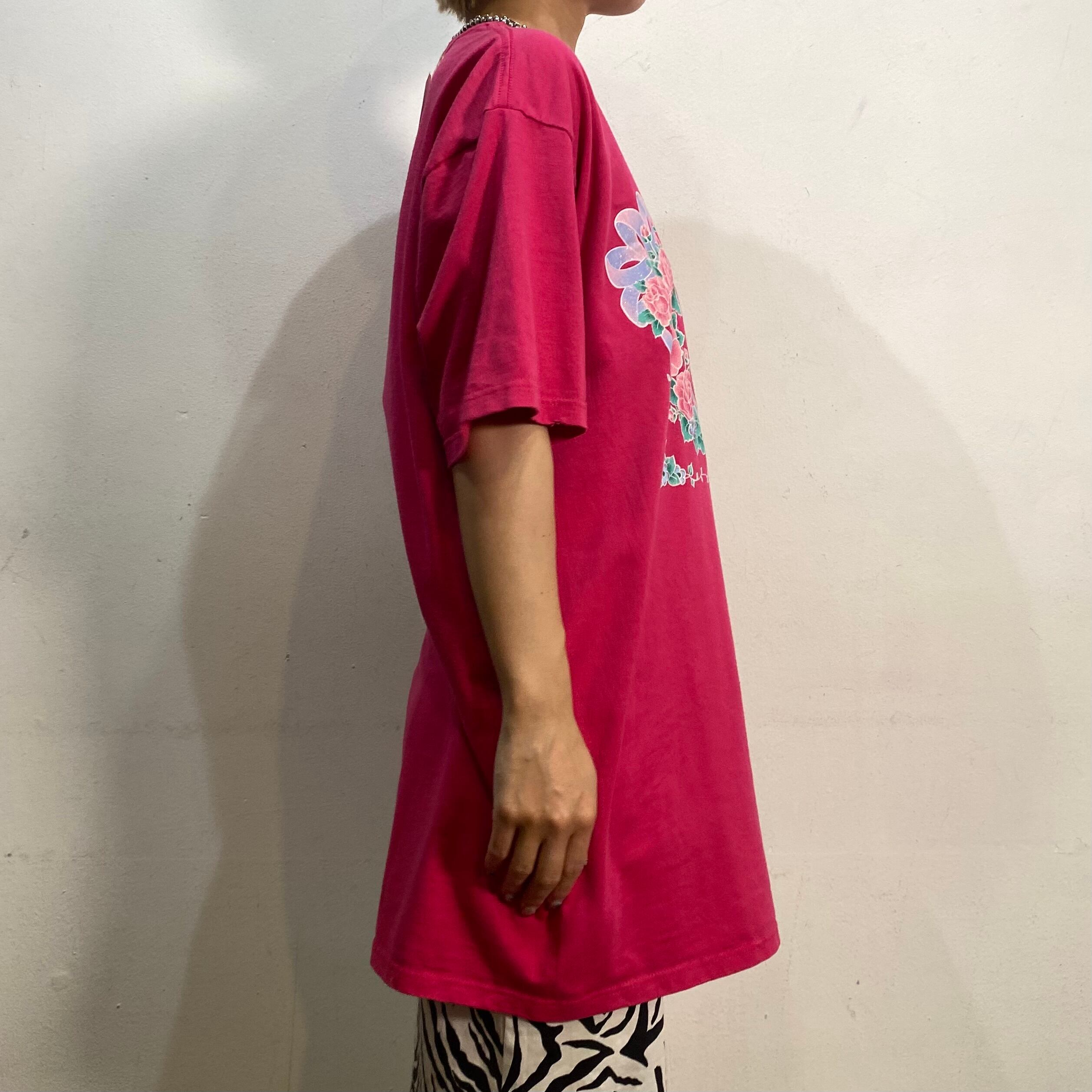 鮮やかなショッキングピンクにハートやバラのプリントが可愛い、90年代のTシャツです。