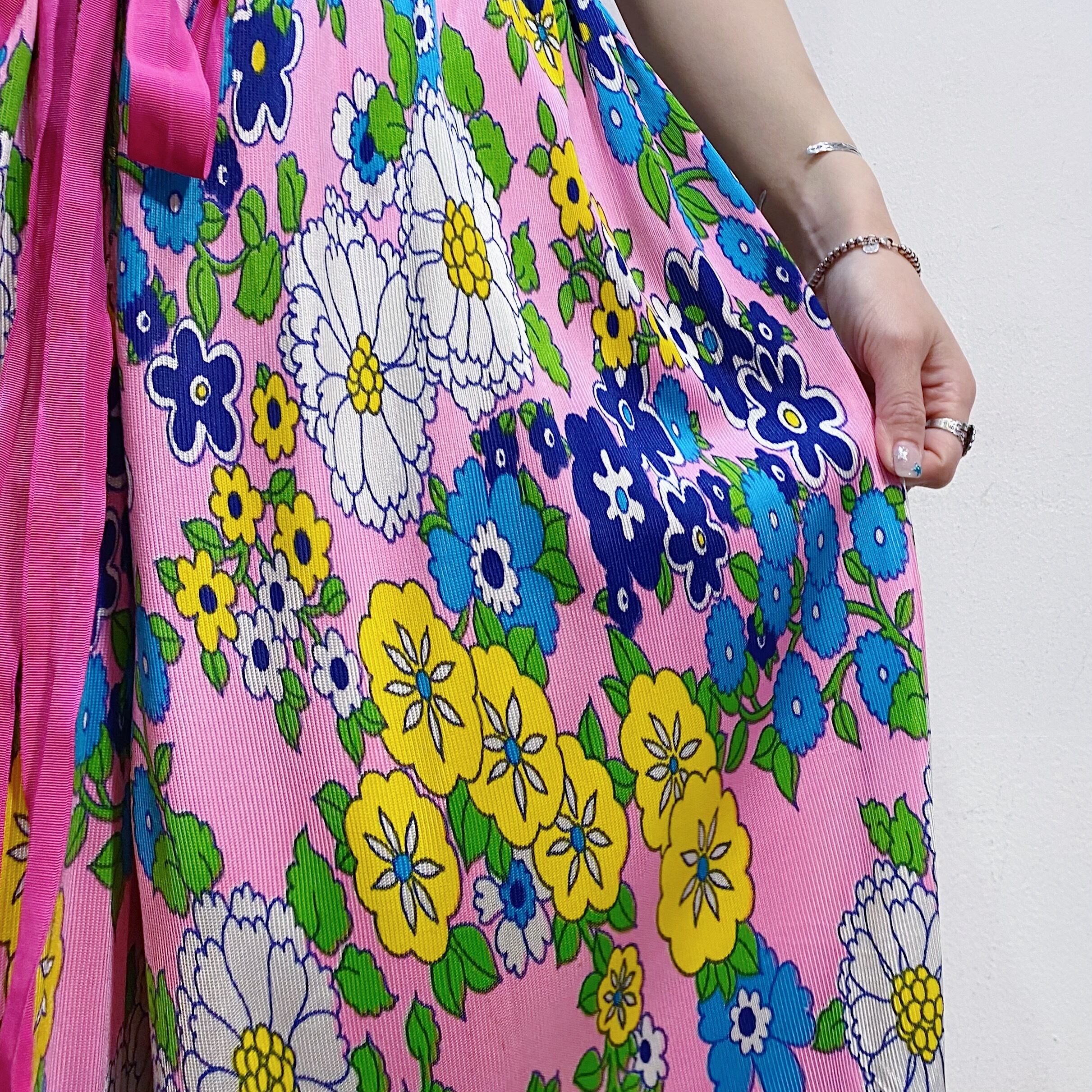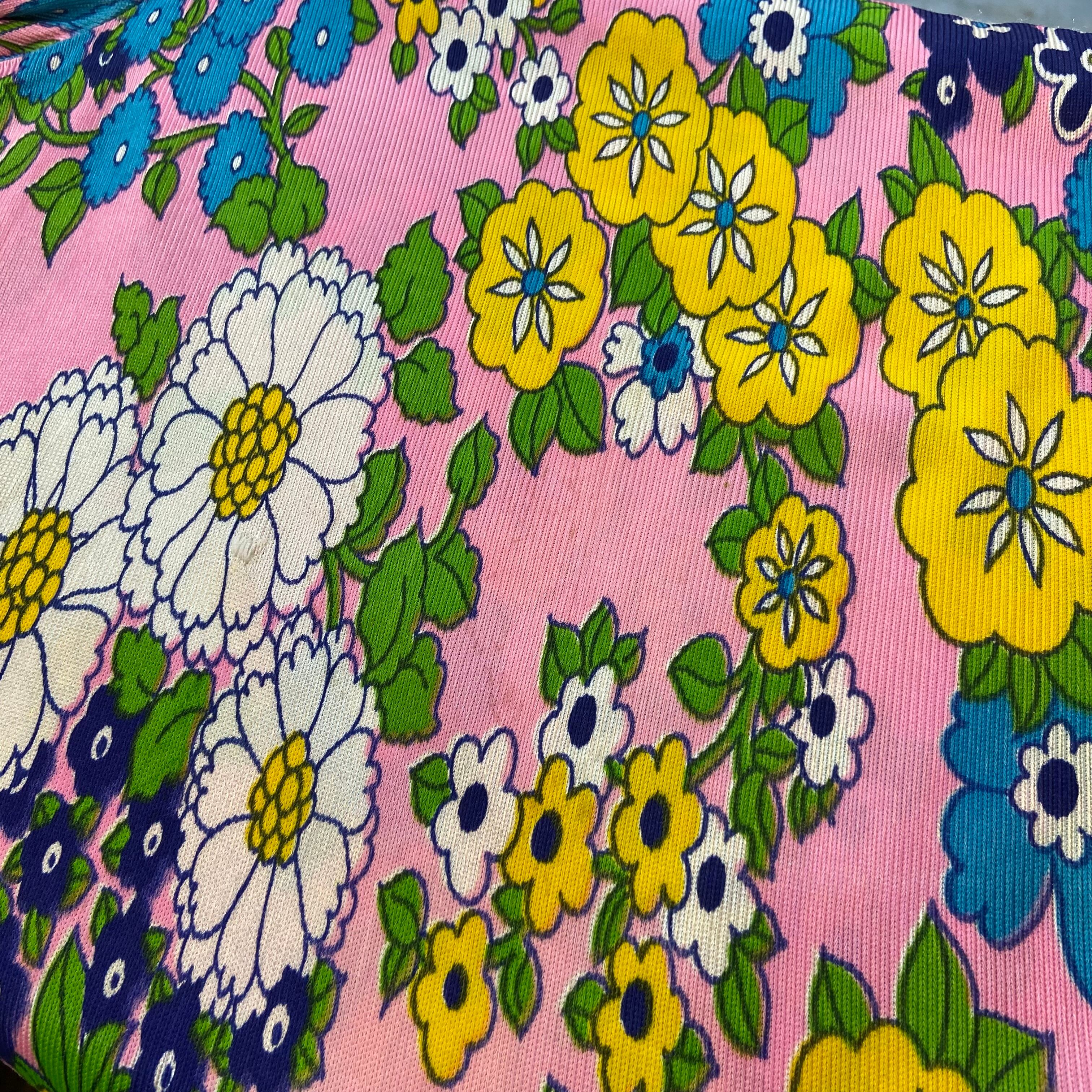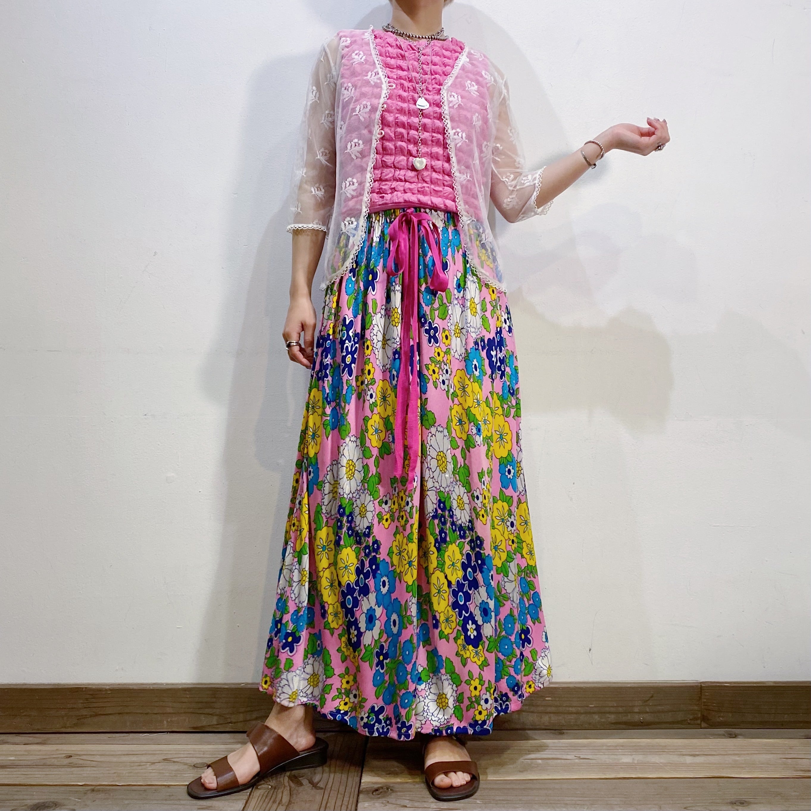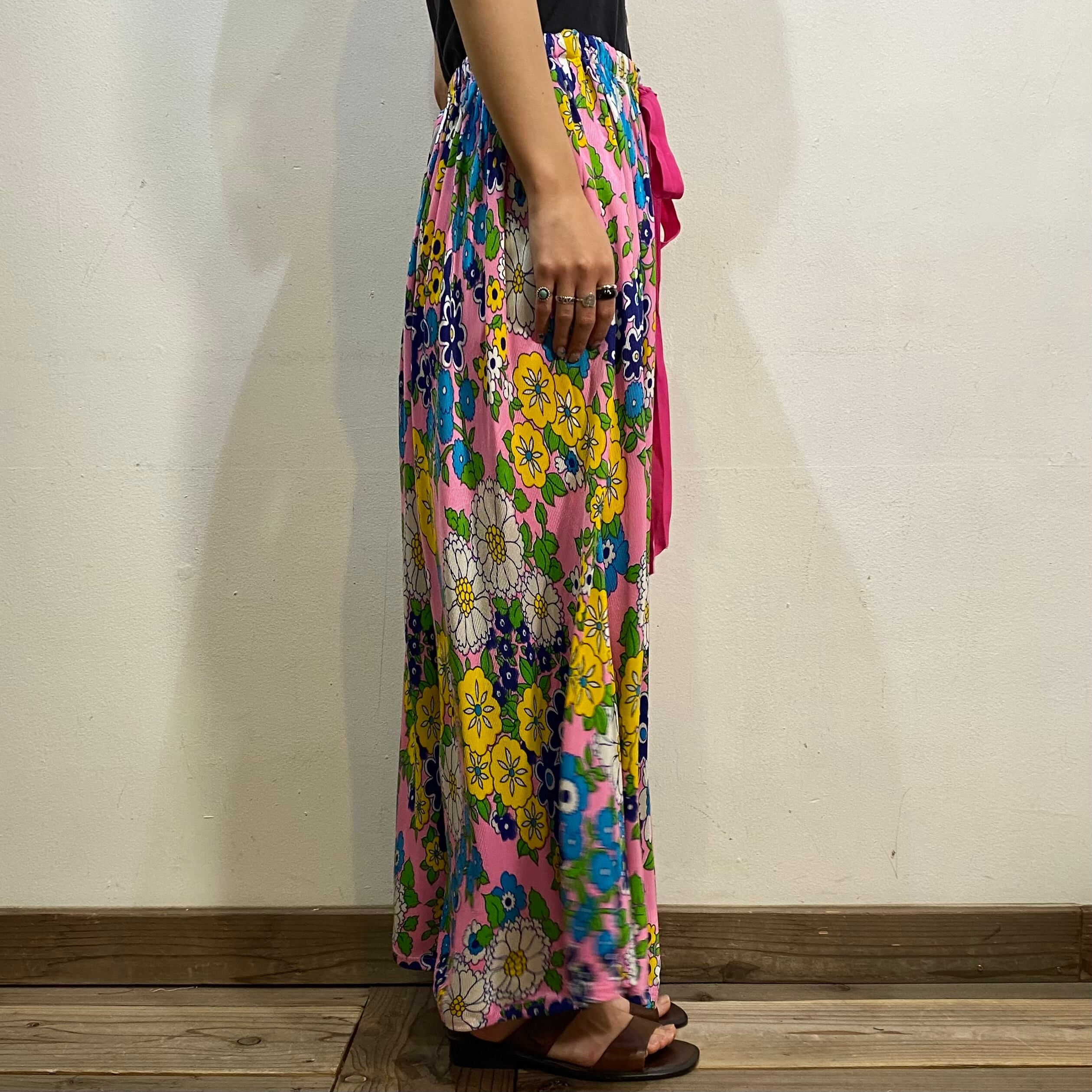 ピンクカラーにイエローやブルーの鮮やかな花柄がとっても可愛い、60~70年代のワイドパンツです。