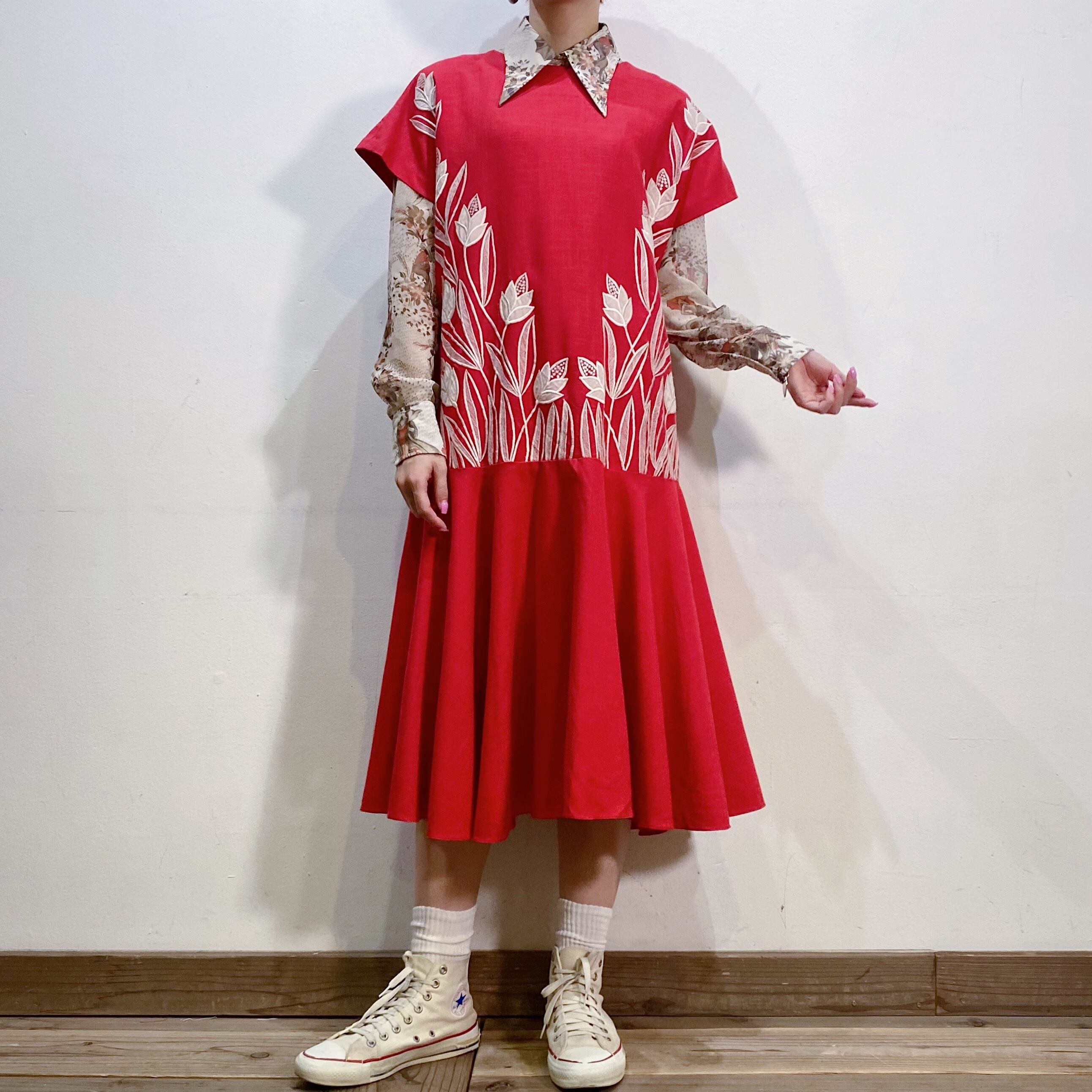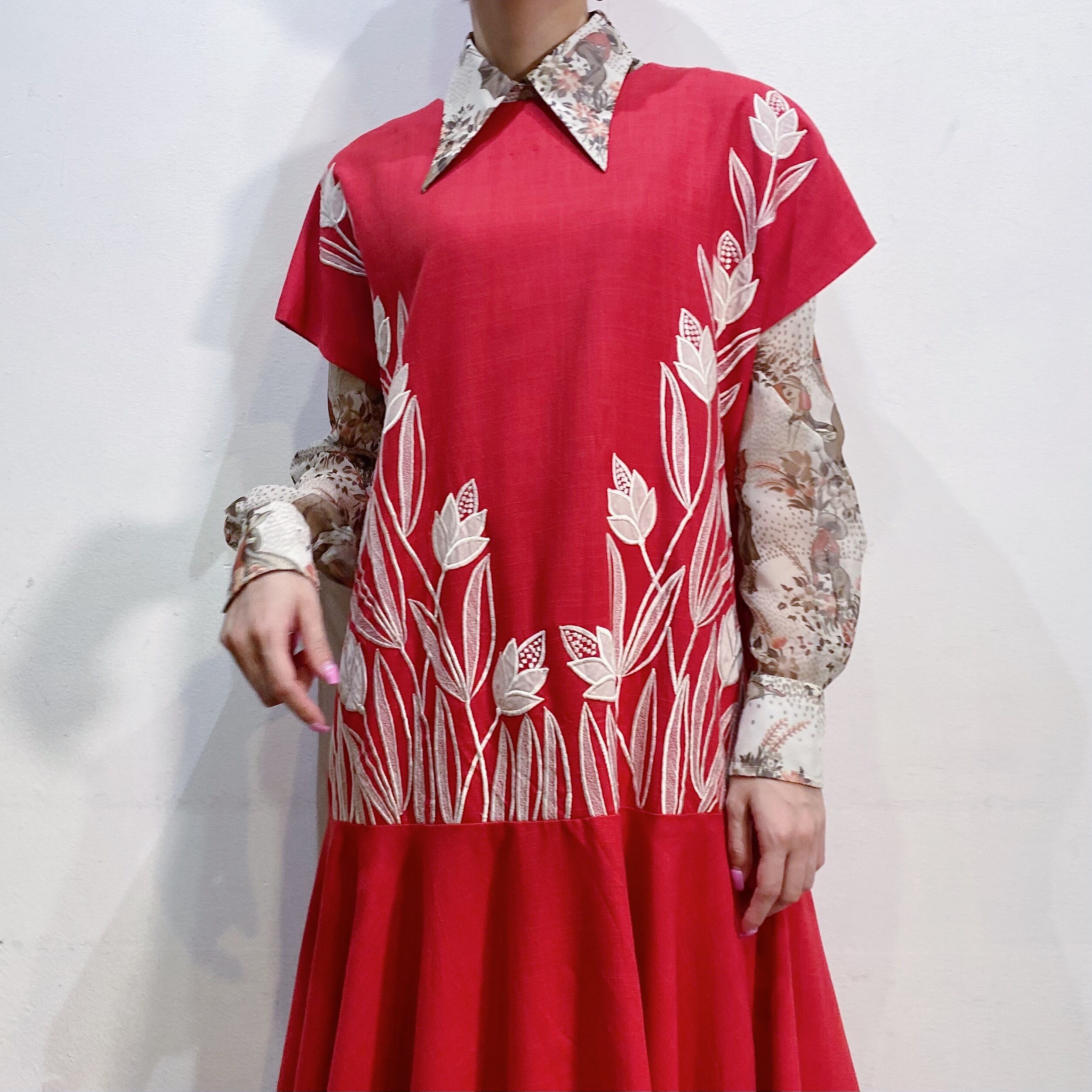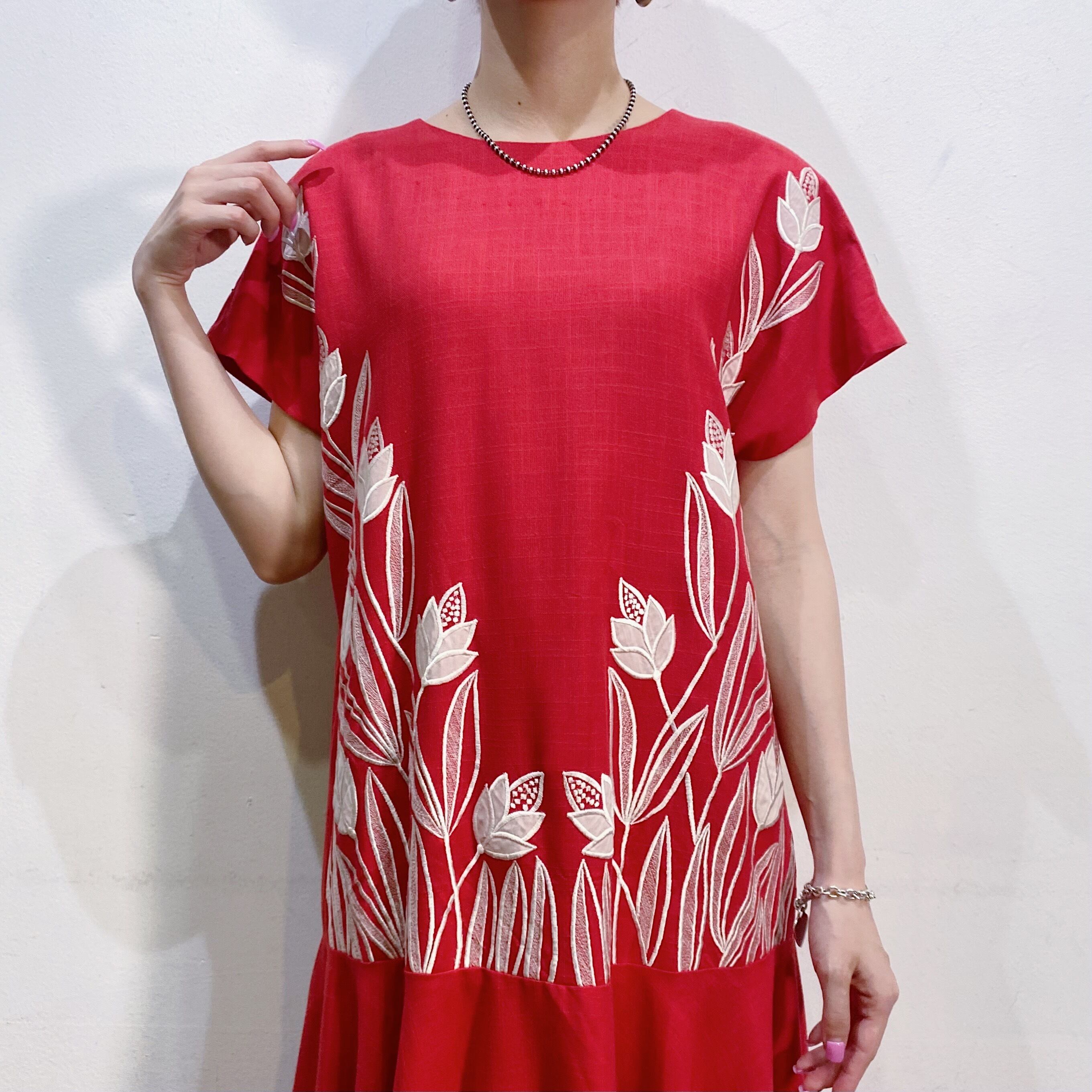 赤に白のお花の刺繍が映える、フィリピンメイドのワンピースです。