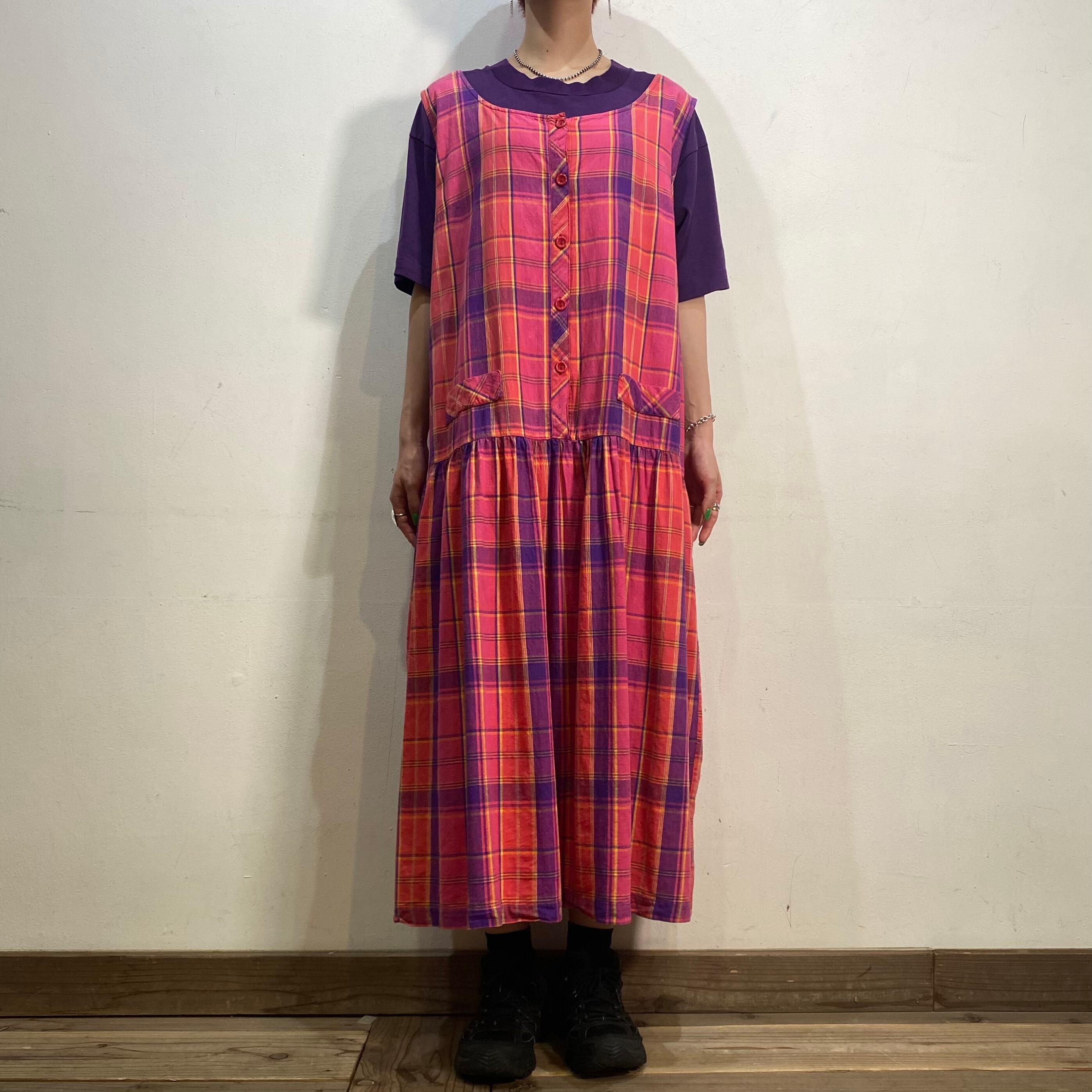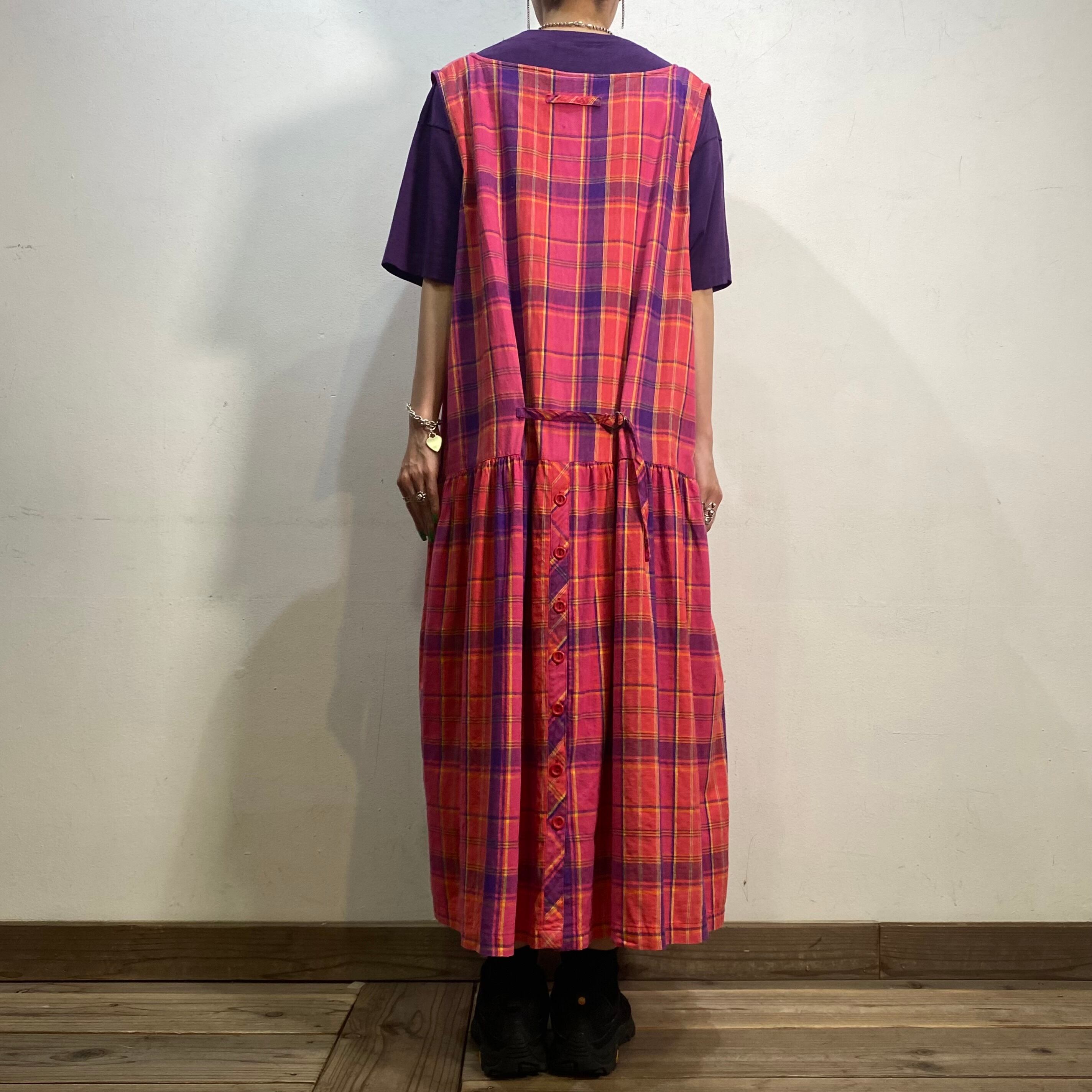 ピンク・パープル・イエローのチェック柄が可愛い、80~90年代のジャンパーワンピースです。