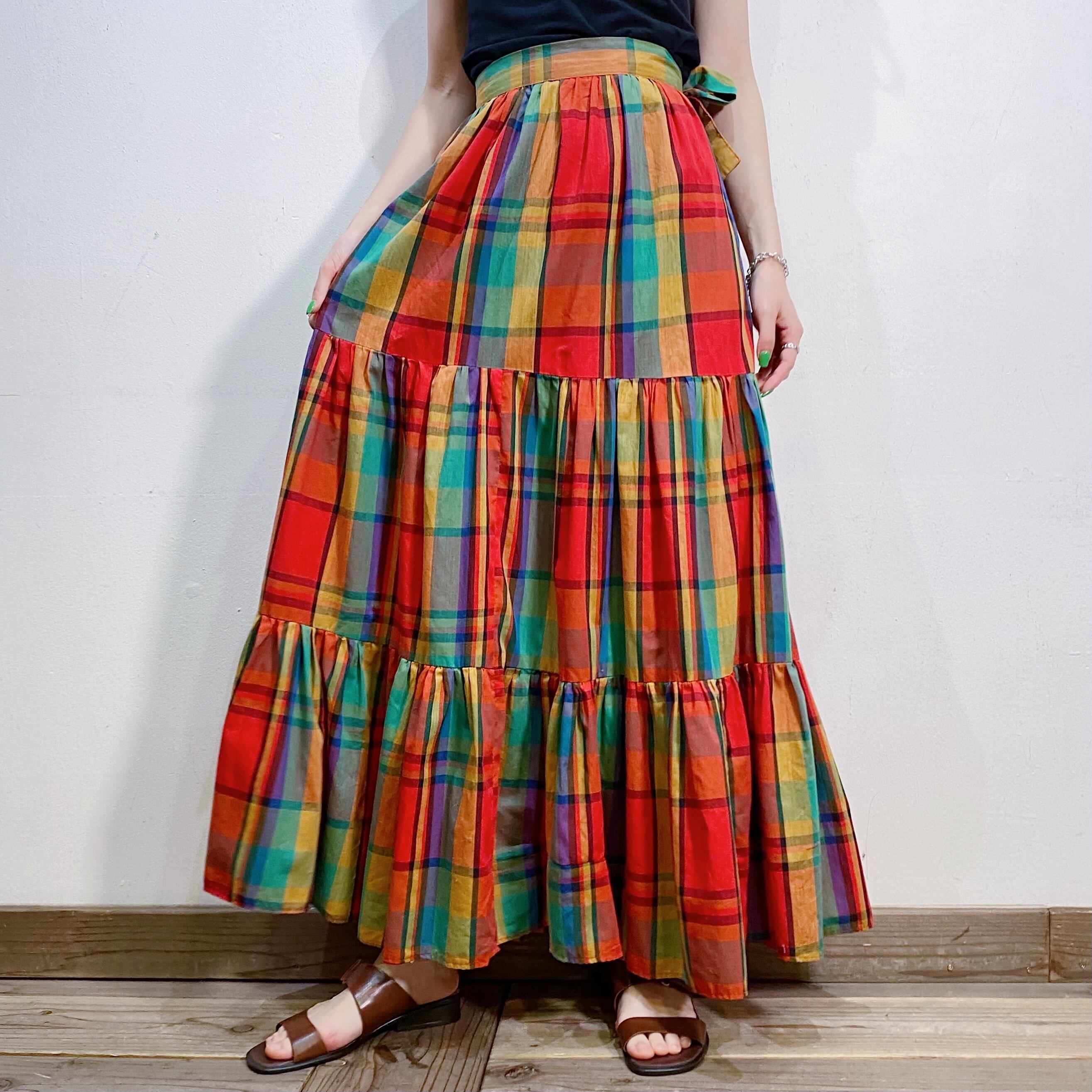 赤黄青緑のカラフルな色合わせが可愛い、チェックスカートです。