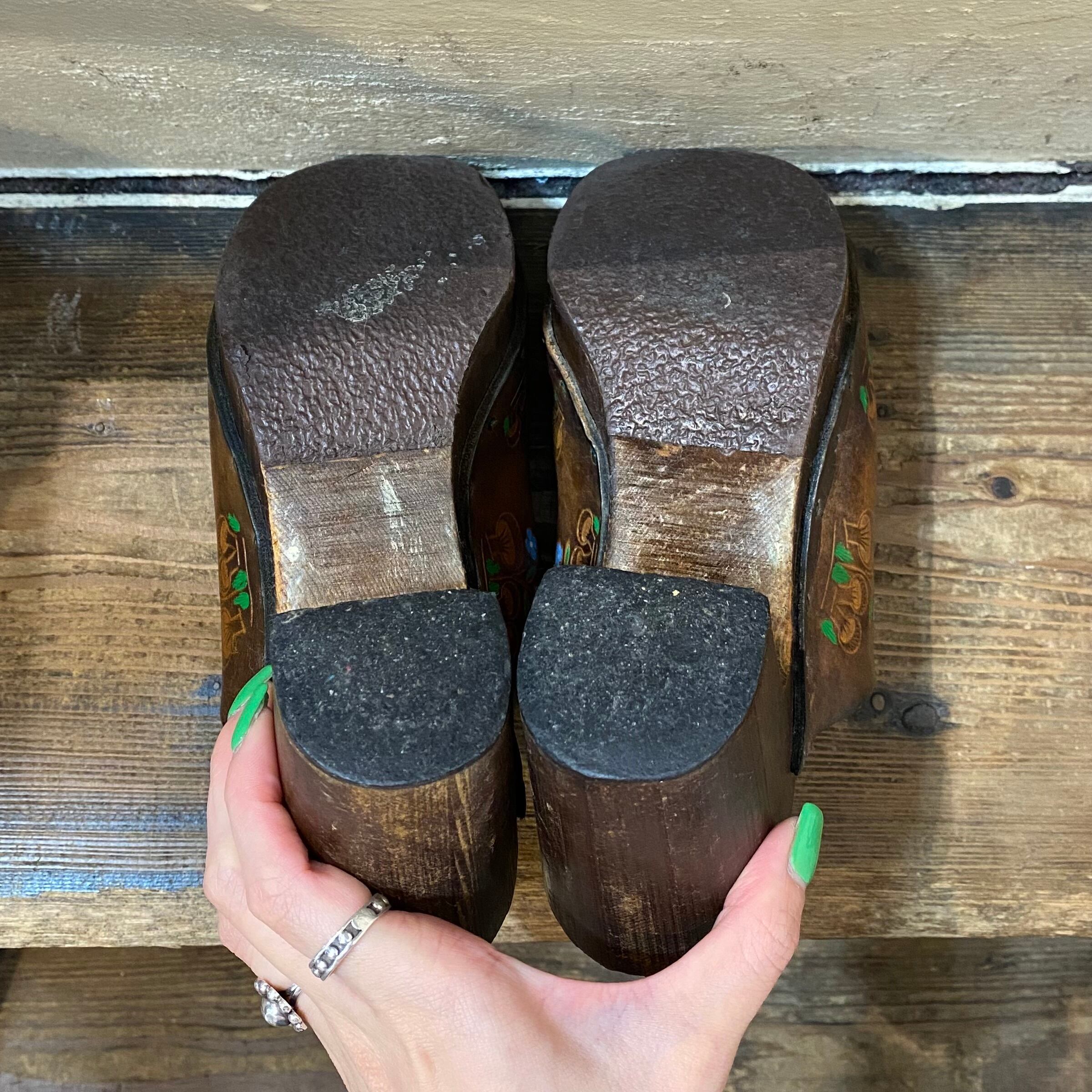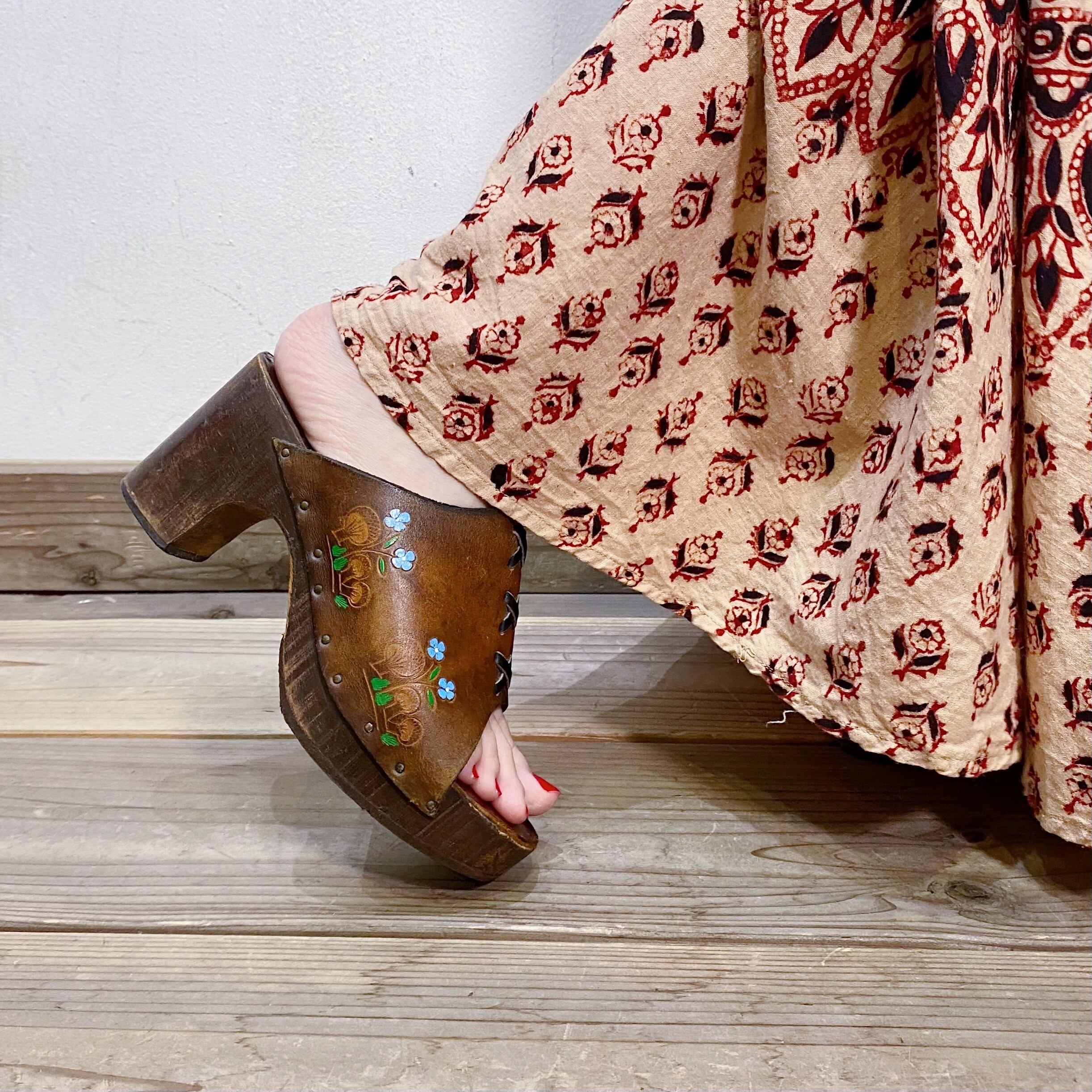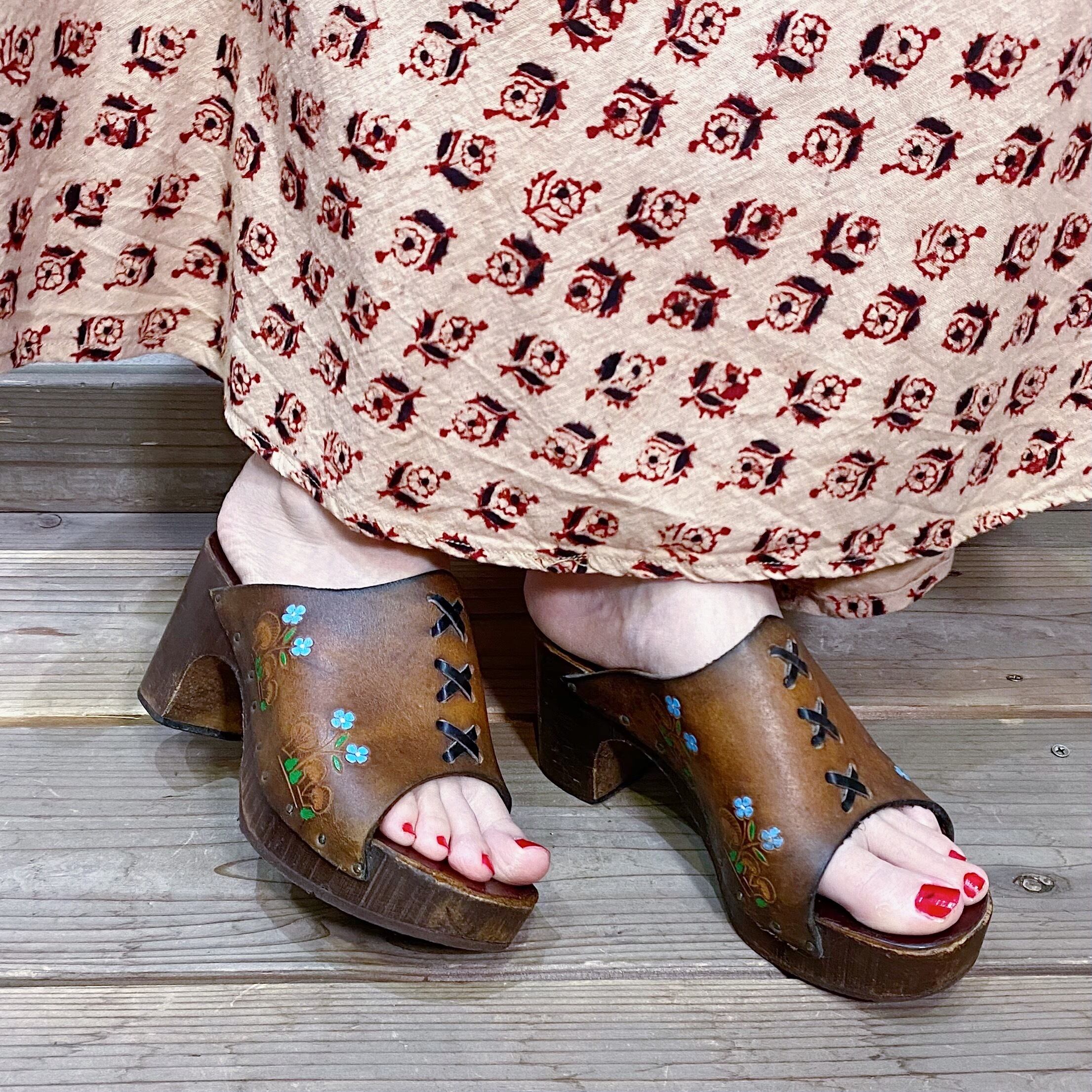 型押しされたキノコとペイントされたお花のモチーフがとっておきに可愛い、60~70年代のサンダルです。