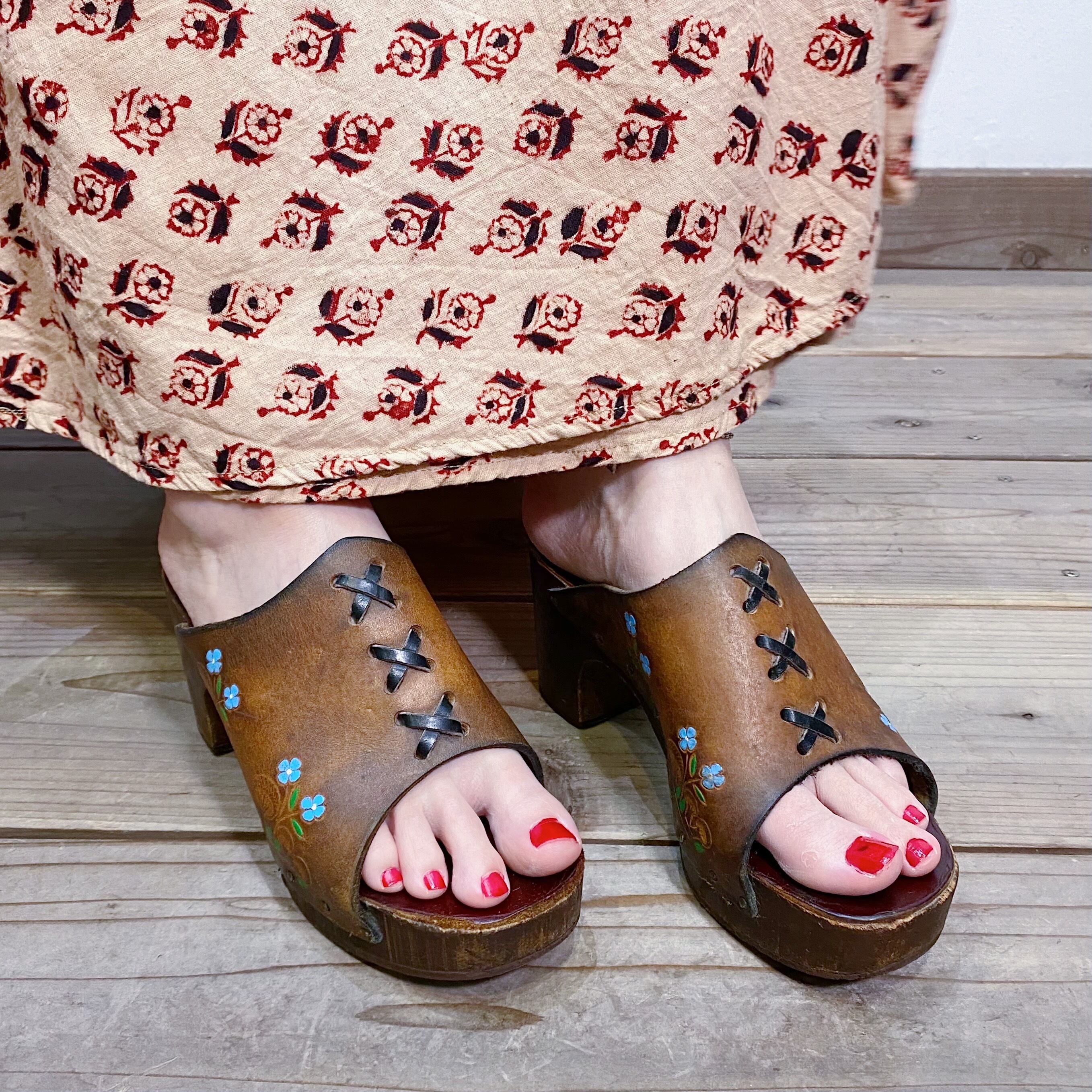 ブラウンカラーでコーディネートに取り入れやすく、レザーとウッドの組み合わせのヒッピームードな一足。
