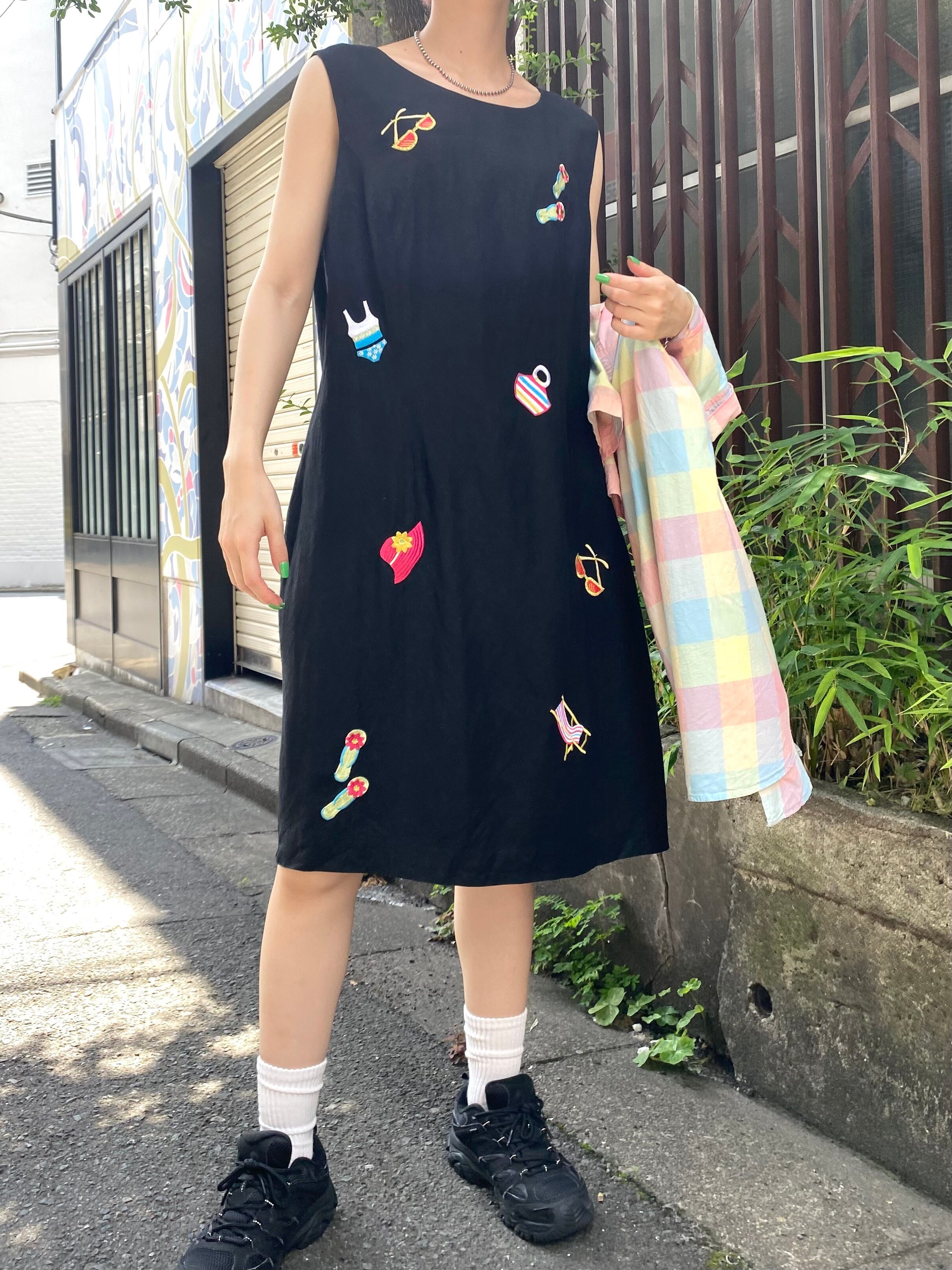 サンダルやサングラスにスイムウェア・ビーチチェアなどのカラフルでポップな刺繍が可愛い、90年代のノースリーブワンピースです。