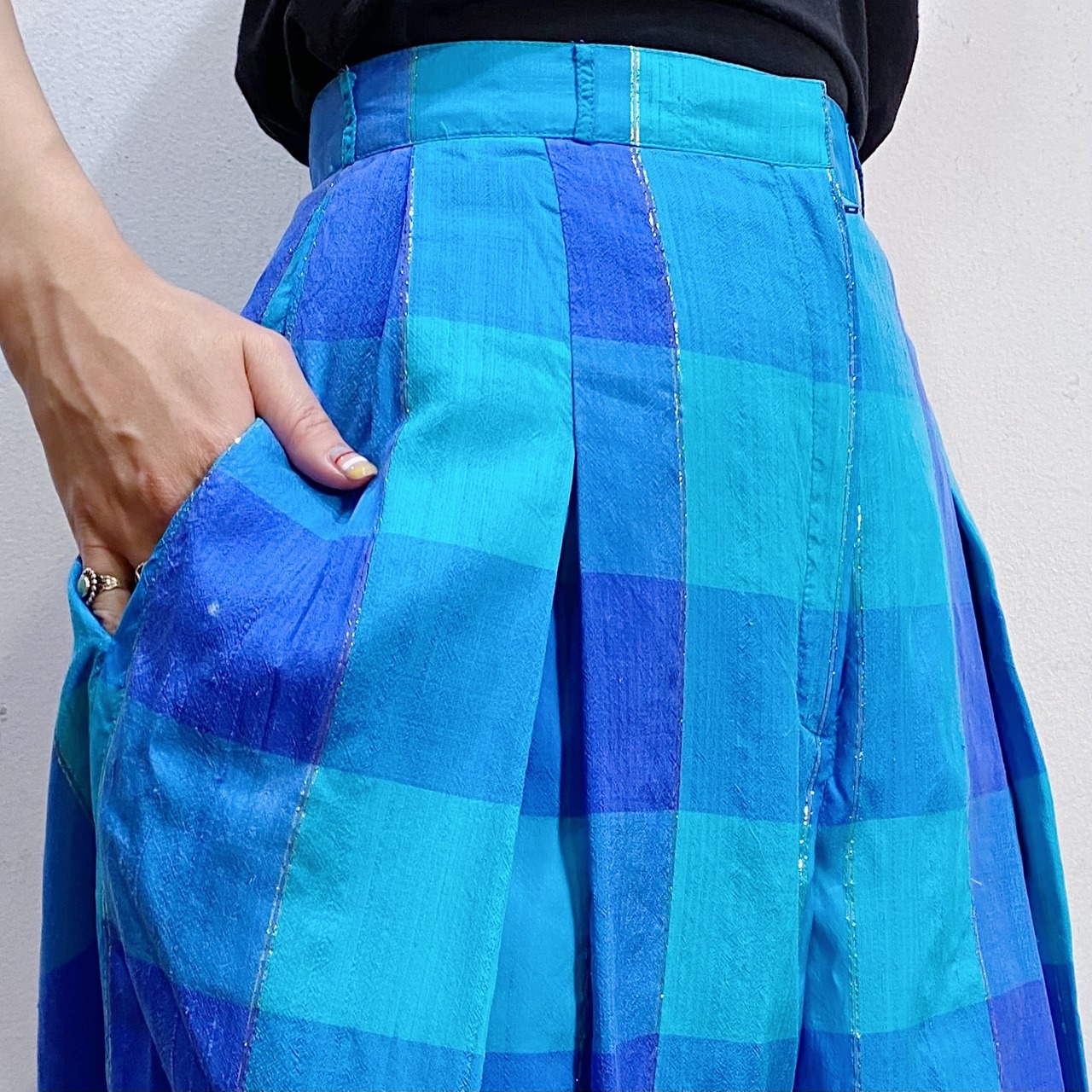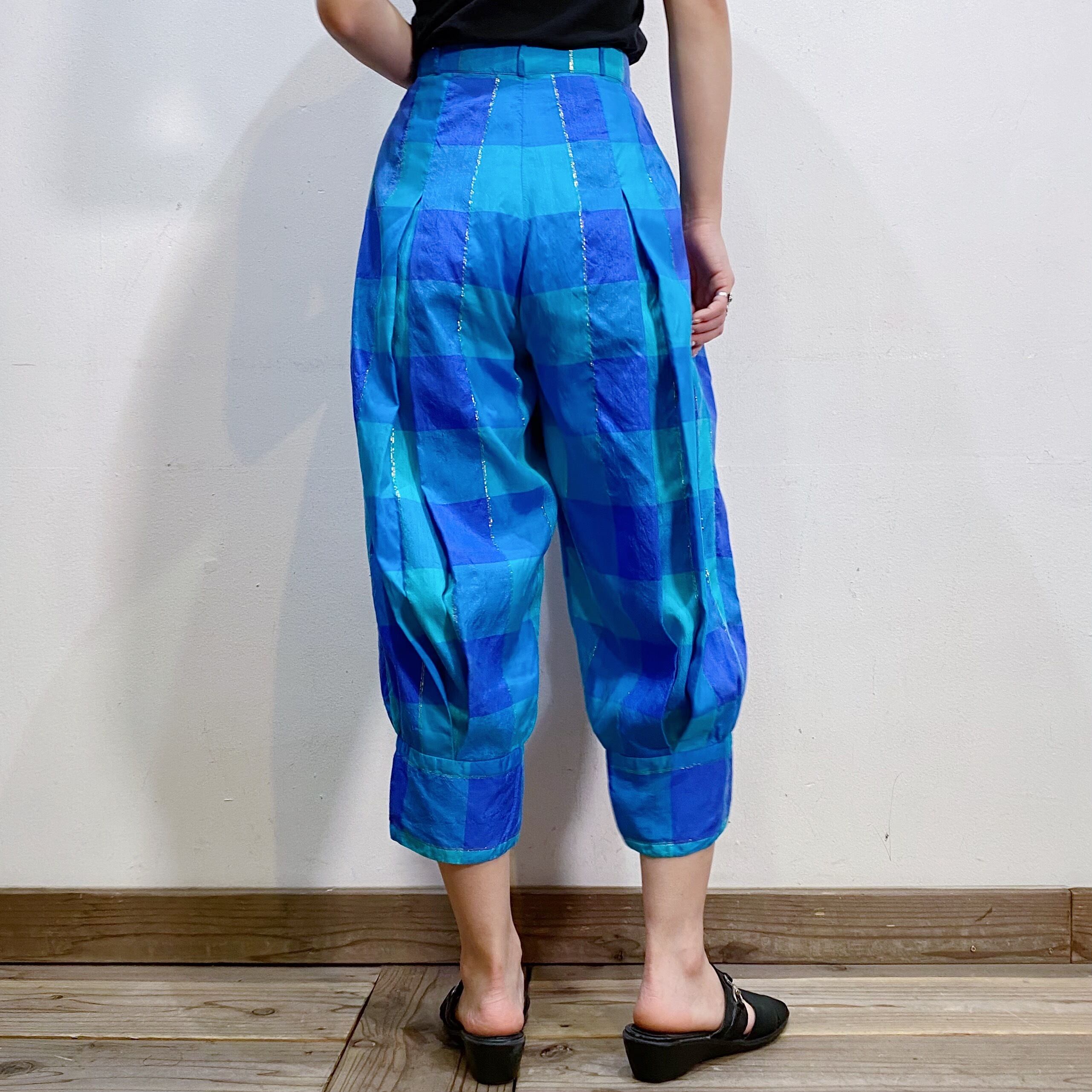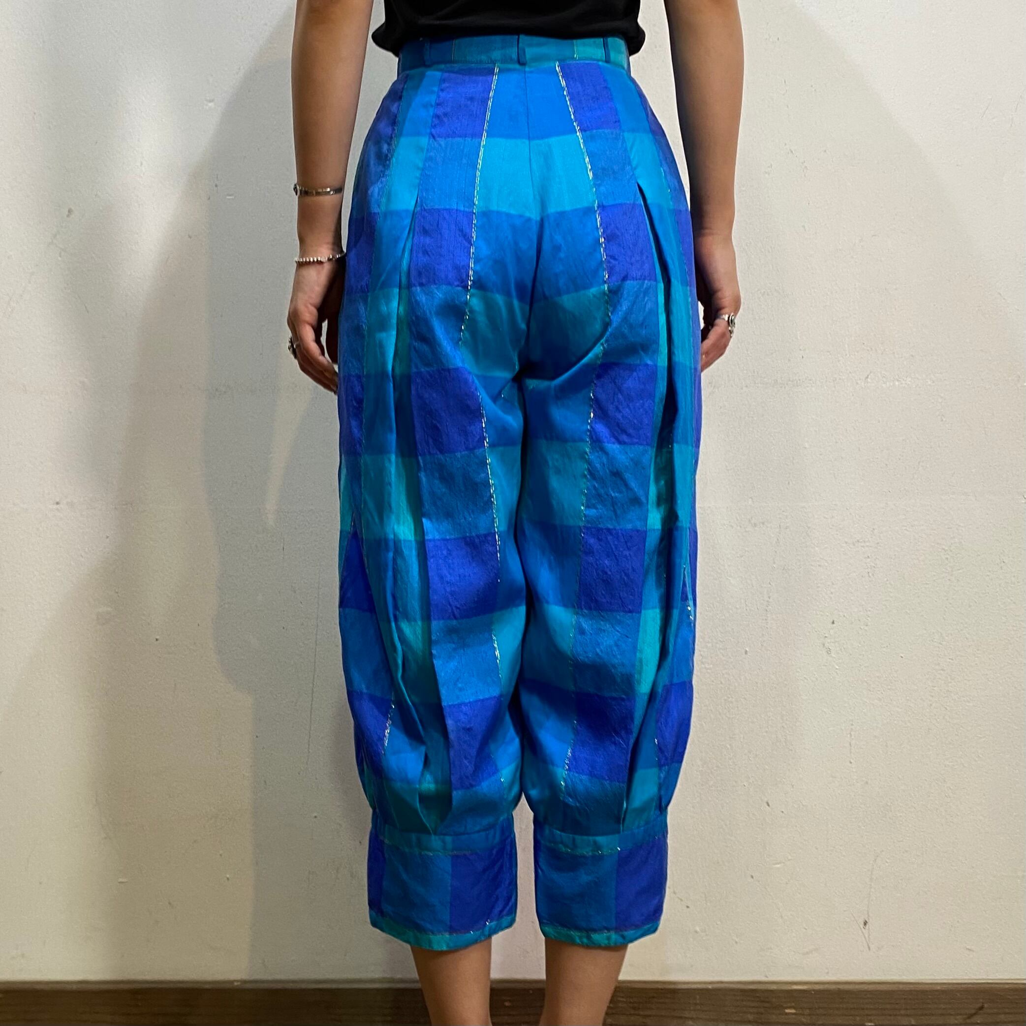 鮮やかなブルーチェックに、ぽわんとユニークなデザインがとっておきに可愛いパンツです。