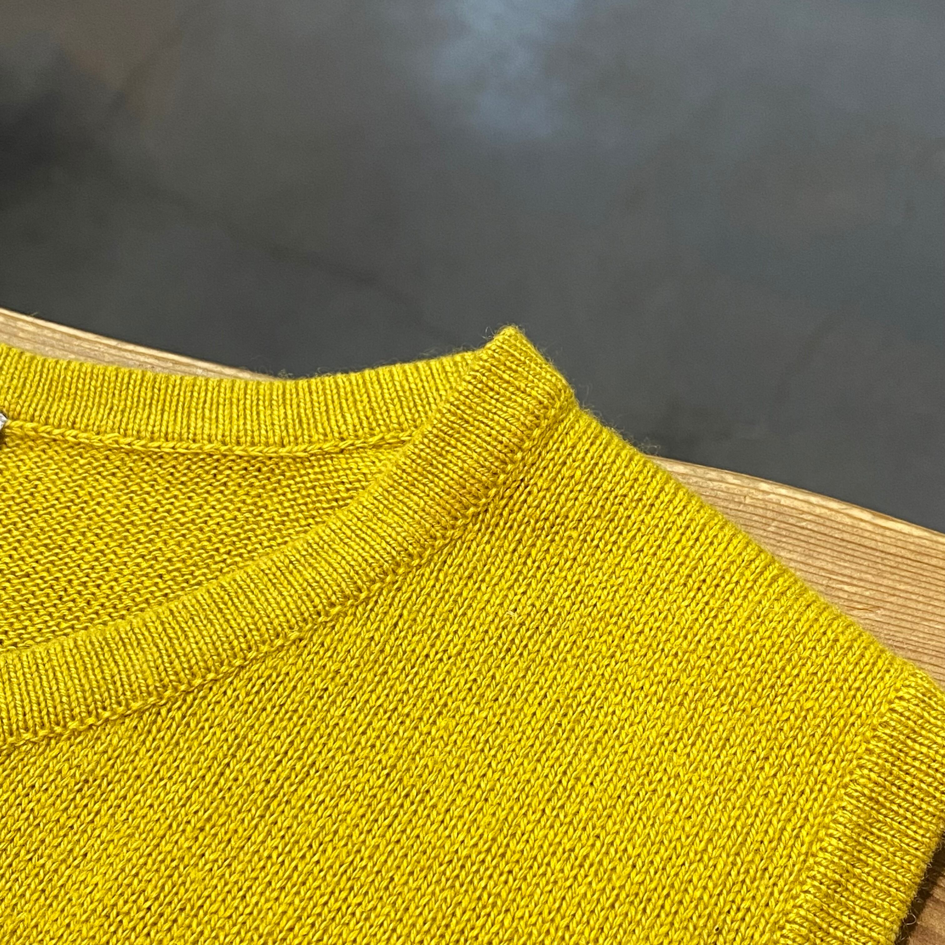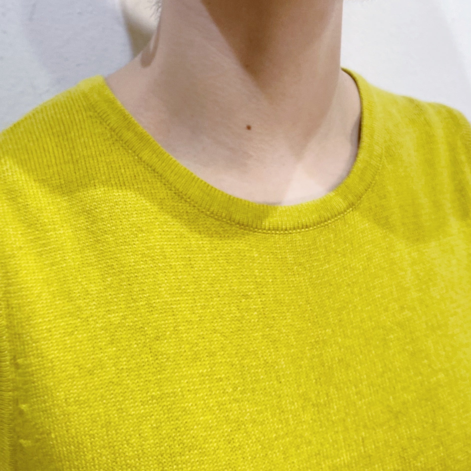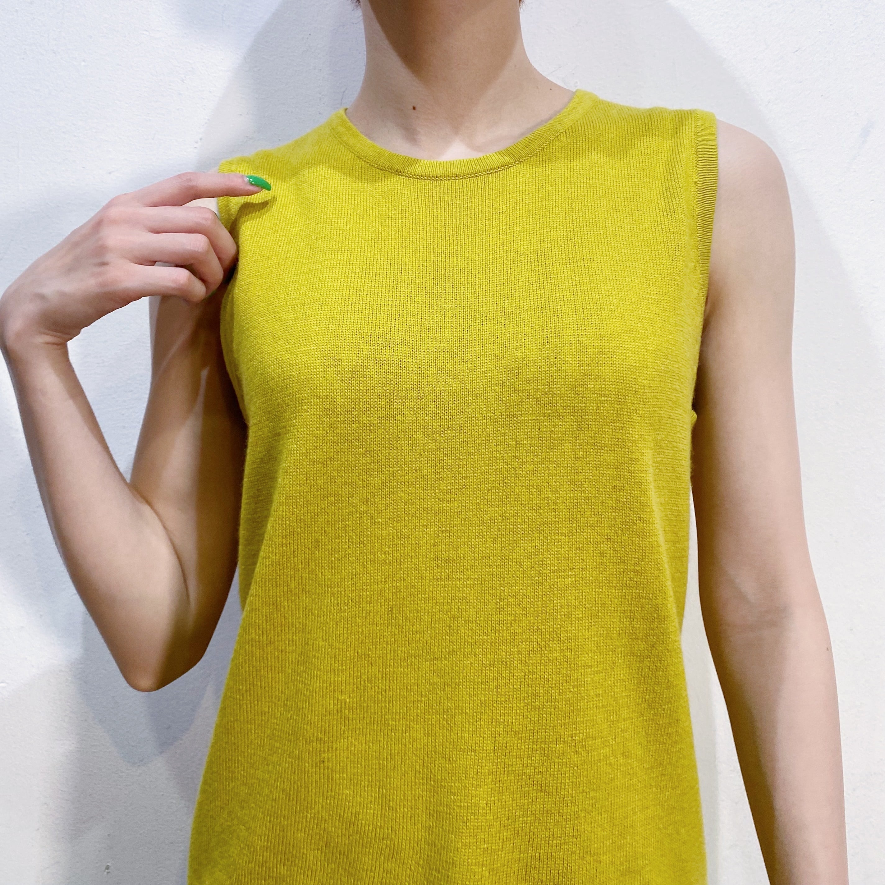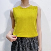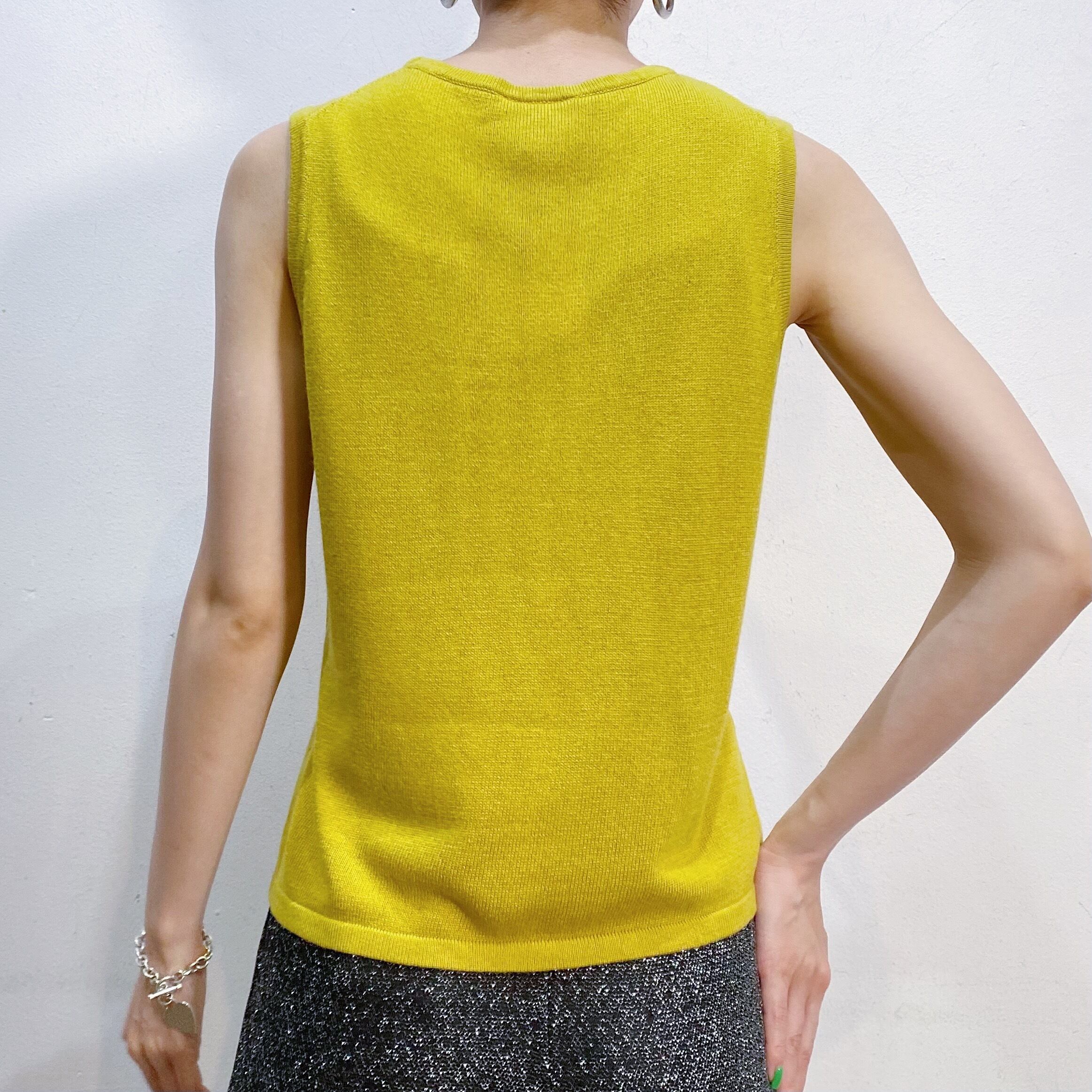 イエローとグリーンの中間のような絶妙な色合いが可愛い、ノースリーブトップスです。