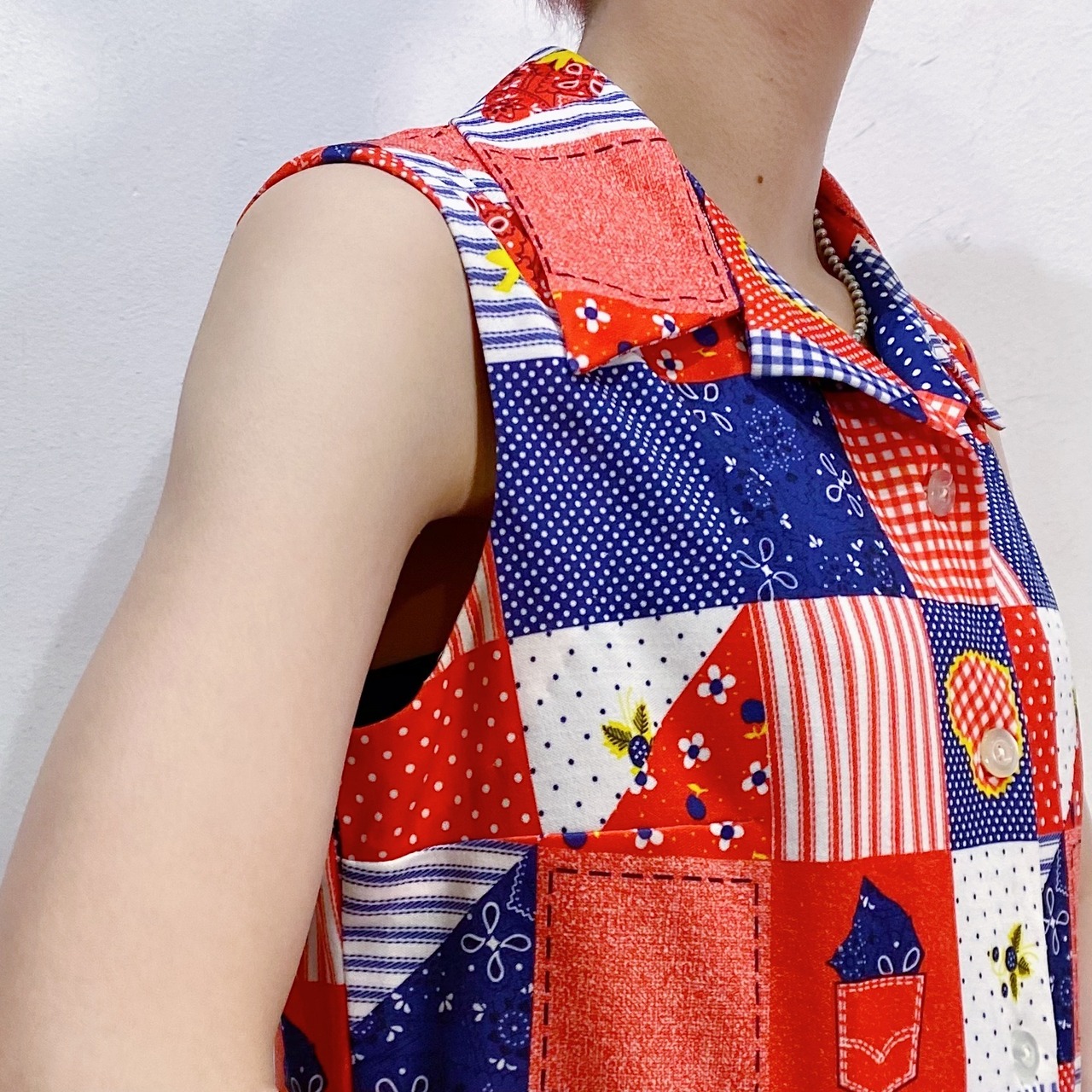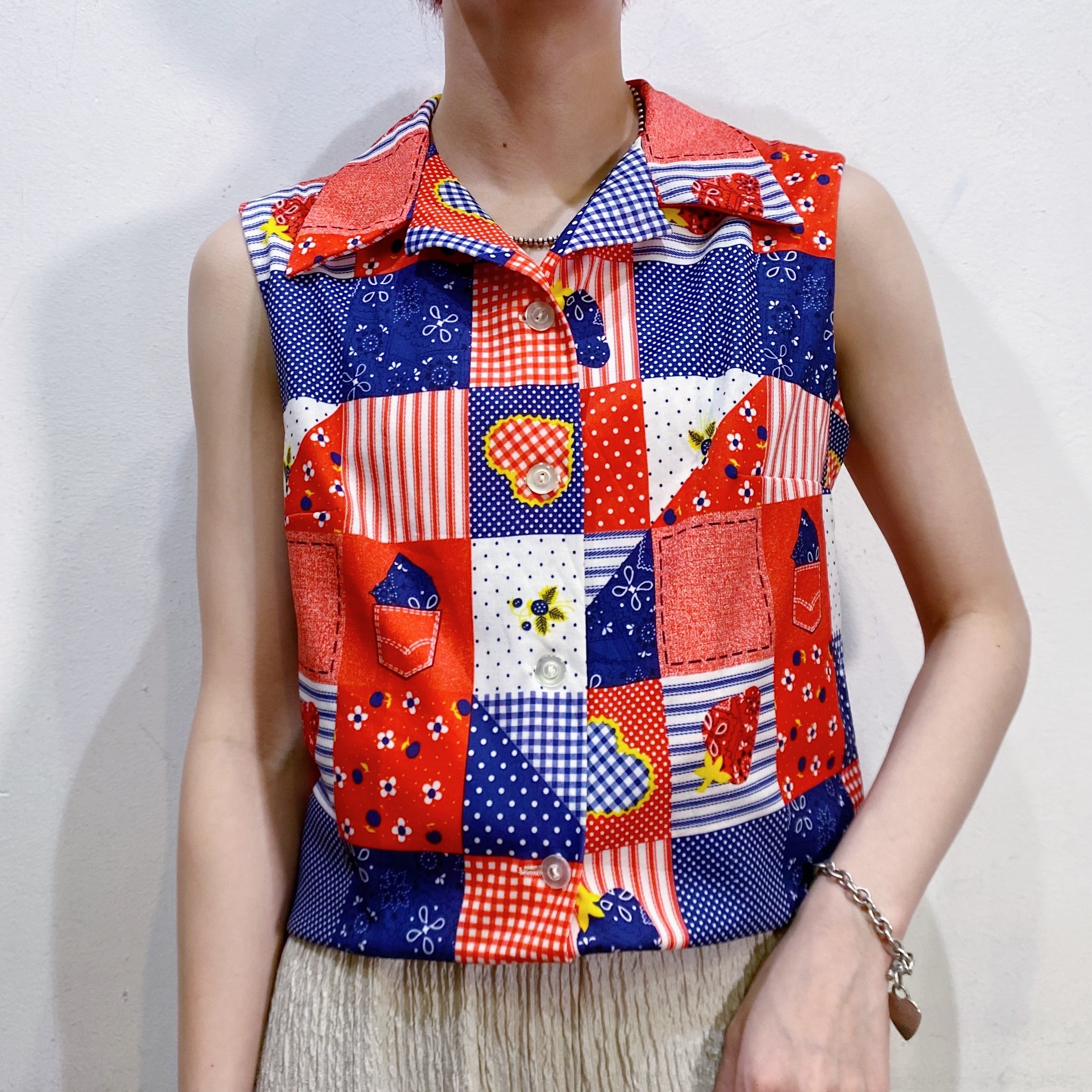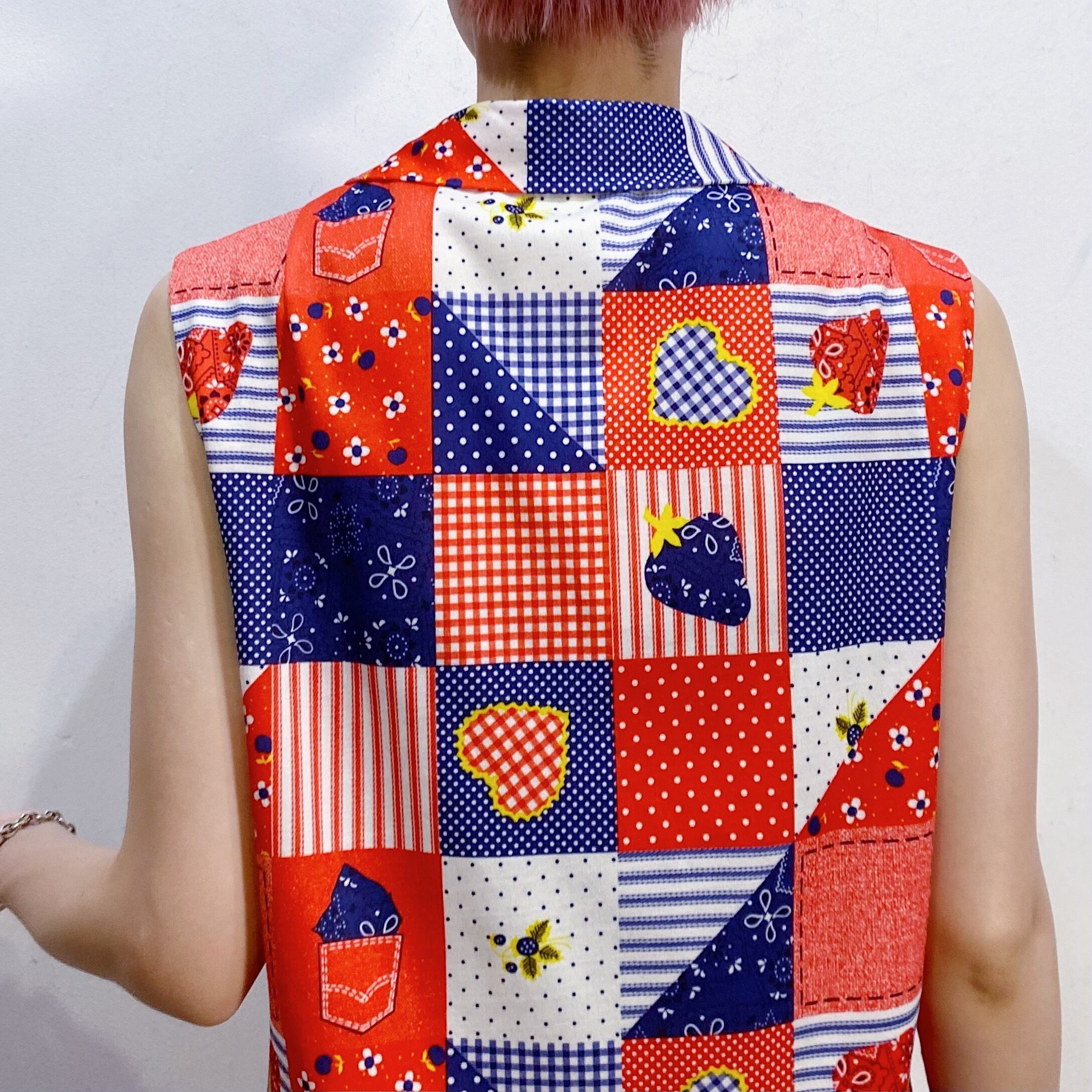 バンダナ柄のイチゴにギンガムのハート・お花やポケットなどの、とっても可愛いテキスタイルのノースリーブシャツです。