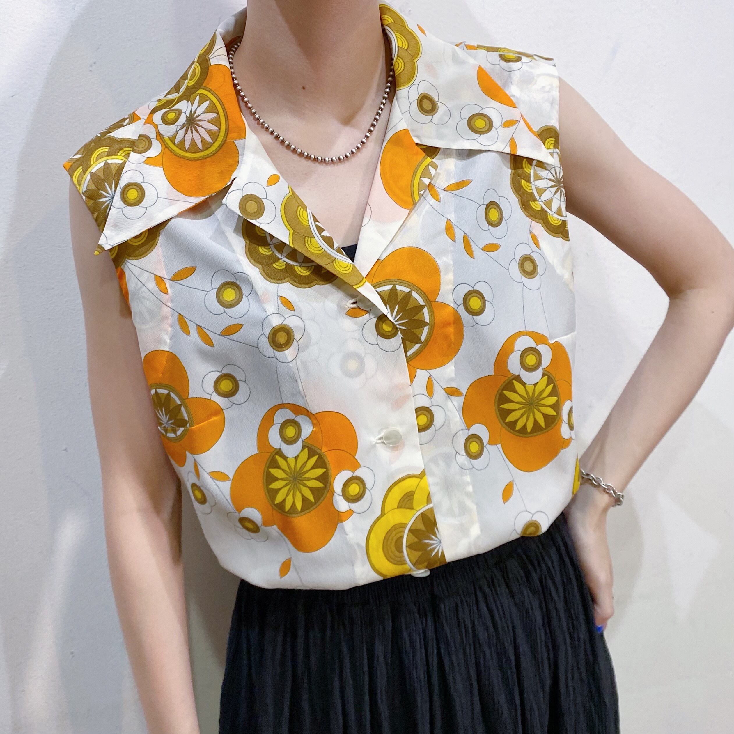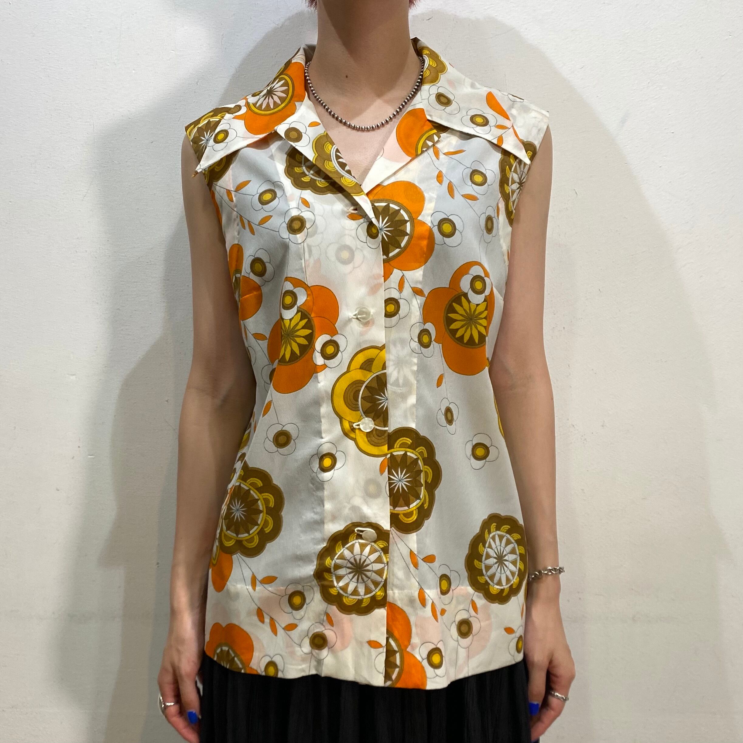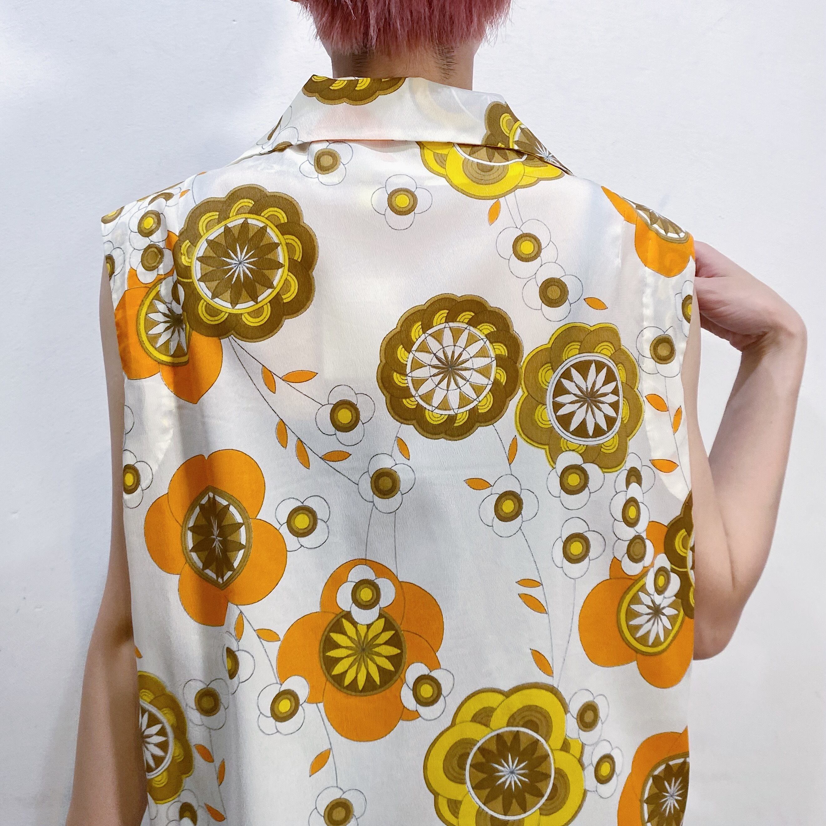ホワイトベースにオレンジやイエローの花柄が可愛い、70年代のノースリーブシャツです。